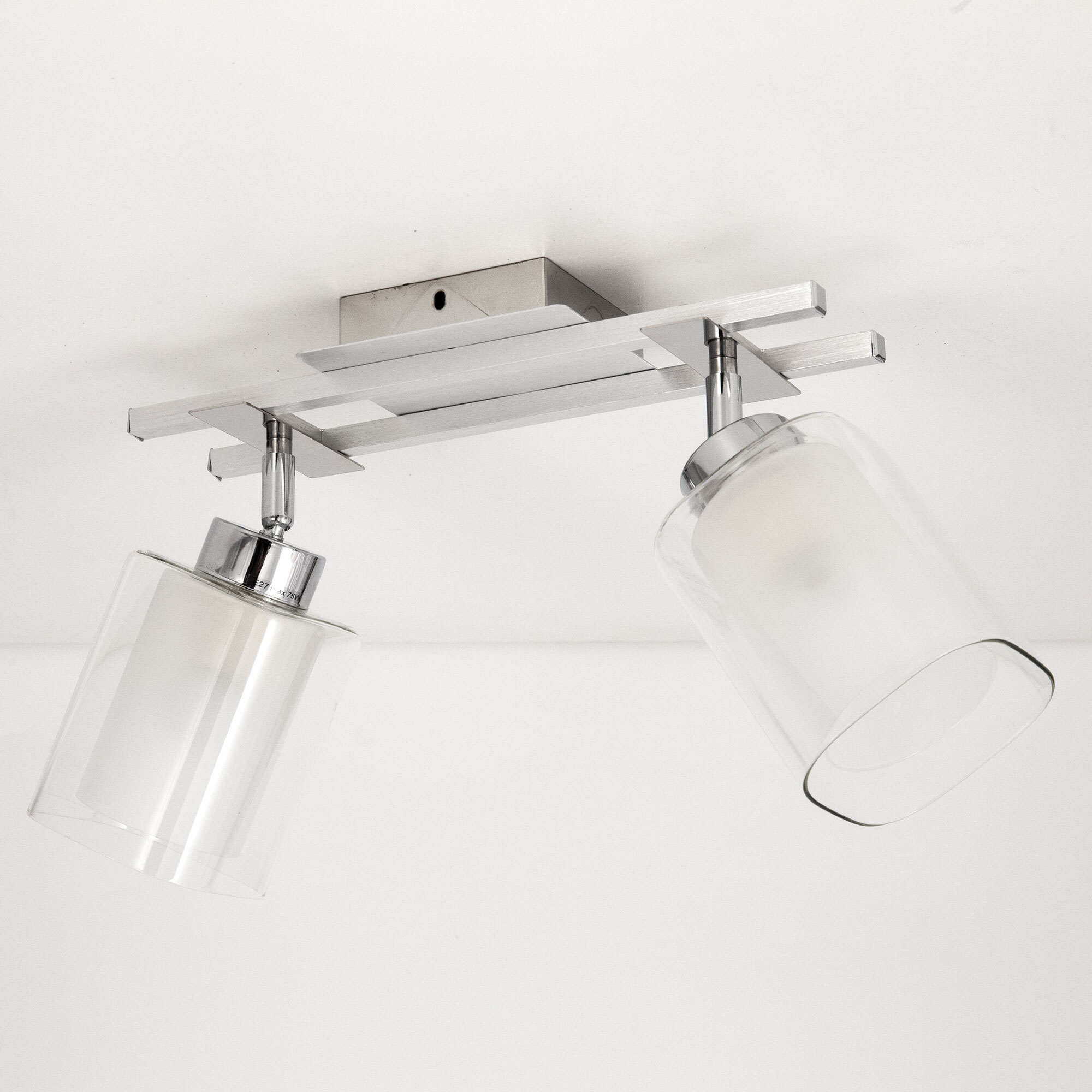 Люстра потолочная двухрожковая Citilux Риволи CL104120 прямоугольной формы с квадратным основанием. Корпус светильника изготовлен из металла, цвет алюминий с декоративными хромированными элементами. Плафоны стеклянные двойные. Внешний плафон прозрачный, в сечении имеет квадратную форму. Внутренний плафон полуматовый в форме цилиндра. Плафоны установлены на поворотные шарниры, что позволяет менять внешний вид светильника и направление света. Тип крепления – планка. В светильнике используется лампы с цоколем E27, максимальная мощность лампы накаливания 75Вт. Площадь освещения около 7 кв. м. Модель отлично подойдет в помещения, оформленные в современном стиле.