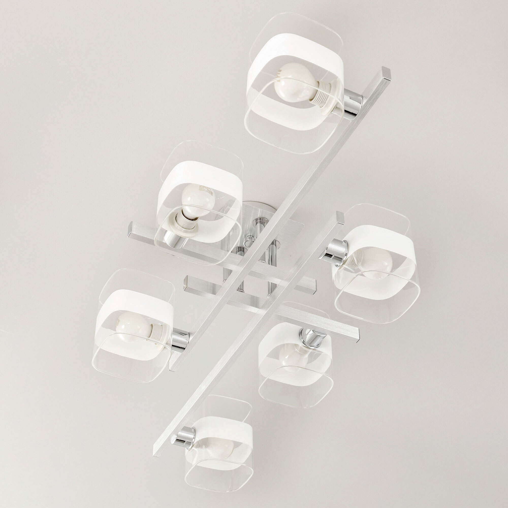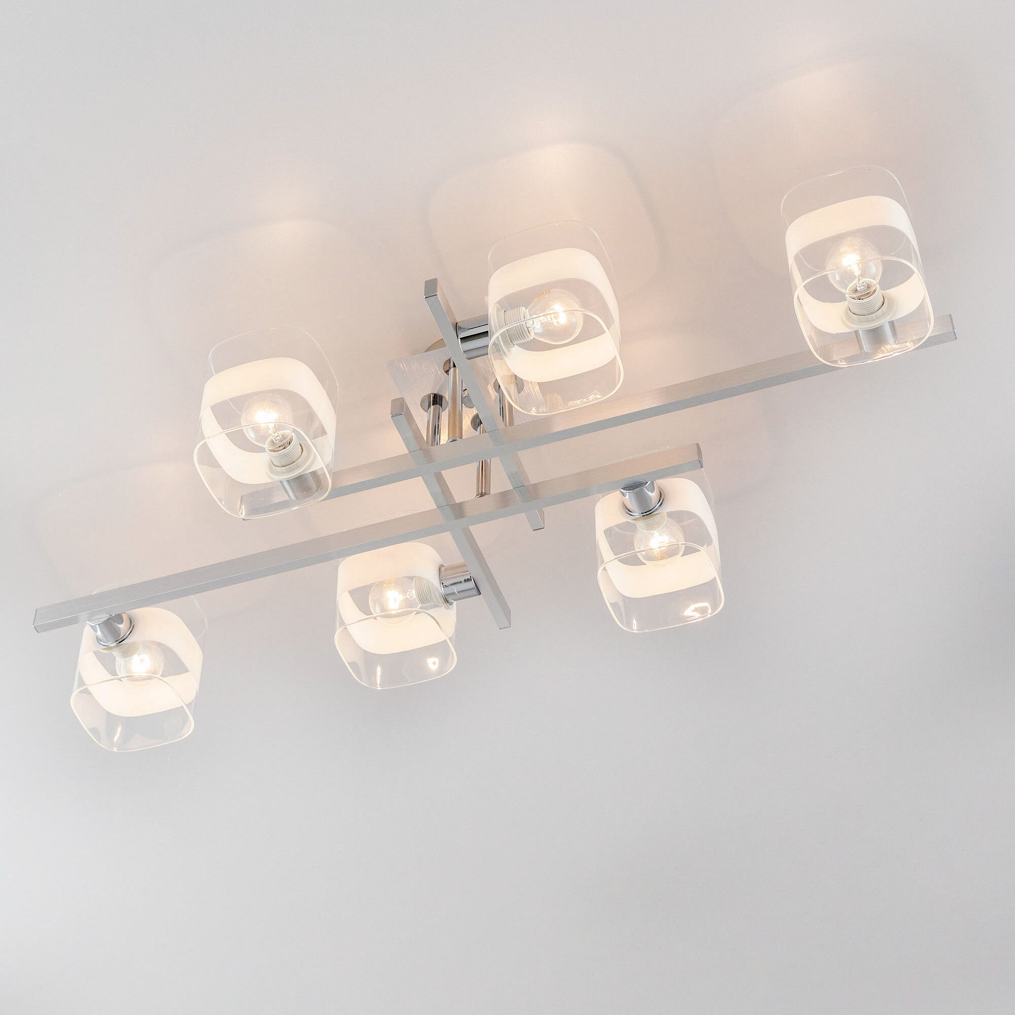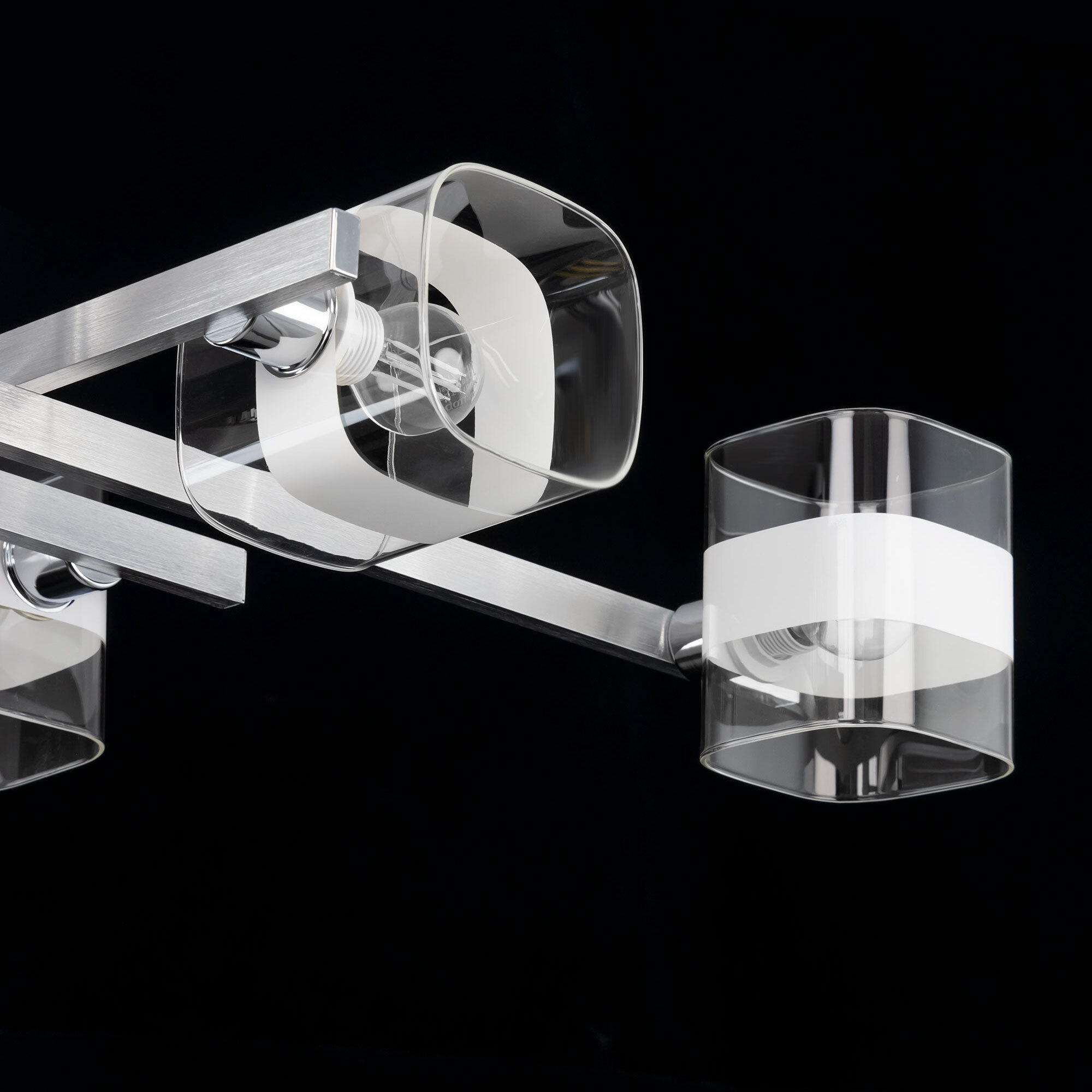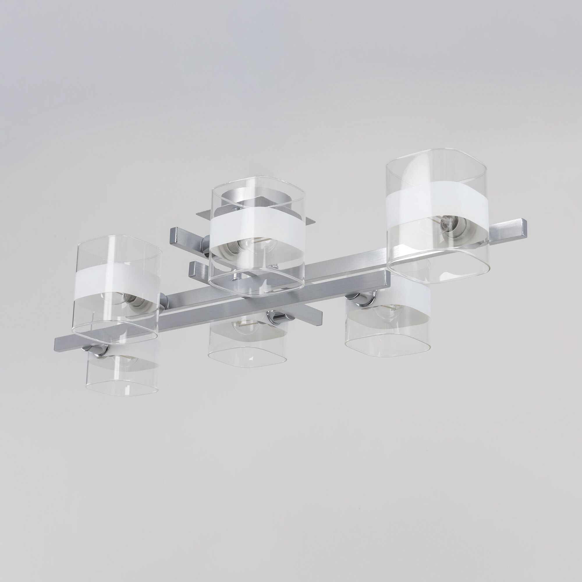 Потолочная люстра Citilux Вирта CL139260 в современном стиле. Корпус металлический, цвет алюминий, с хромированными элементами. Плафоны стеклянные, прозрачные, с декоративной белой полосой. В изделии используются 6 ламп с цоколем Е14, форма колбы шарик, максимальной мощностью для ламп накаливания 60Вт (В комплект не входят, приобретаются отдельно). Светильник можно использовать как с одноклавишным, так и с двухклавишным выключателем. Подходит для всех типов потолков, в том числе натяжных. Люстра шестирожковая, вытянутой формы, размер 86х40см, высота 20см.Citilux CL139 VIRTA: Вдохновение в каждом луче.