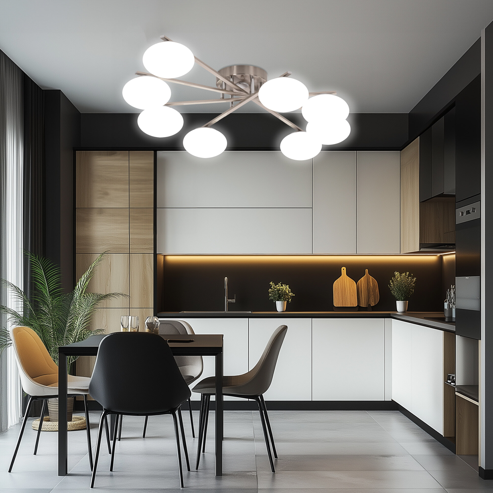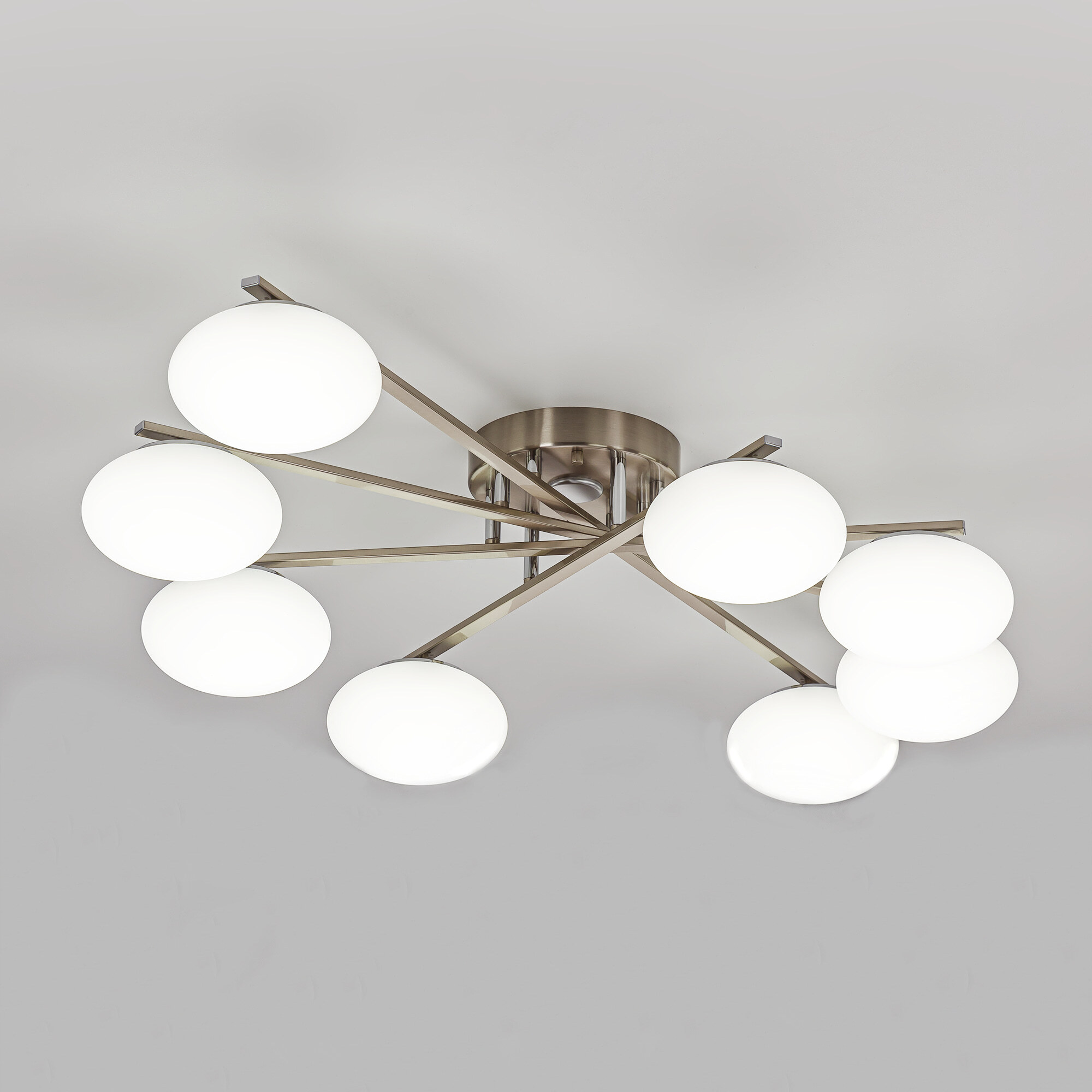 Люстра восьмирожковая с круглым основанием, корпус металлический, цвет матовый хром. Плафоны в форме сфероида изготовлены из матового оптического полимера. В каждом плафоне находится уникальный светодиодный модуль, который обеспечивает яркое основное освещение или красочную RGB-подсветку с плавной регулировкой яркости во всех режимах света.