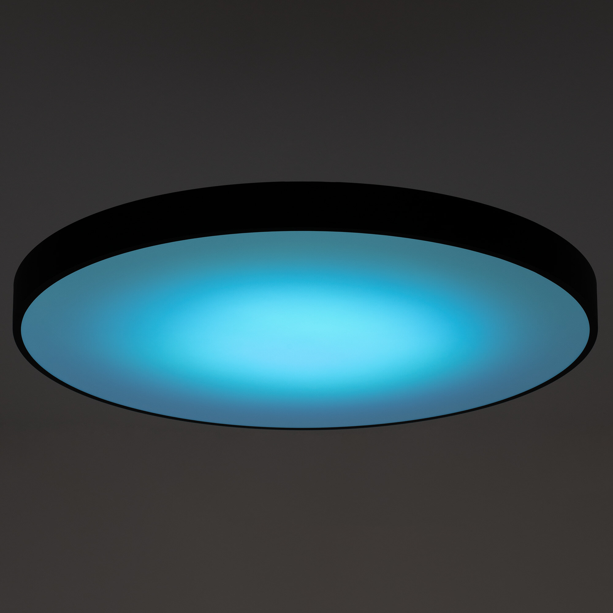 Светодиодный потолочный светильник Citilux Купер CL724155G1 с яркой цветной RGB подсветкой всего плафона. Корпус металлический плоский круглой формы, цвет чёрный матовый, рассеиватель из оптического полимера.