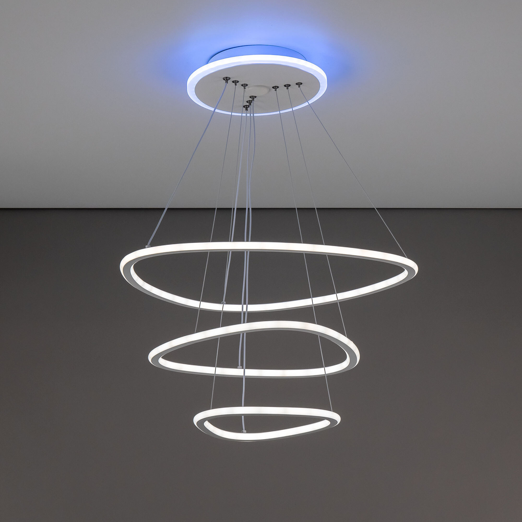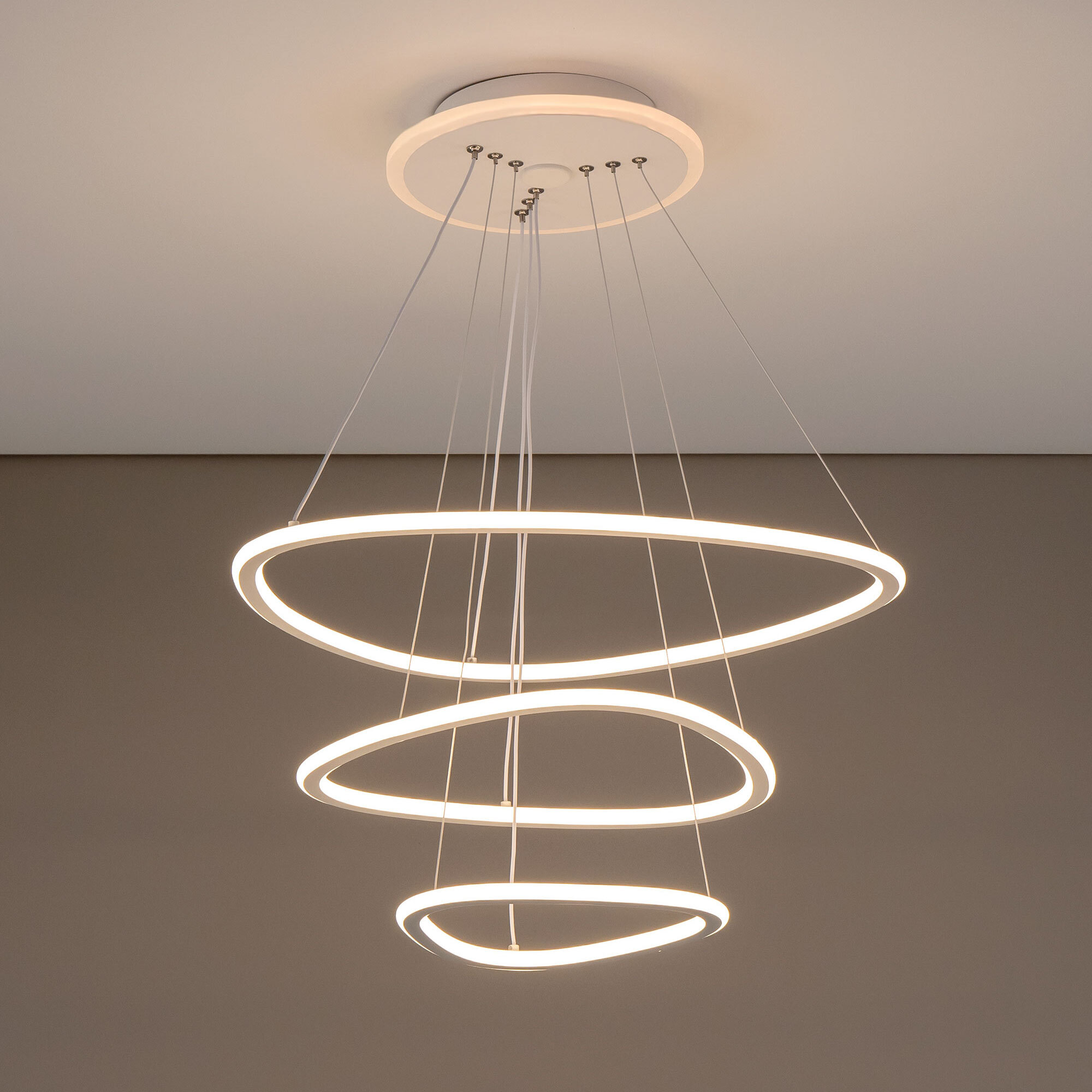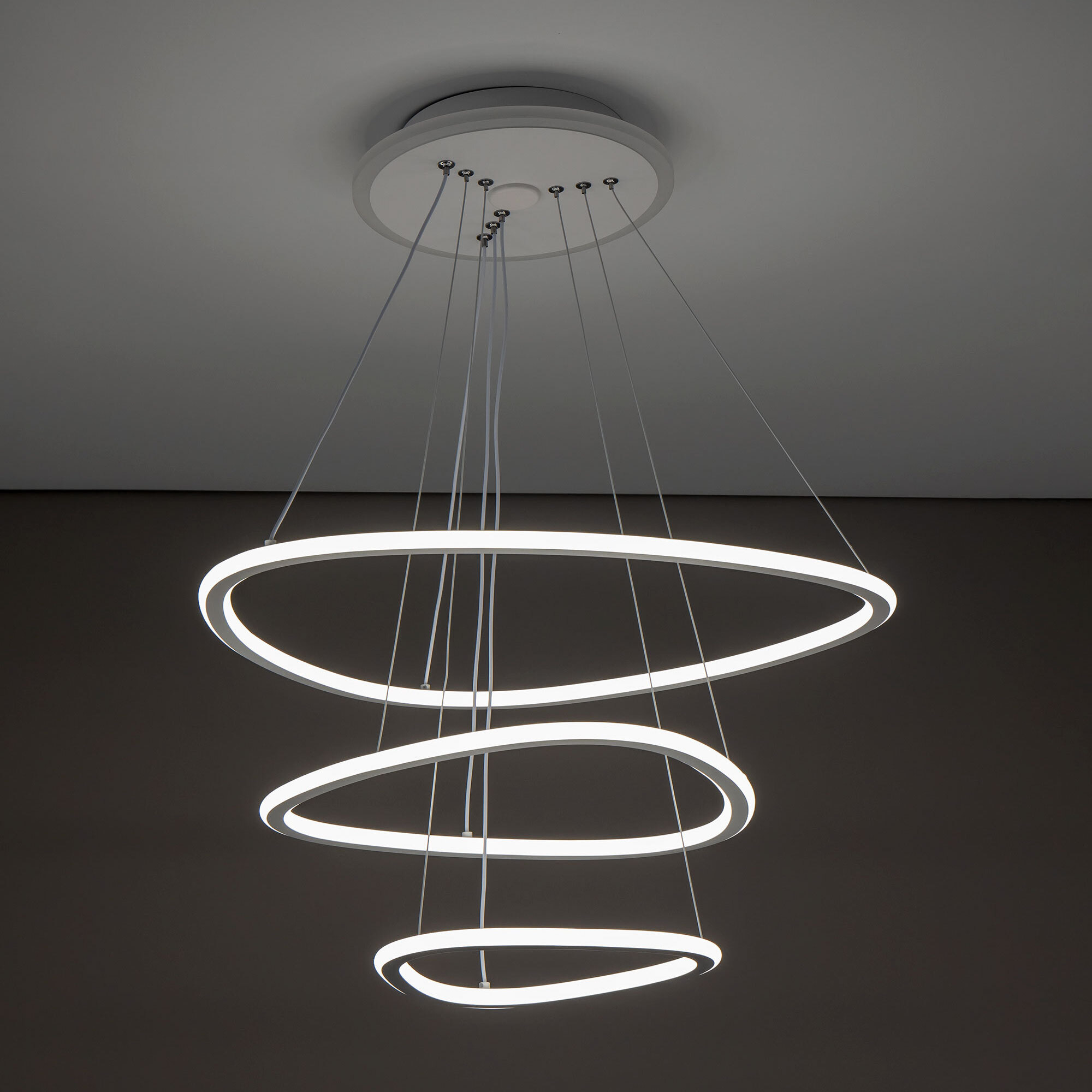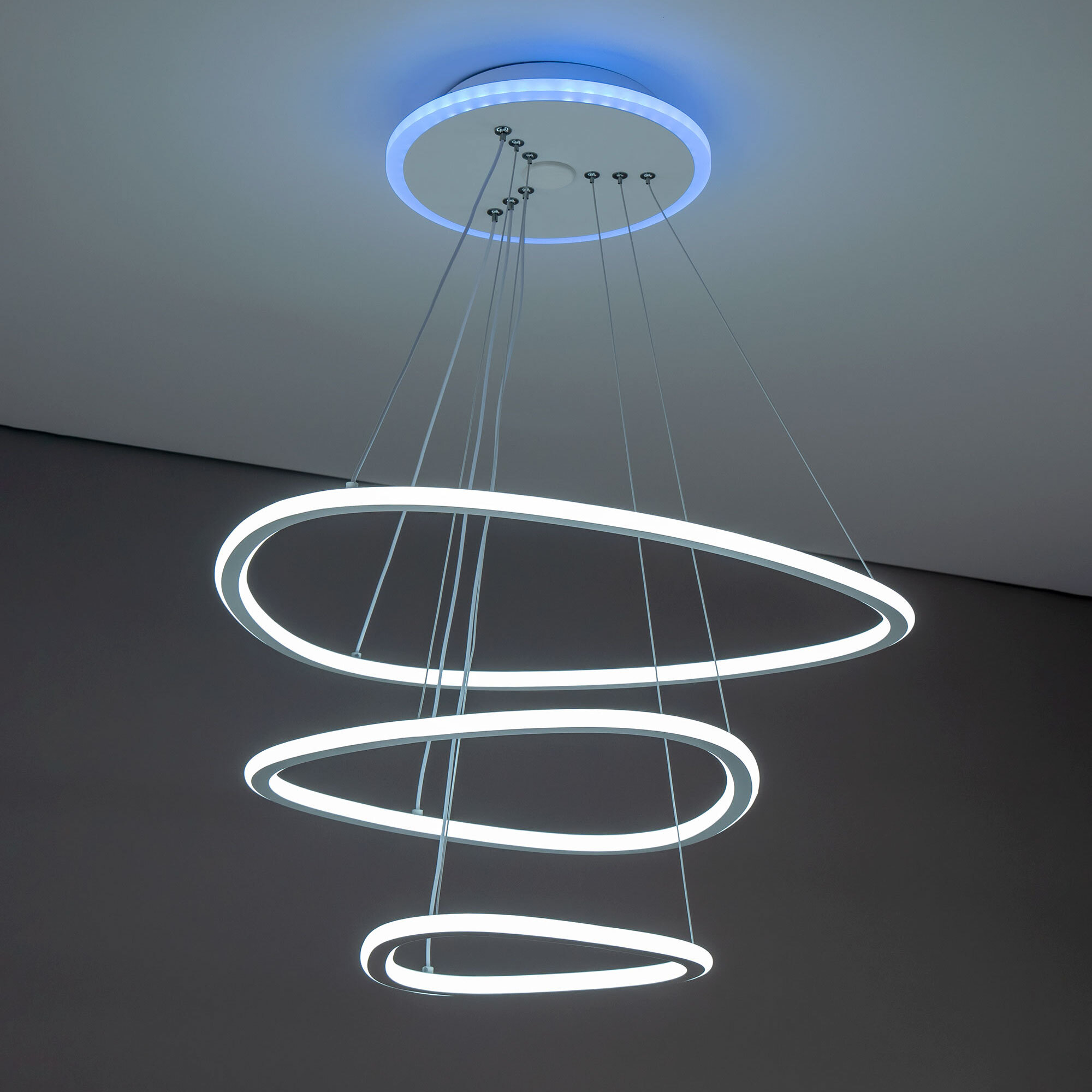 Подвесная светодиодная люстра Citilux Неон Смарт CL731A330E с голосовым управлением, входит в экосистему Citilux SMART. Светильником можно управлять: из приложения на смартфоне по Wi-Fi, при наличии интернета, с помощью голосовых помощников Алиса и Маруся, а также пультом дистанционного управления и настенным выключателем. Люстра на тросах, в форме каскада из трех подвесных колец, высоту и угол наклона каждого из которых можно изменить. Корпус изготовлен из алюминиевого сплава, окрашенного в белый цвет. Рассеиватель оптический полимер, цвет белый матовый. Крепление люстры подходит для всех типов потолков, в том числе натяжных. Тип крепления – планка. Модель оснащена мощными светодиодами, с возможностью плавной регулировки яркости от 10 до 100%. Цветовая температура регулируется в диапазоне от 3000К до 5500К, с возможностью настроить любые оттенки теплого, нейтрального и холодного света. В основании светильника установлена независимая цветная подсветка RGB. Мощность изделия 140Вт, световой поток 7500Лм, площадь освещения до 26м². Пульт ДУ в комплекте, тип батареек ААА (батарейками не комплектуется).