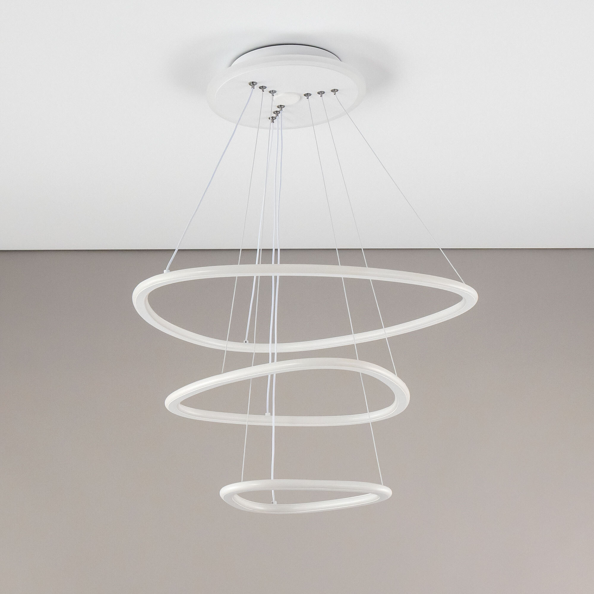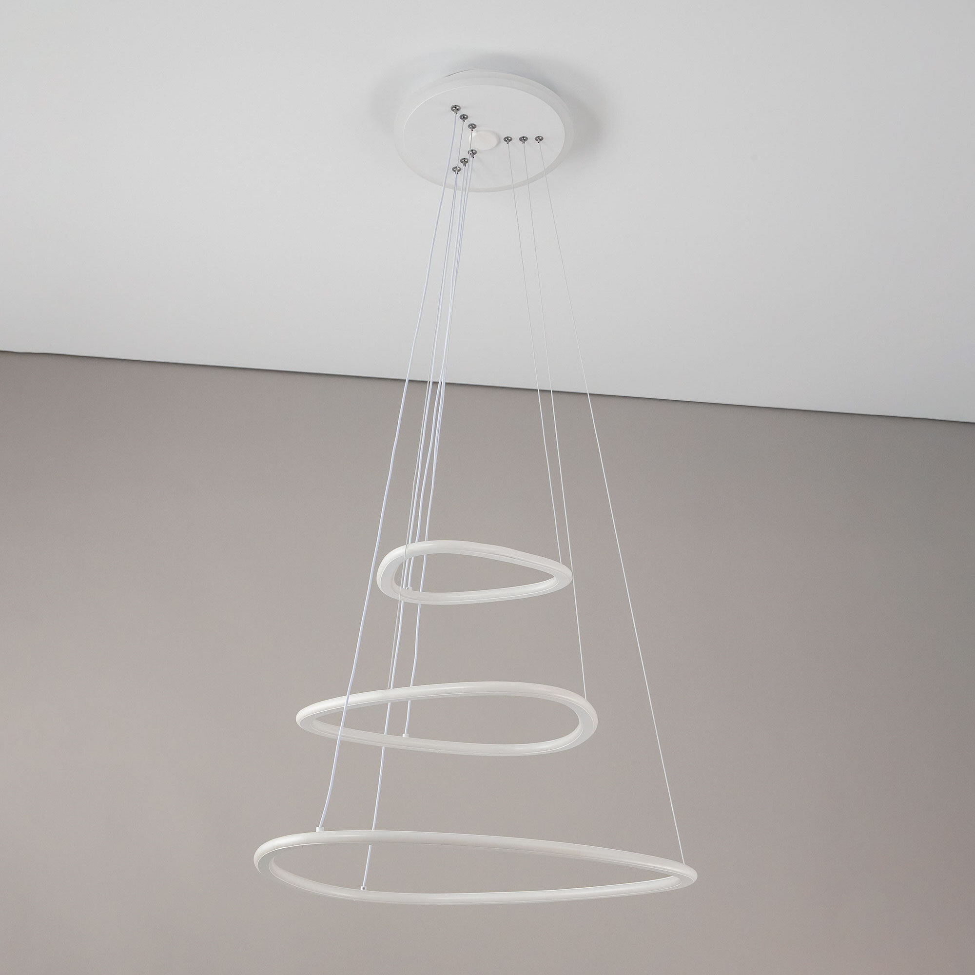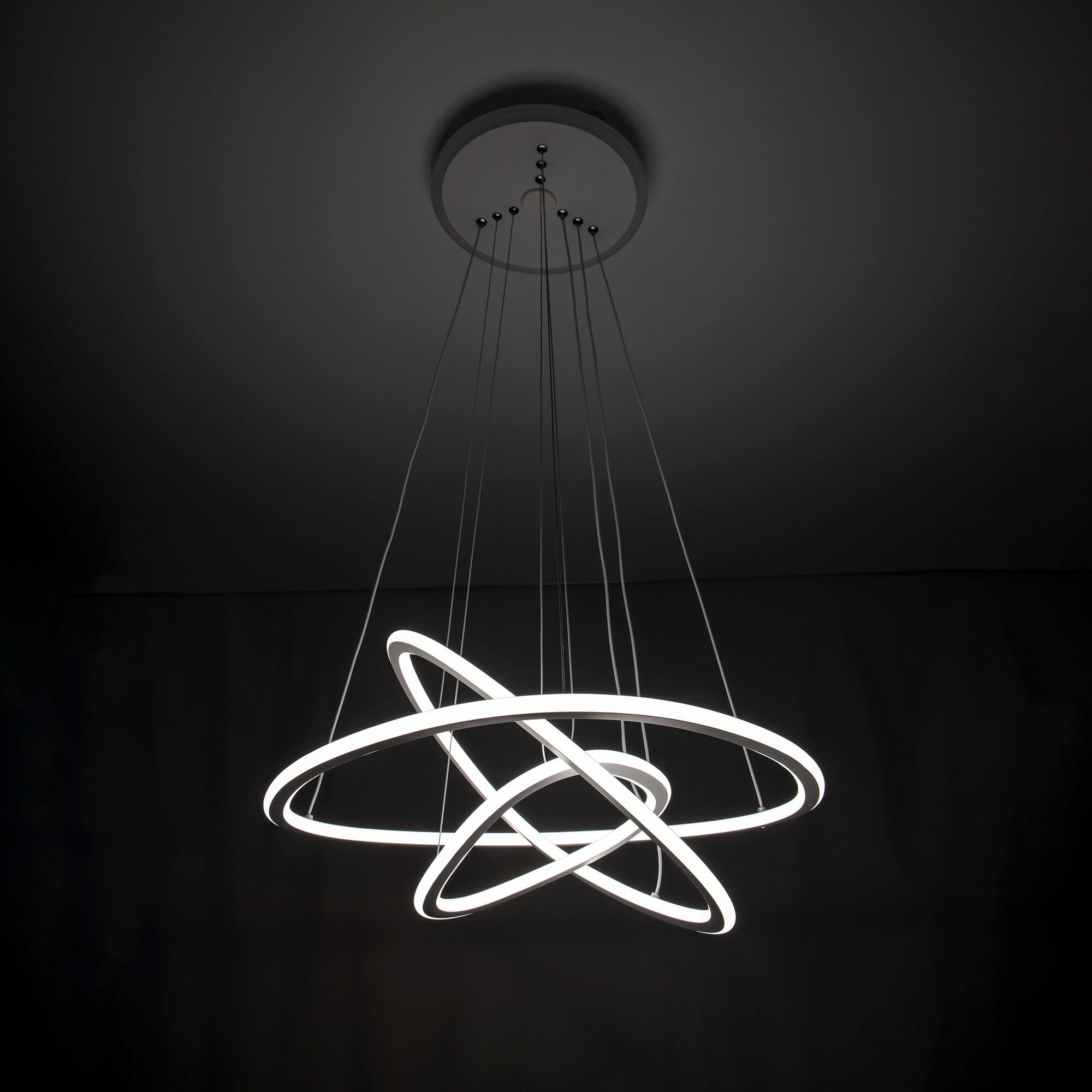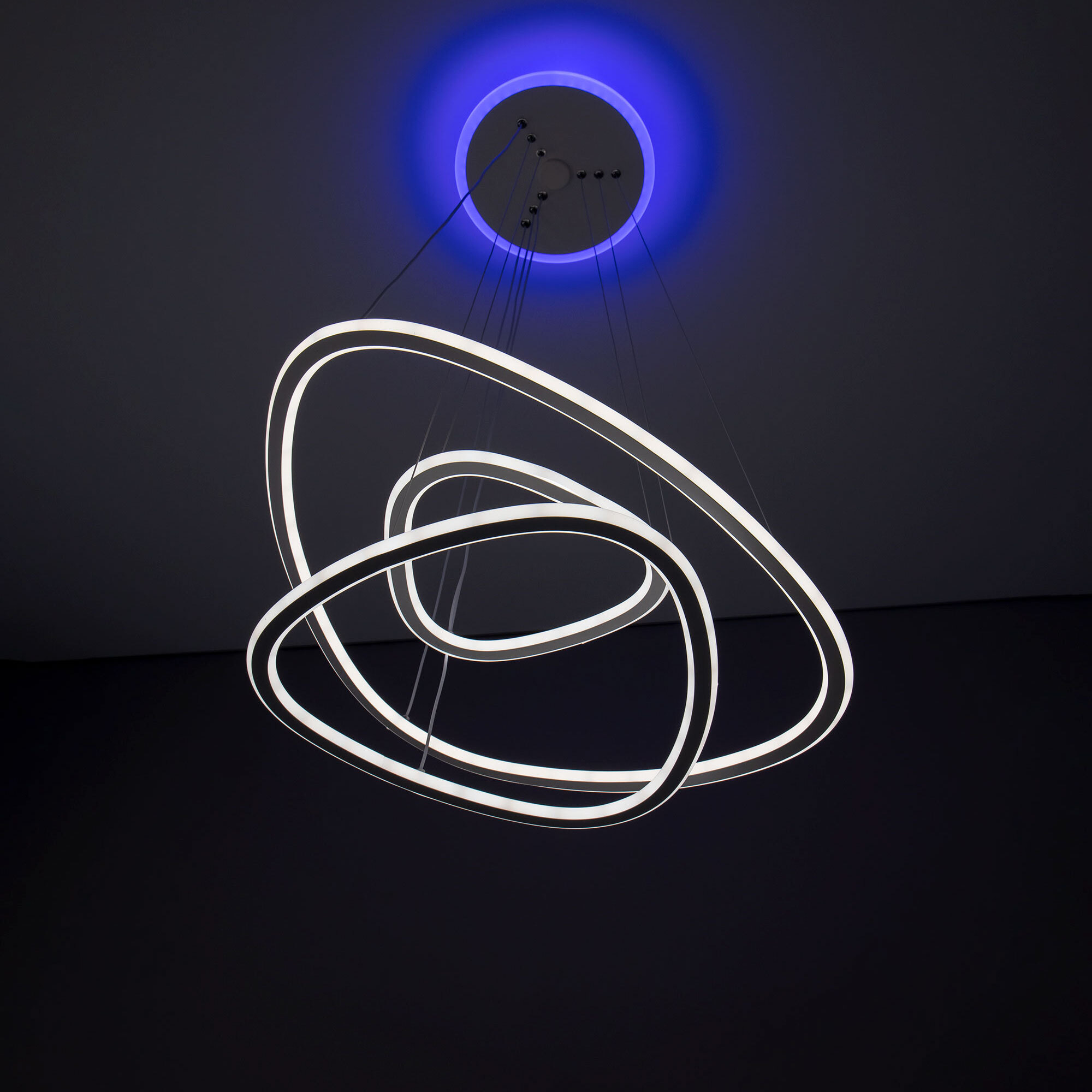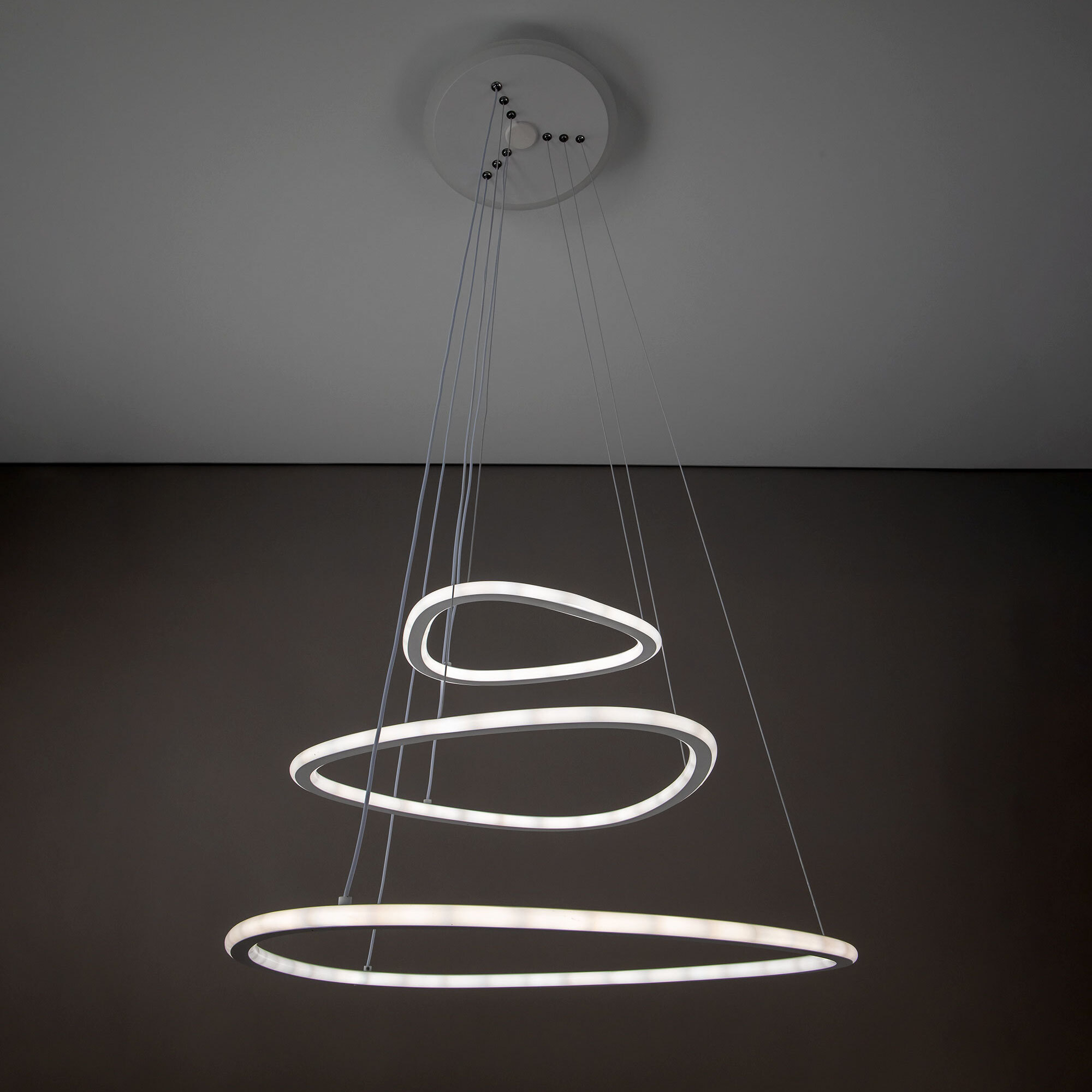 Подвесная светодиодная люстра Citilux Неон Смарт CL731A330E с голосовым управлением, входит в экосистему Citilux SMART. Светильником можно управлять: из приложения на смартфоне по Wi-Fi, при наличии интернета, с помощью голосовых помощников Алиса и Маруся, а также пультом дистанционного управления и настенным выключателем. Люстра на тросах, в форме каскада из трех подвесных колец, высоту и угол наклона каждого из которых можно изменить. Корпус изготовлен из алюминиевого сплава, окрашенного в белый цвет. Рассеиватель оптический полимер, цвет белый матовый. Крепление люстры подходит для всех типов потолков, в том числе натяжных. Тип крепления – планка. Модель оснащена мощными светодиодами, с возможностью плавной регулировки яркости от 10 до 100%. Цветовая температура регулируется в диапазоне от 3000К до 5500К, с возможностью настроить любые оттенки теплого, нейтрального и холодного света. В основании светильника установлена независимая цветная подсветка RGB. Мощность изделия 140Вт, световой поток 7500Лм, площадь освещения до 26м². Пульт ДУ в комплекте, тип батареек ААА (батарейками не комплектуется).