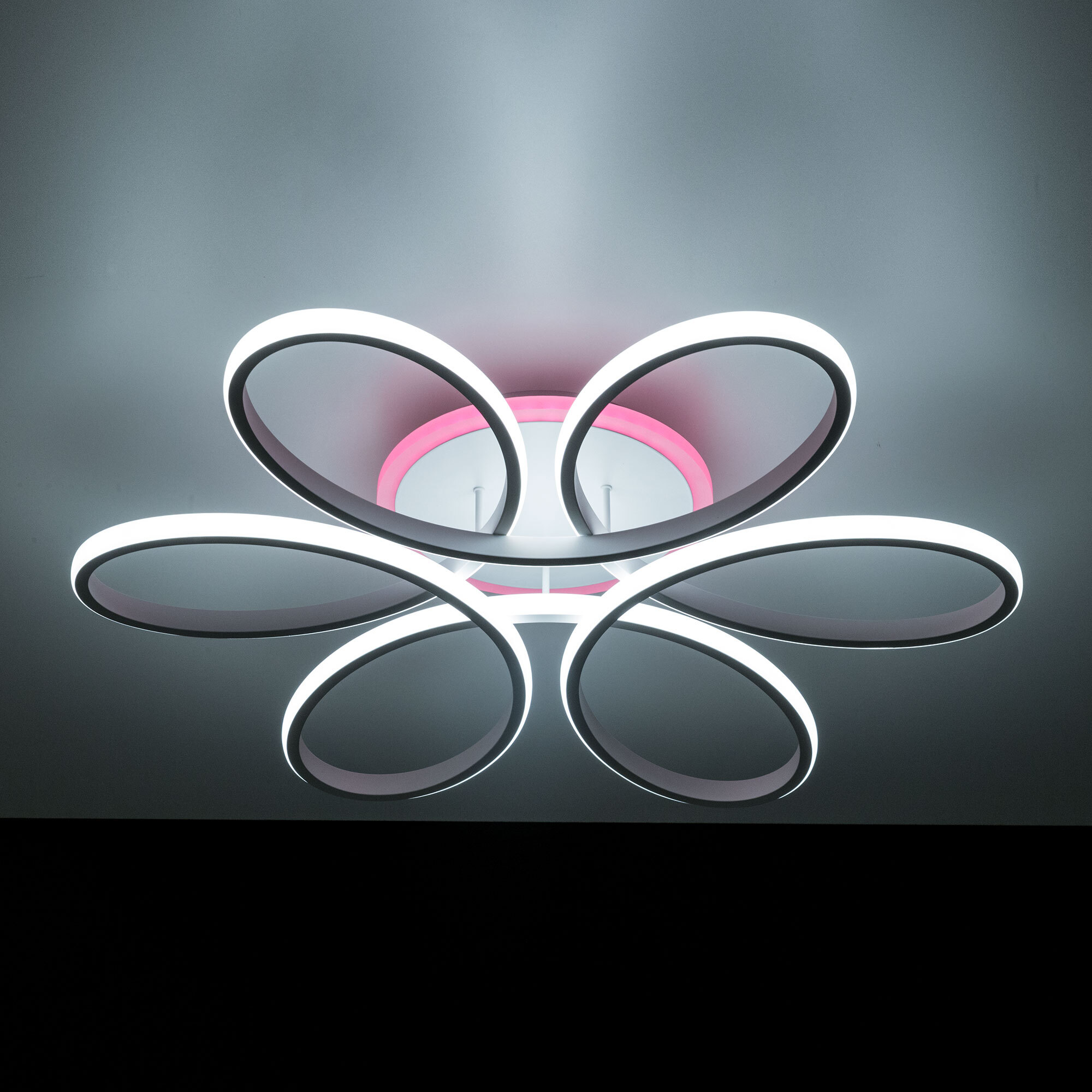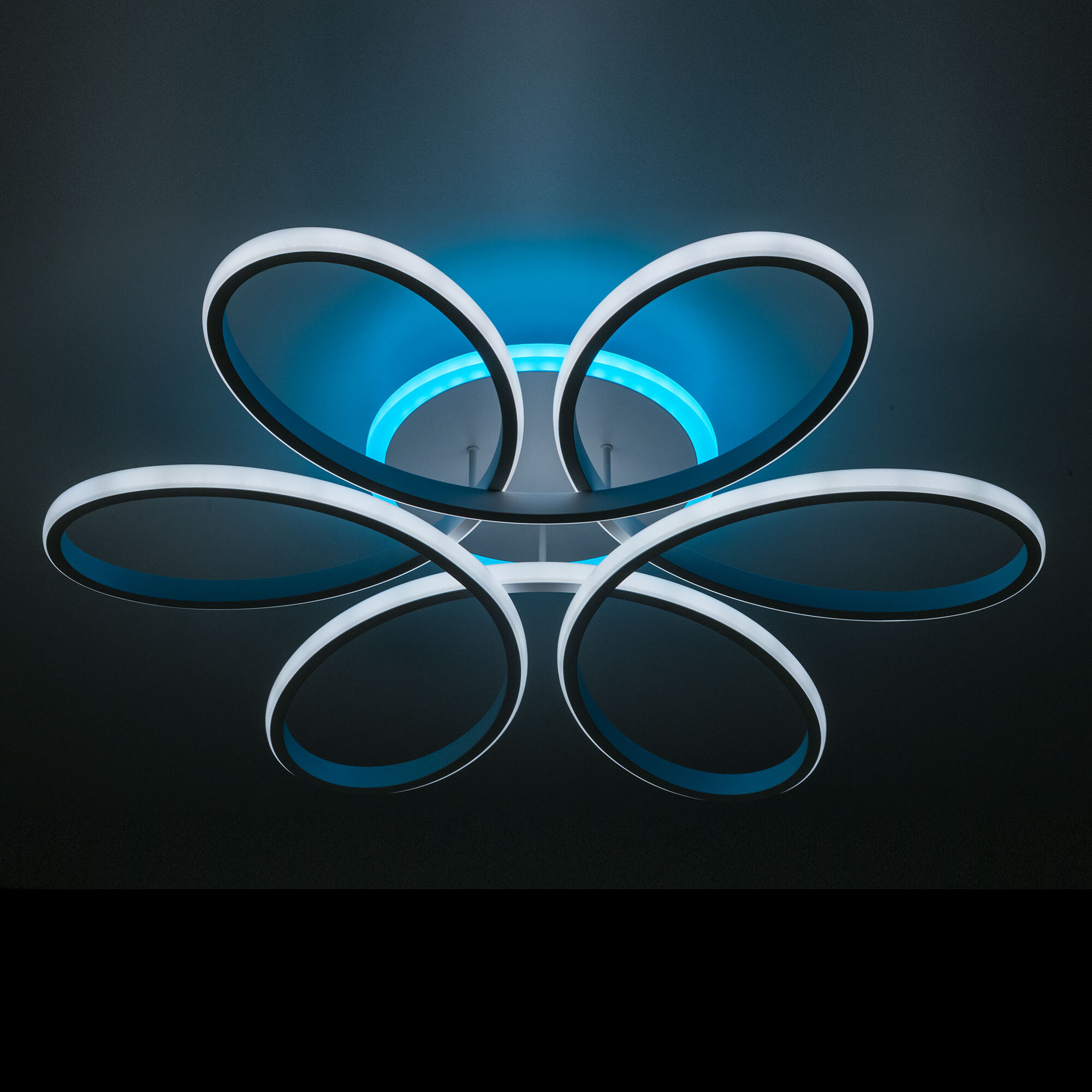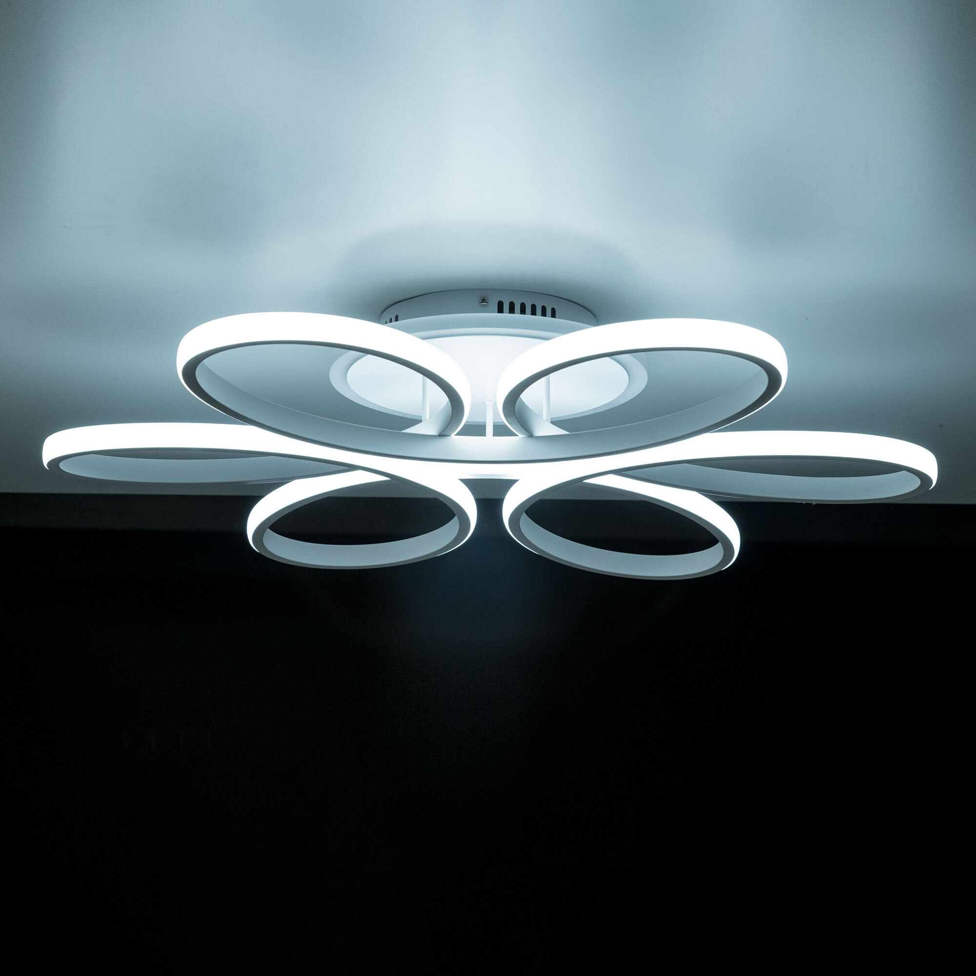 Модель оснащена мощными светодиодами, с возможностью плавной регулировки яркости от 10 до 100%. Цветовая температура регулируется в диапазоне от 3000К до 5500К, позволяя настроить любые оттенки теплого, нейтрального или холодного света. В основании светильника установлена независимая цветная подсветка RGB. Мощность люстры 100Вт, 7000Лм, площадь освещения при стандартной высоте потолков около 25 кв. метра. Пульт ДУ в комплекте, тип батареек ААА (батарейками не комплектуется).