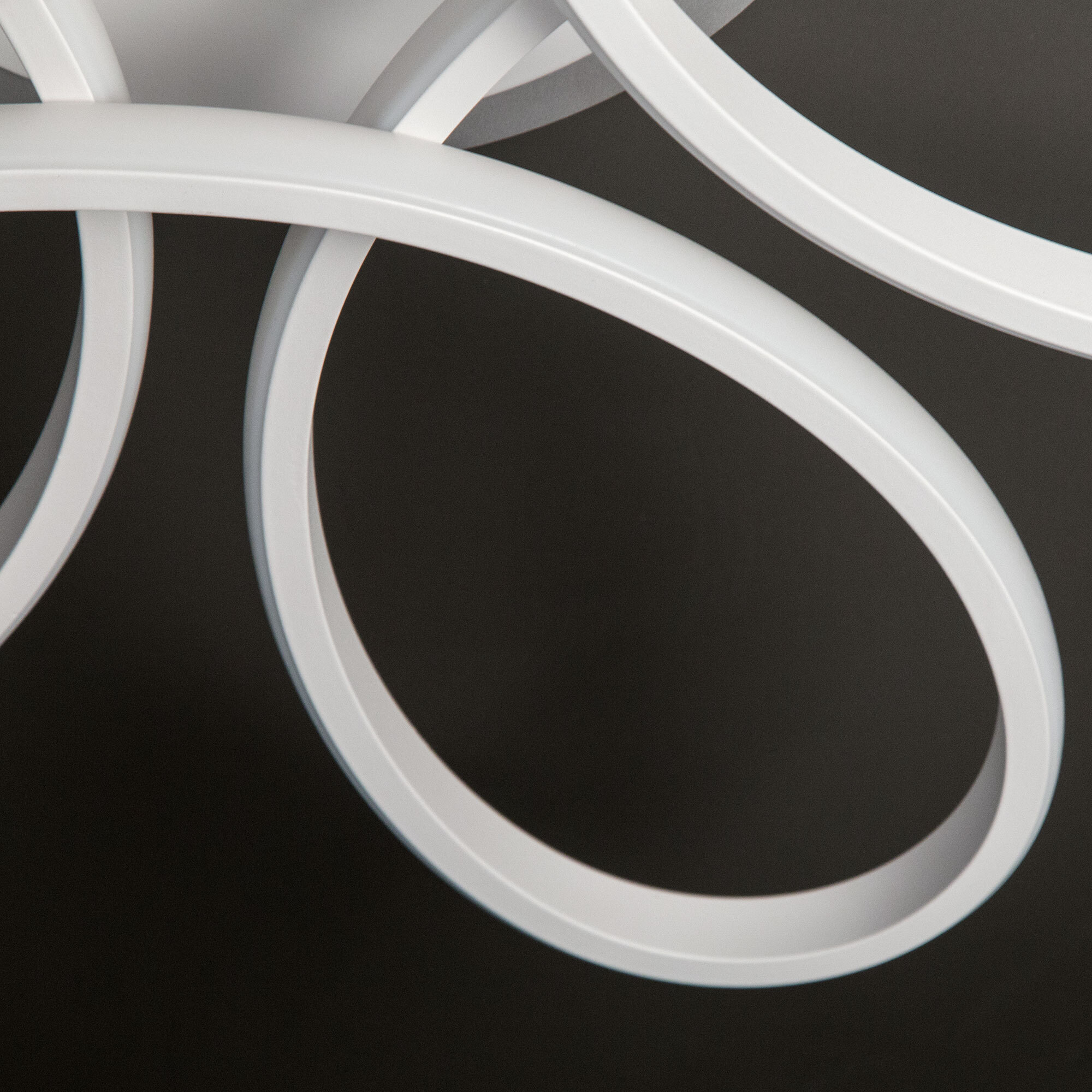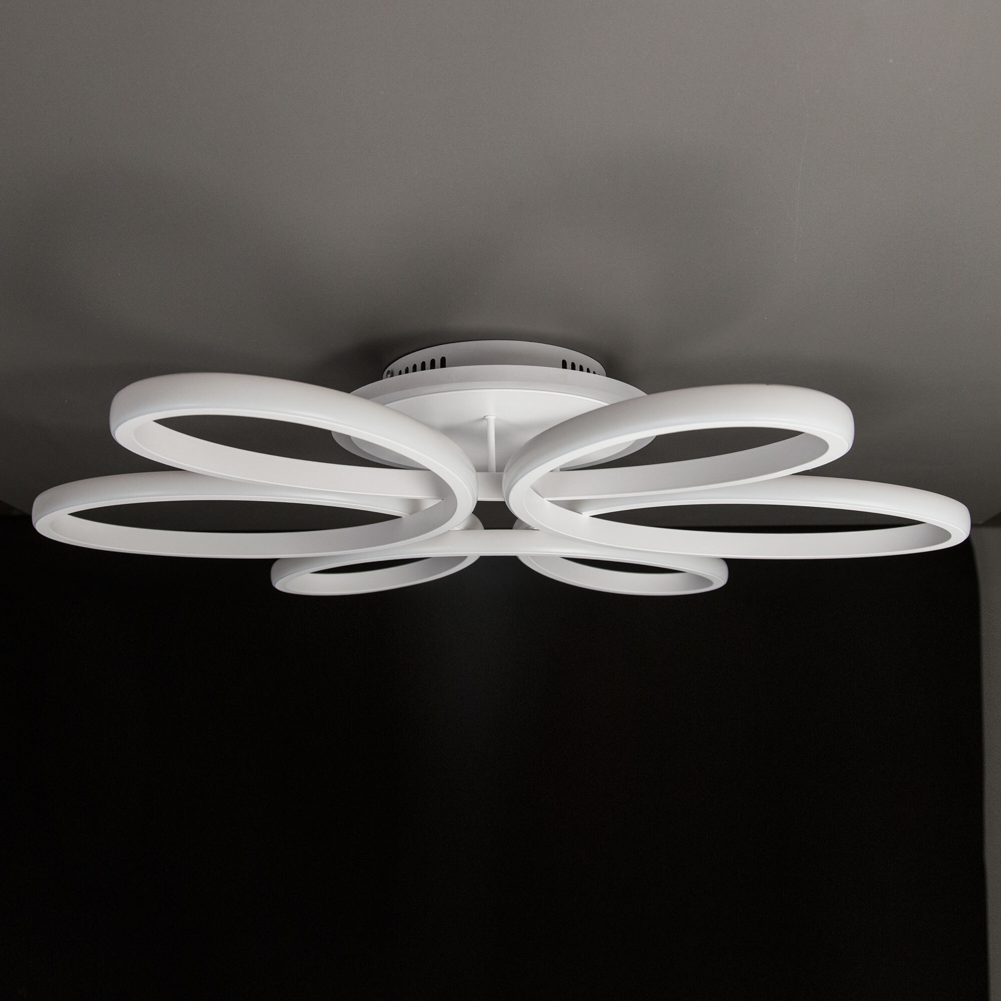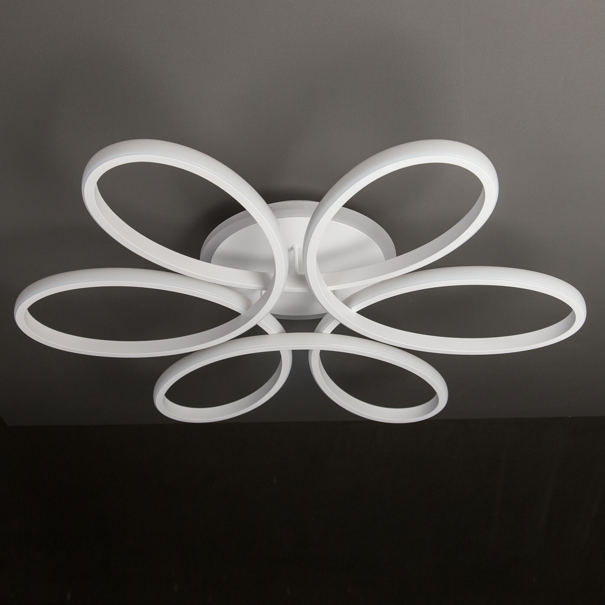 Светильник белый матовый, с круглым основанием. Светодиодный модуль формирующий внешний вид люстры изогнутой формы. Модель подходит для всех типов потолков, в том числе натяжных.