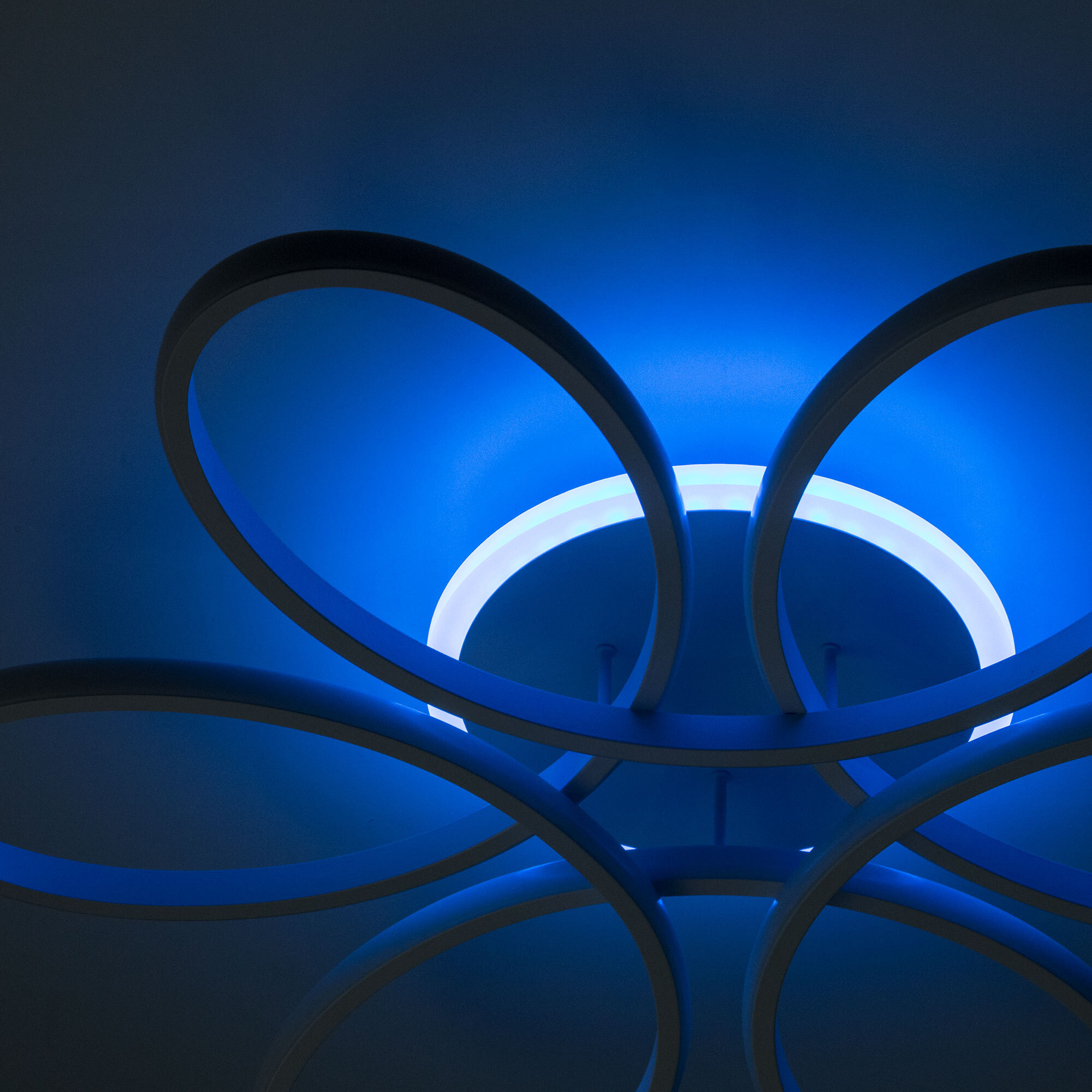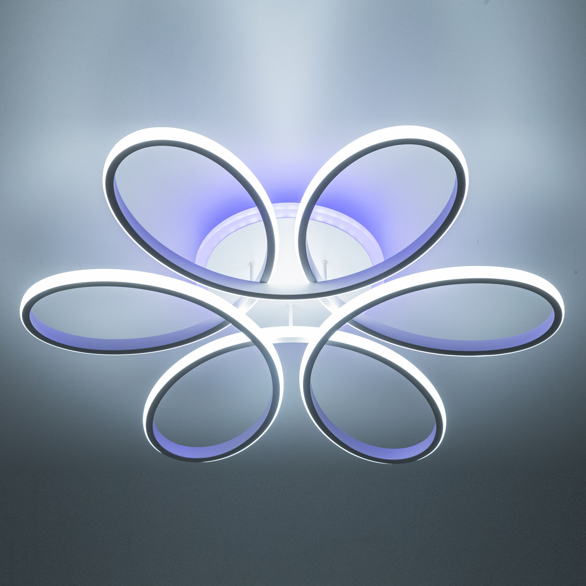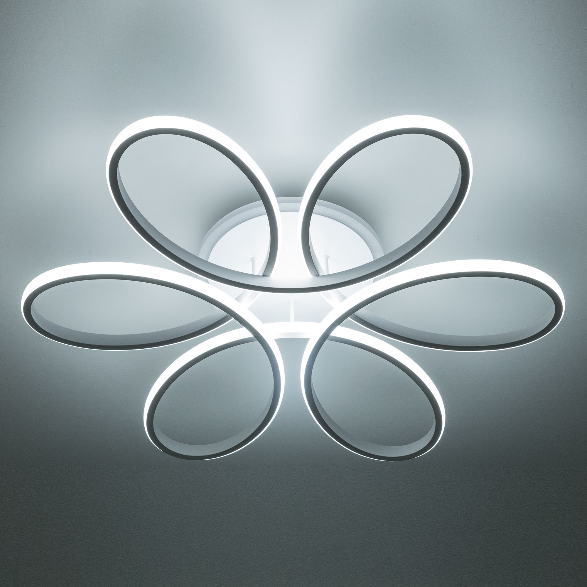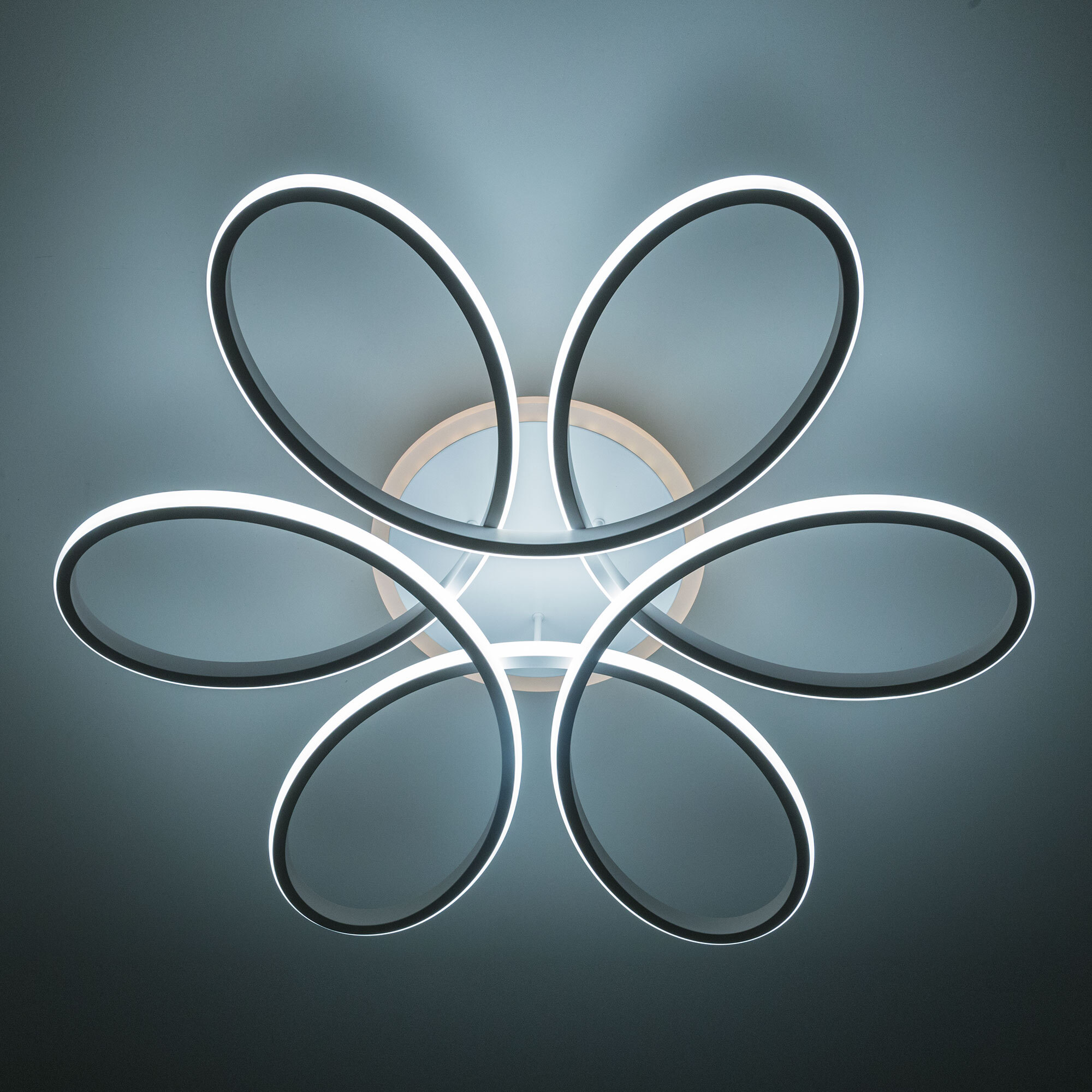 Светильник белый матовый, с круглым основанием. Светодиодный модуль формирующий внешний вид люстры изогнутой формы. Модель подходит для всех типов потолков, в том числе натяжных.