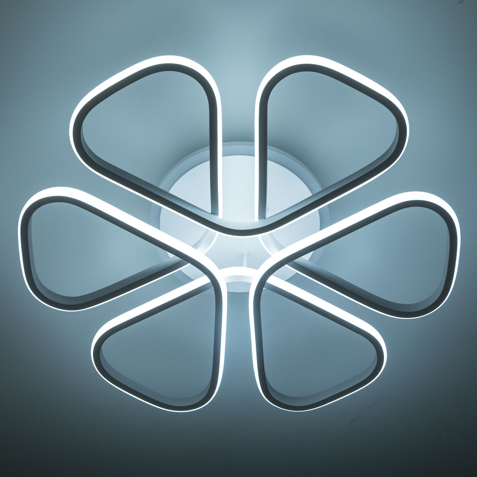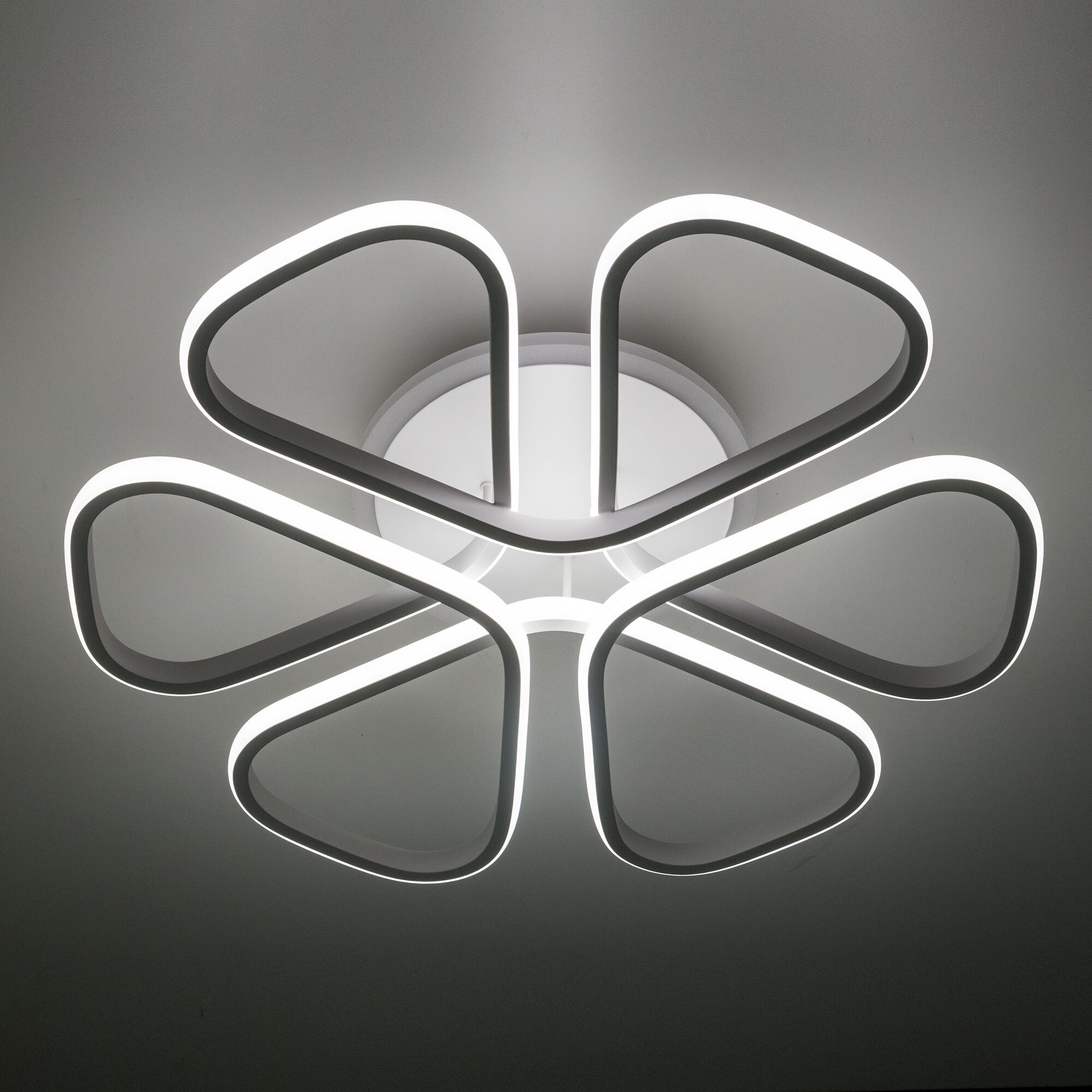 Светильник белый матовый, с круглым основанием. Светодиодный модуль формирующий внешний вид люстры изогнутой формы. Модель подходит для всех типов потолков, в том числе натяжных.