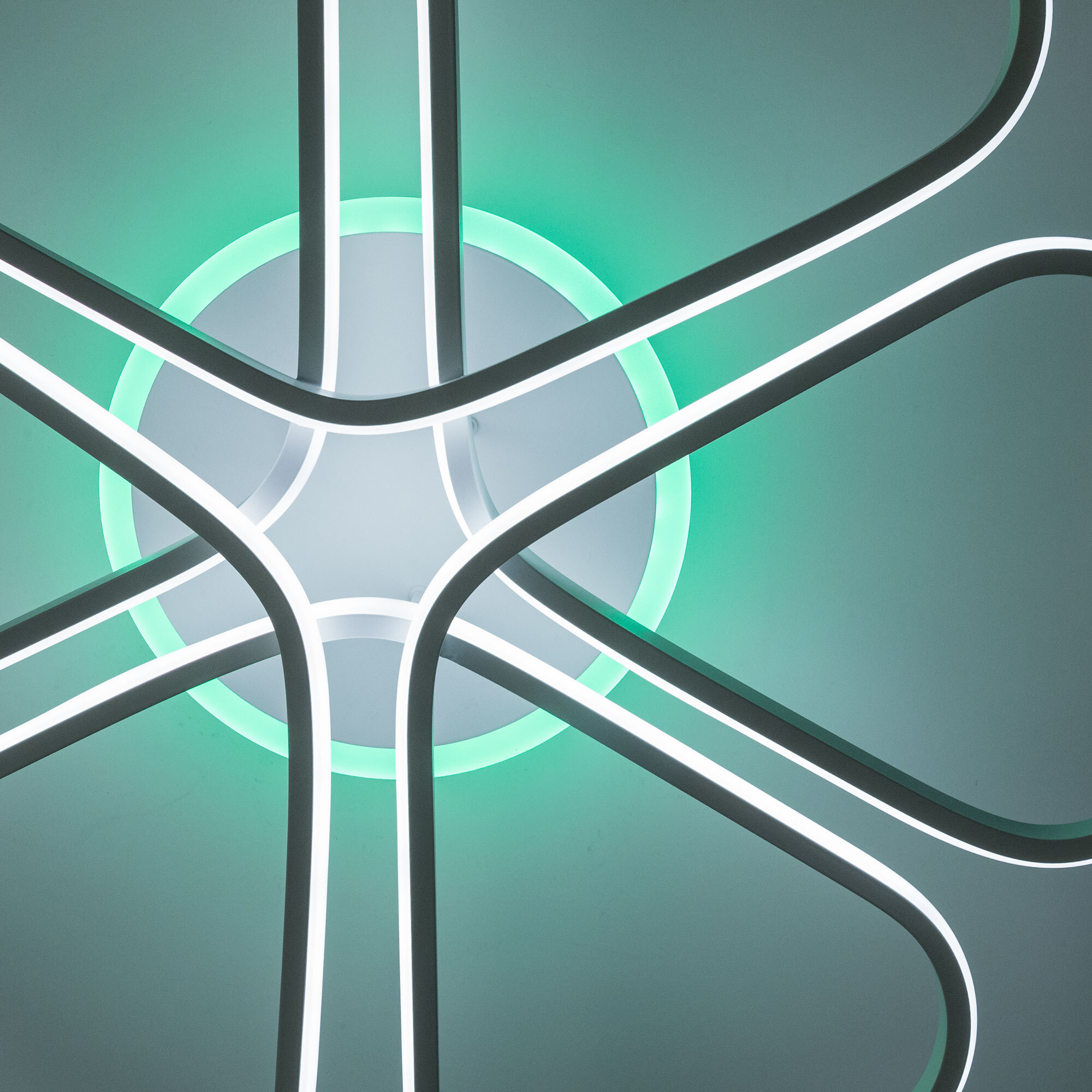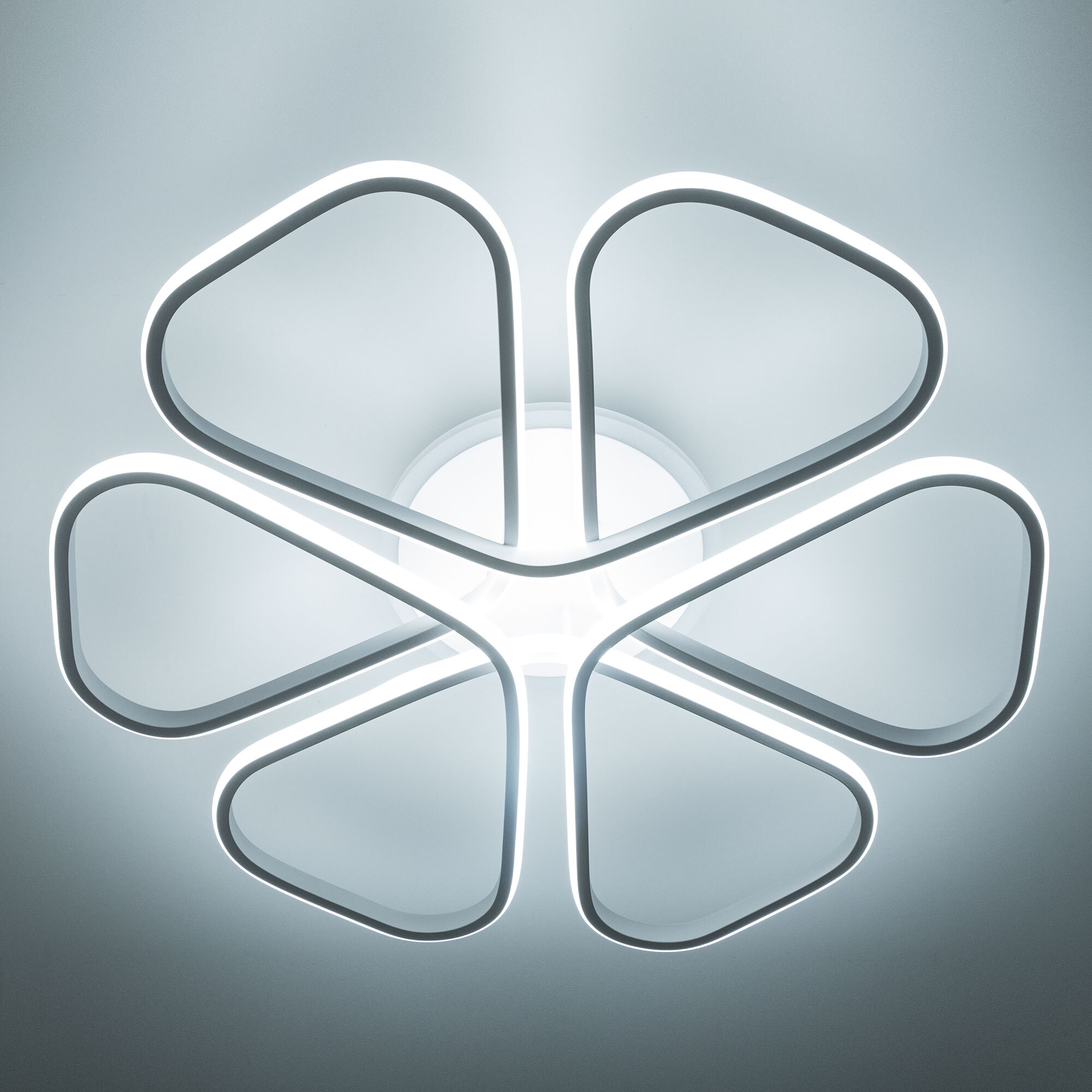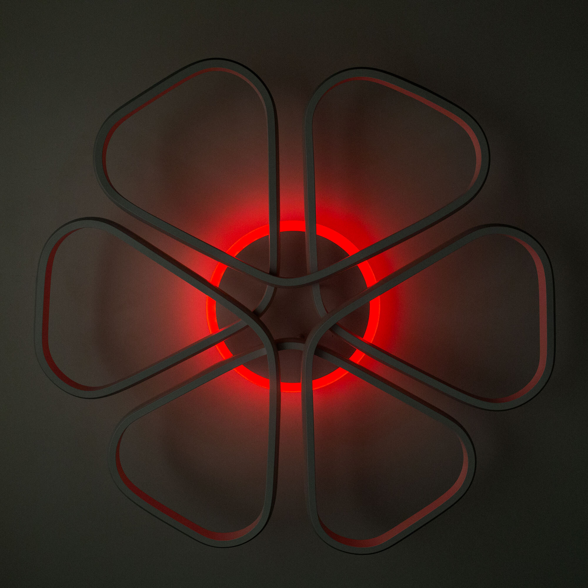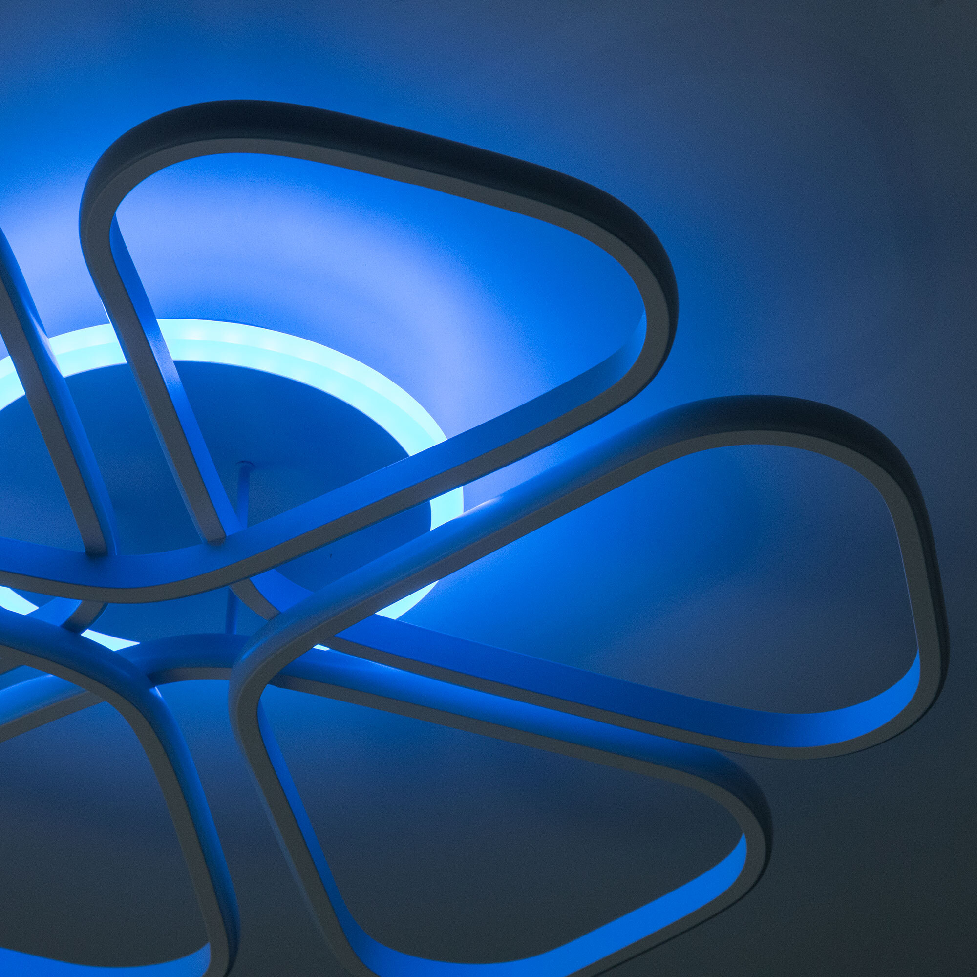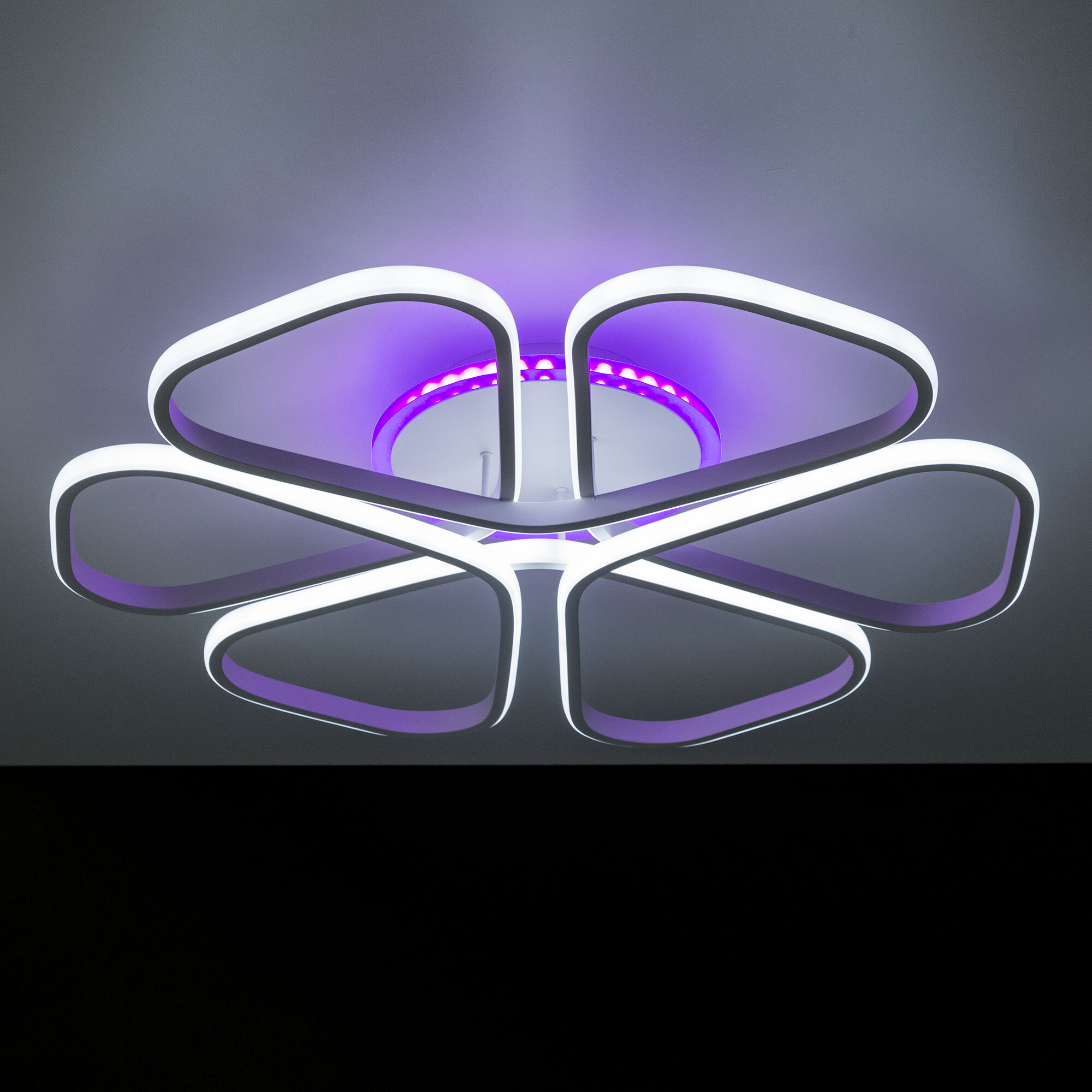 Модель оснащена мощными светодиодами, с возможностью плавной регулировки яркости от 10 до 100%. Цветовая температура регулируется в диапазоне от 3000К до 5500К, позволяя настроить любые оттенки теплого, нейтрального или холодного света. В основании светильника установлена независимая цветная подсветка RGB. Мощность люстры 125Вт, 8700Лм, площадь освещения при стандартной высоте потолков около 28 кв. метра. Пульт ДУ в комплекте, тип батареек ААА (батарейками не комплектуется).