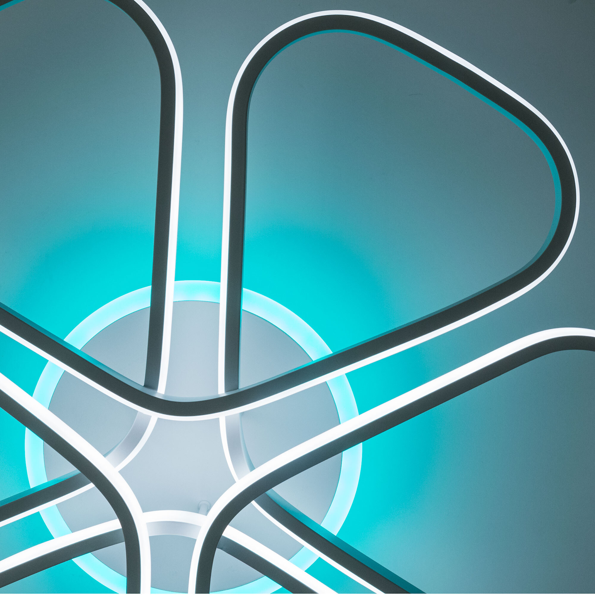 Светильник белый матовый, с круглым основанием. Светодиодный модуль формирующий внешний вид люстры изогнутой формы. Модель подходит для всех типов потолков, в том числе натяжных.