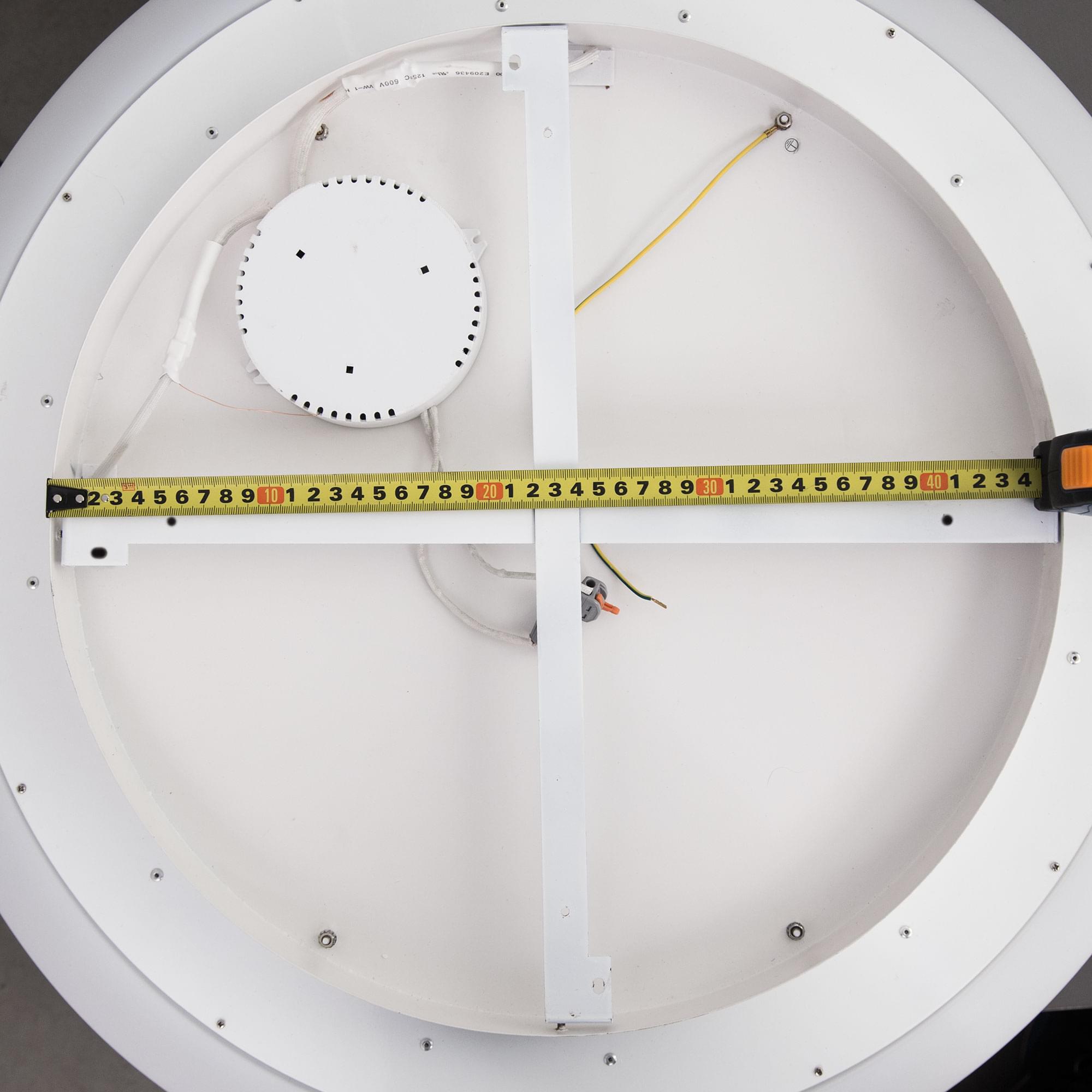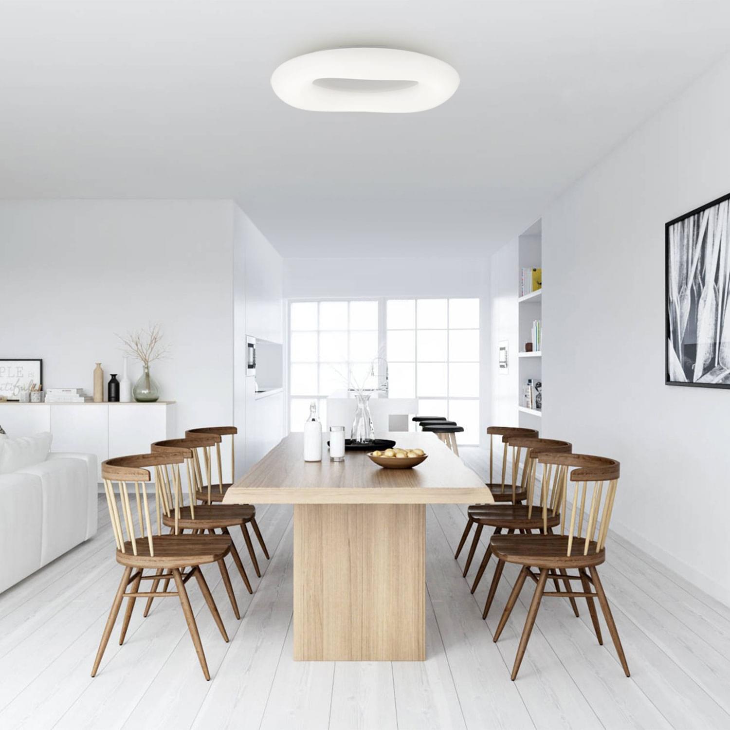 Потолочная люстра в форме кольца (бублик). Корпус металлический, рассеиватель оптический полимер, цвет белый матовый. Крепление люстры подходит для всех типов потолков, в том числе натяжных. Тип крепления – планка.