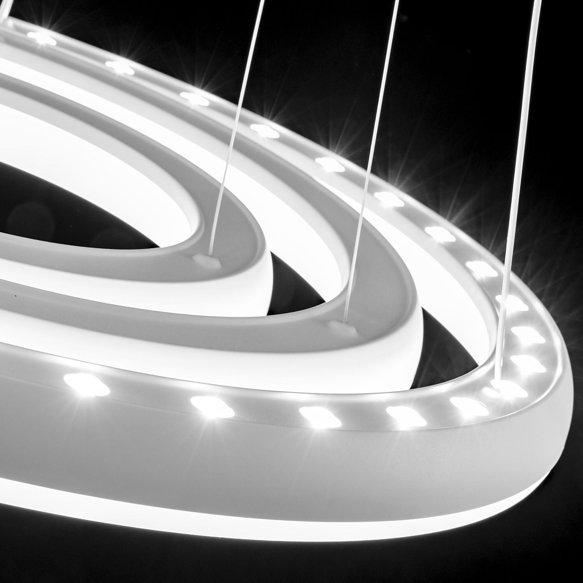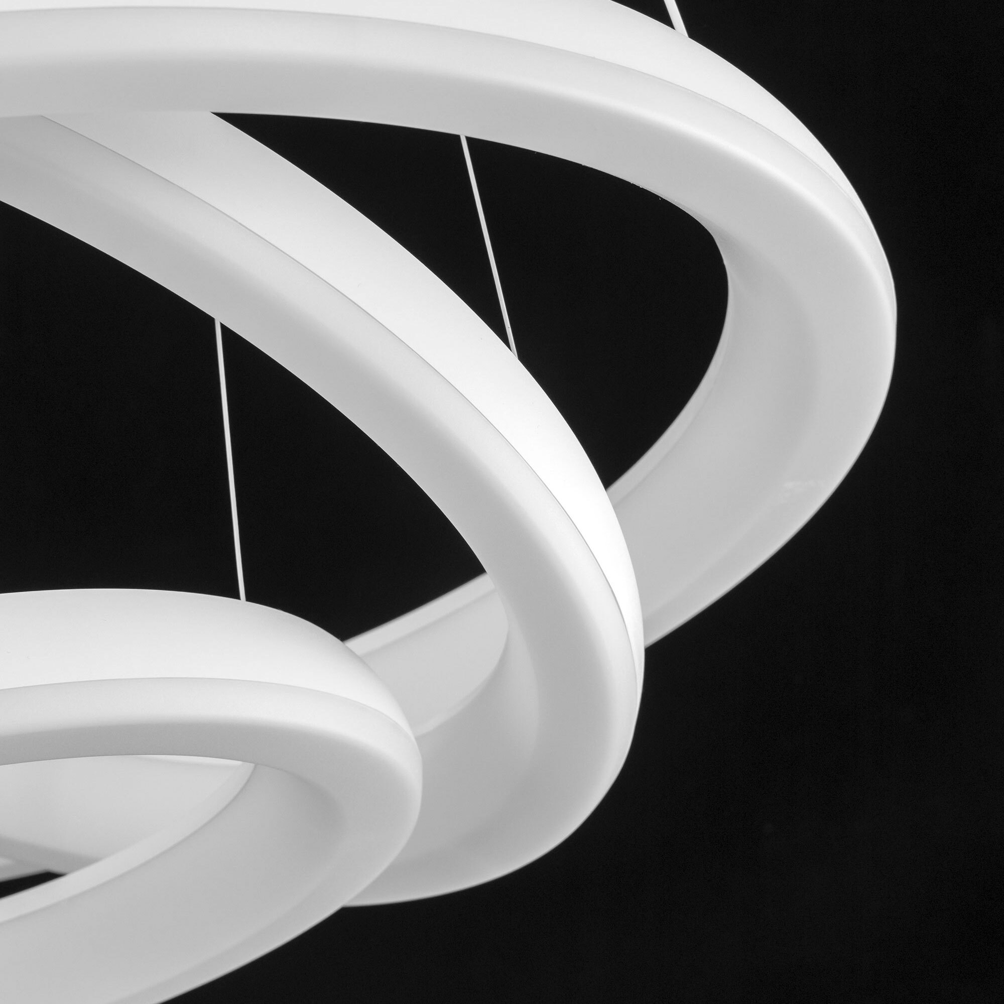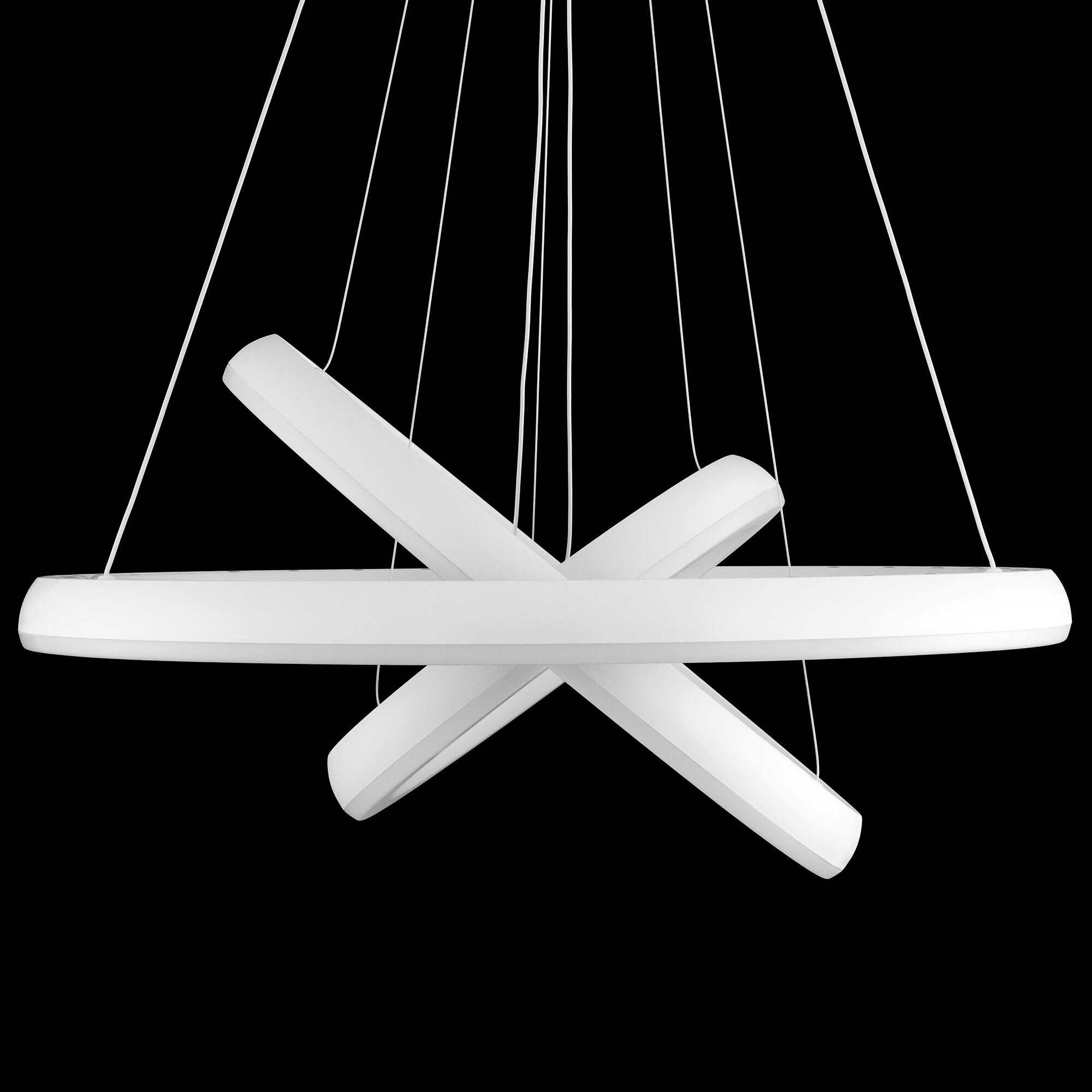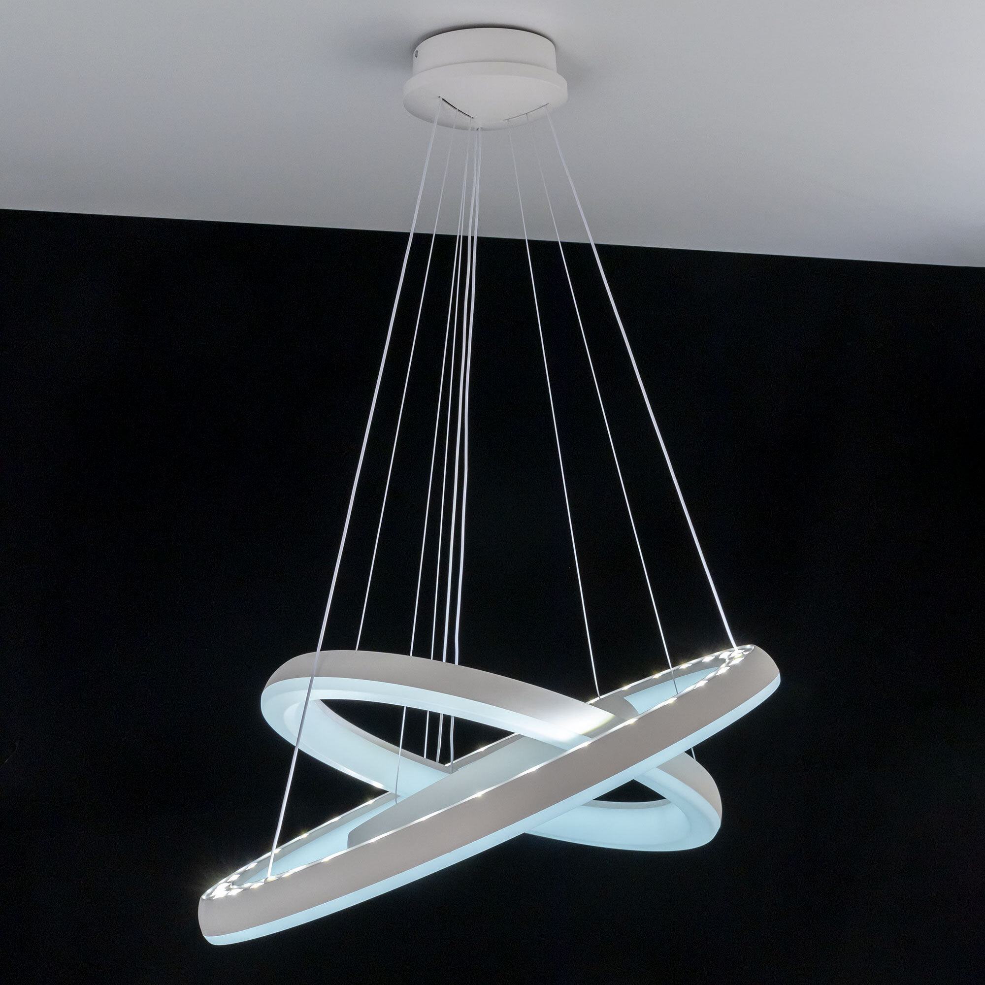 Люстра на тросах в форме каскада из трех подвесных колец, высоту и угол наклона каждого из которых можно изменить. Корпус изготовлен из прочного полимера, рассеиватель оптический полимер, цвет белый матовый. Крепление люстры подходит для всех типов потолков, в том числе натяжных. Тип крепления – планка. Суммарная мощность светильника 170Вт, световой поток 12500Лм.