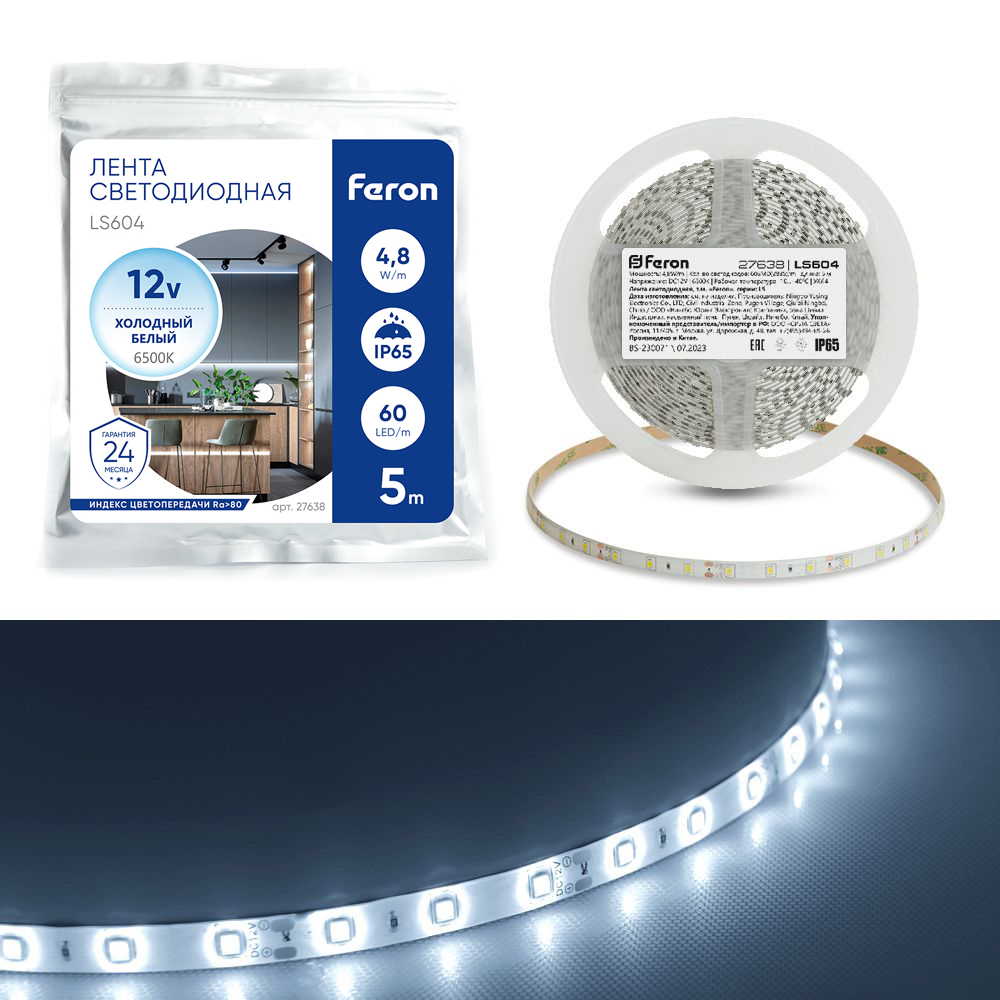 Лента светодиодная 12V FERON LS604, 60*SMD2835, 4,8W/m, IP65, 6500К (холодный белый), Кратность резки мм 50мм, 5000 *8 *3.8мм