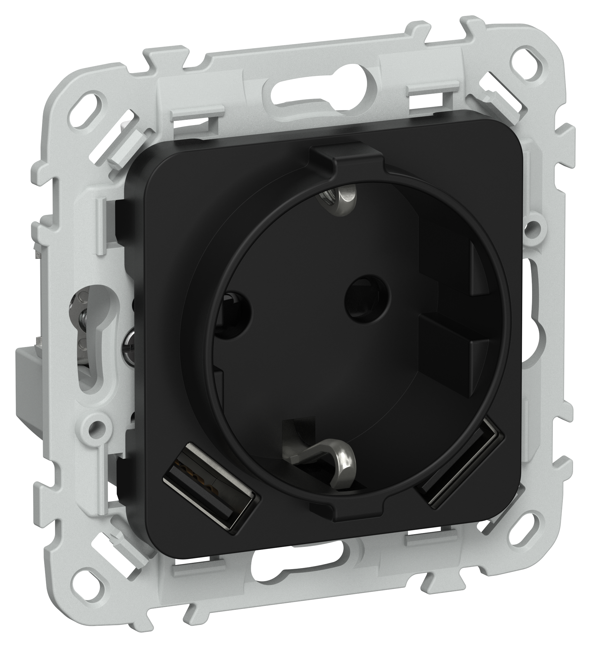 FLITE Розетка 1-местная с заземлением с защитными шторками 16А с USB A+A 3,1А РСЮша11-0-ФлЧ черный IEK