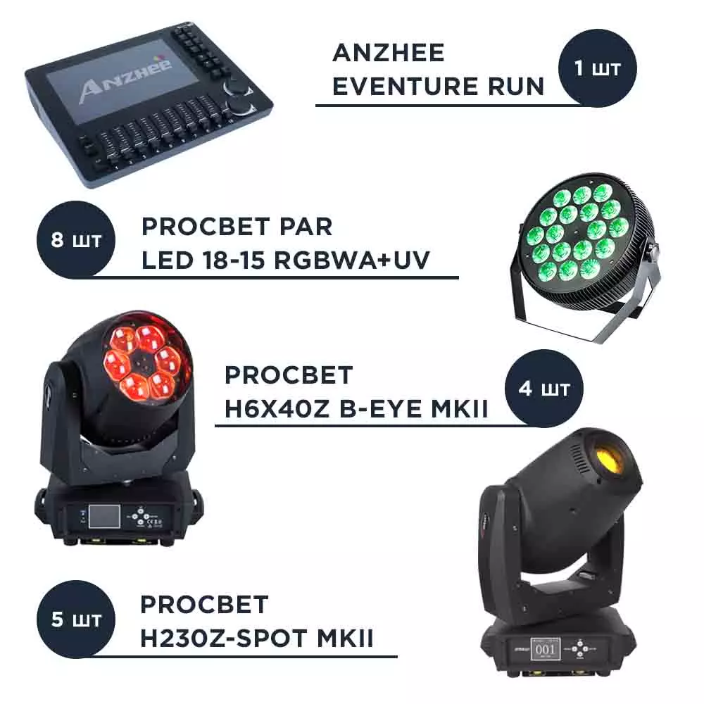 5 вращающихся голов PROCBET H230Z-SPOT MKII для точечного и рисующего освещения / 4 вращающихся головы PROCBET H6x40Z B-EYE MKII для заливающего света и точечного и рисующего освещения / 8 дополнительных прожекторов PROCBET PAR LED 18-15 RGBWA+UV / Полноценная консоль для управления / аксессуары необходимые для монтажа