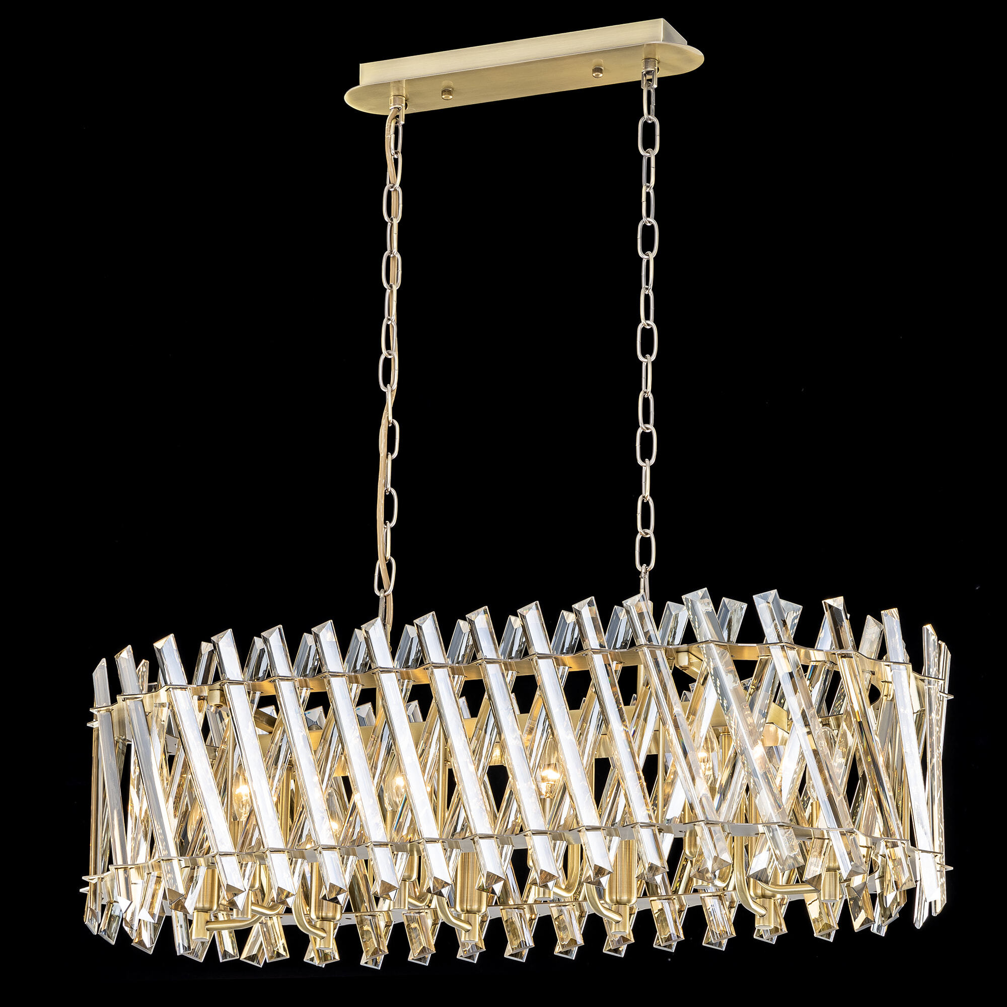В изделии 10 ламп с цоколем Е14, максимальной мощностью для ламп накаливания 60Вт (в комплект не входят, приобретаются отдельно). Люстра подходит для общего и дополнительного освещения помещений как с высокими, так и с низкими потолками, длина цепи регулируется при установке, тип крепления – планка. Размеры модели - длина 81см, ширина 36см, высота 45-140см, осветит до 24м².