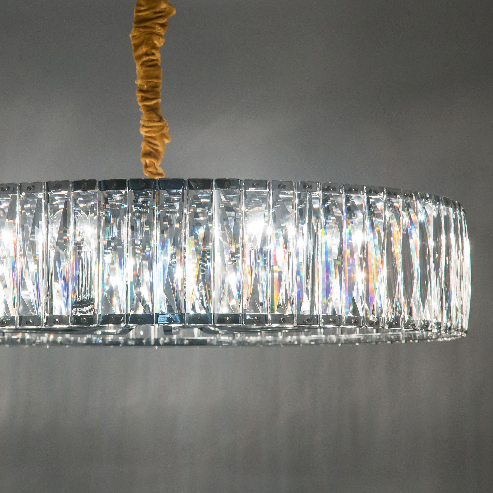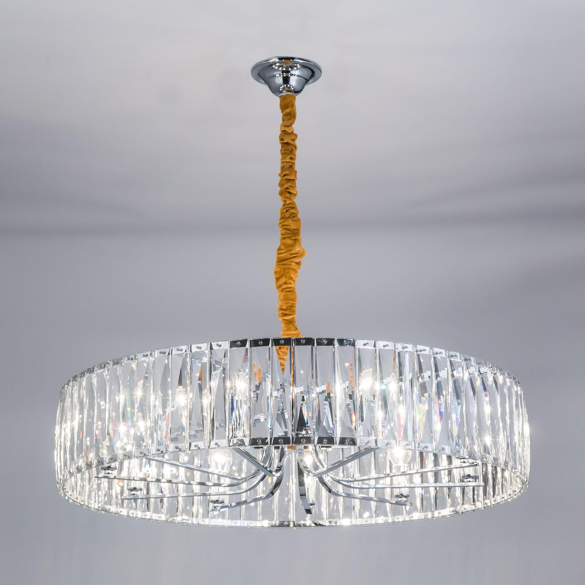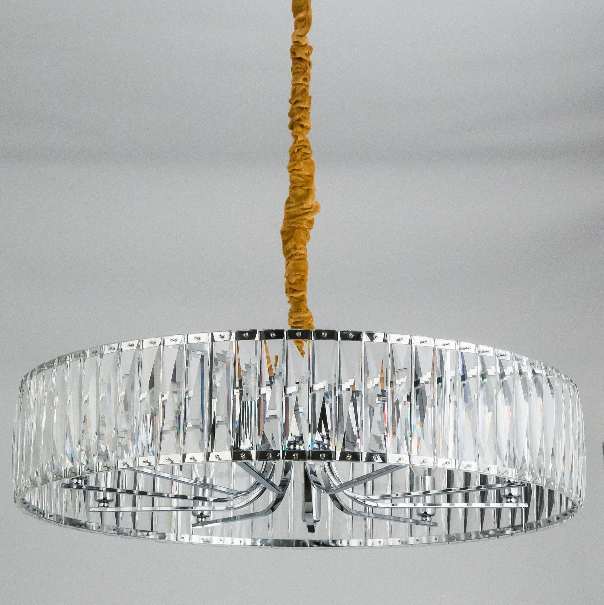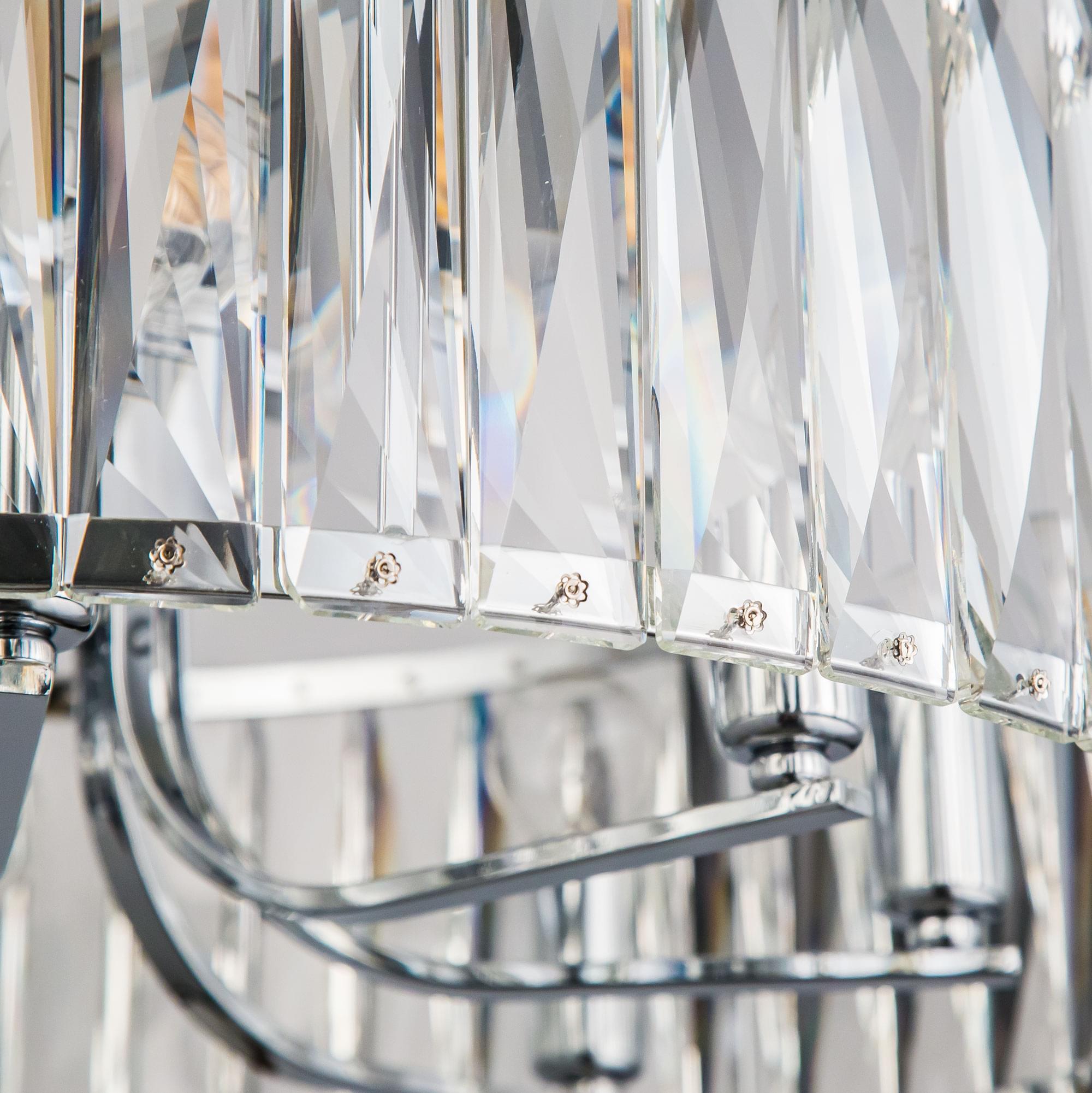 Корпус светильника выполнен из блестящего хромированного металла, в обрамлении хрустального абажура из прозрачных кристаллов, которые отражая свет, создают волшебное сияние и сказочную игру бликов.