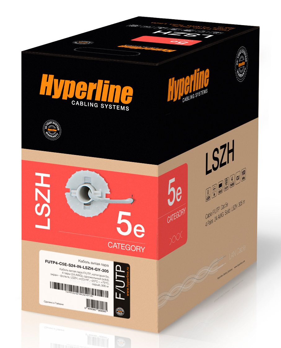 Кабель витая пара, неэкранированная U/UTP, категория 5e, 4 пары (24 AWG), одножильный(solid), LSZH, нг(А)-HF, -20 градусов – +75 градусов, серый - гарантия -15 лет компонентная, 25 лет системная. Неэкранированный U/UTP кабель на 4 пары Передача сигналов 1 GbE (90 м) на частоте до 100 МГц Возможные варианты внешней оболочки - PVC / LSZH Однопроволочные жилы - 0,51 мм (24 AWG) внутри помещений. Построение магистральной и горизонтальной подсистем СКС категории 5e в условиях незначительных электромагнитных помех. Передача сигналов 1 Гбит/с на частоте до 100 МГц. Поддерживаемые приложения - 10–1000 Мбит/с Ethernet (10BASE-T, Fast 100BASE-TX, Gigabit 1000BASE-T), ATM-622 Мбит/с, 100VG-AnyLAN, Token Ring, Firewire, другие приложения кабельных систем категории 5e.