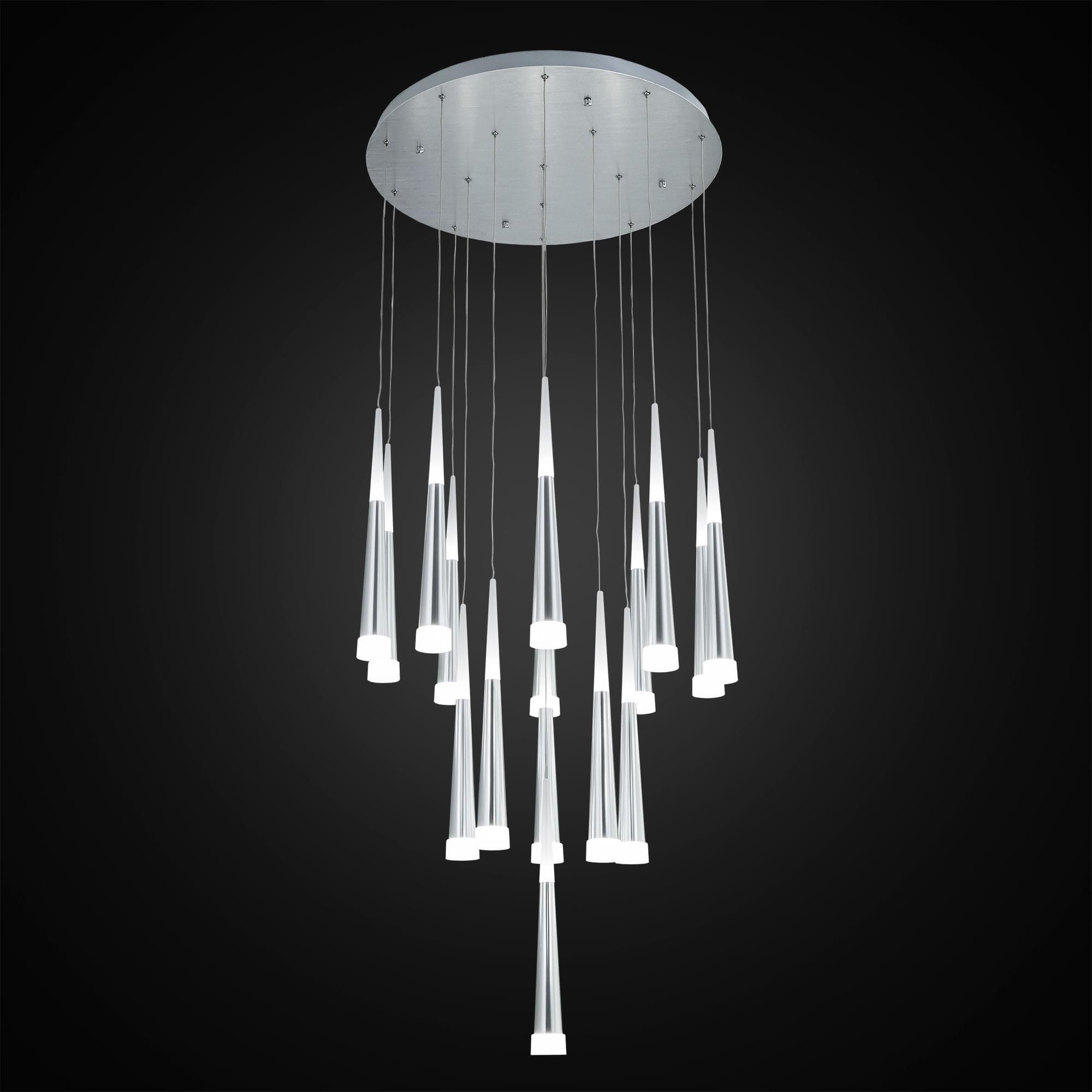 Роскошная подвесная светодиодная слюстра CL227160 с 16-ю конусными плафонами цвета хром из коллекции «Вегас» общей мощностью в 112 Вт. Все подвесы новой коллекции «Вегас» излучают оптимальный для человеческих глаз, мягкий тёплый (3000К) свет, и разработаны в нескольких вариантах размера, от аккуратных одинарных до огромных и шикарных шеснадцатирожковых. Мощность каждого рожка в диодном эквиваленте 7 Вт, что соответствует приблизительно шестидесяти ваттной лампе накаливания. Данная модель люстры, с 16-ю плафонами, способна осветить помещение площадью от 24,5 до 38 квадратных метров! Внутри плафона подвеса стоят современные светодиоды, которые дают яркий и в тоже время рассеянный свет. Высота каждого элемента подвеса независимо регулируется, позволяя придавать светильнику индивидуальный дизайн. Для вашего удобства при выборе мы создали коллекцию в 4-х цветах, которые сейчас особенно в тренде у дизайнеров интерьера, это – строгий чёрный, мягкий кофейный, элегантный алюминий и волнующий тёплый шампань. Серия «Вегас» отлично подходит для роскошных интерьеров с высокими потолками или для лестничных пролетов, ее подвесами можно украсить: кухню, прихожую, коридор, кабинет офиса, а также интерьеры кафе и ресторанов соответствующей стилистики.
