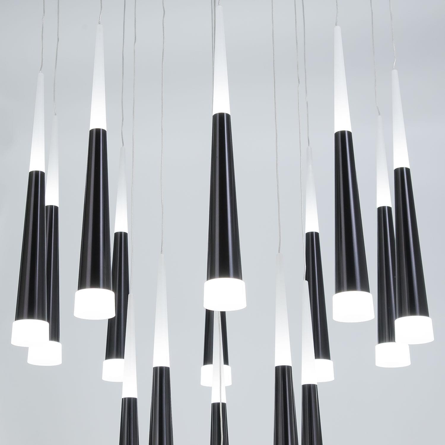 Роскошная подвесная светодиодная слюстра CL227161 с 16-ю конусными плафонами черного цвета из коллекции «Вегас» общей мощностью в 112 Вт. Все подвесы новой коллекции «Вегас» излучают оптимальный для человеческих глаз, мягкий тёплый (3000К) свет, и разработаны в нескольких вариантах размера, от аккуратных одинарных до огромных и шикарных шеснадцатирожковых. Мощность каждого рожка в диодном эквиваленте 7 Вт, что соответствует приблизительно шестидесяти ваттной лампе накаливания. Данная модель люстры, с 16-ю плафонами, способна осветить помещение площадью от 24,5 до 38 квадратных метров! Внутри плафона подвеса стоят современные светодиоды, которые дают яркий и в тоже время рассеянный свет. Высота каждого элемента подвеса независимо регулируется, позволяя придавать светильнику индивидуальный дизайн. Для вашего удобства при выборе мы создали коллекцию в 4-х цветах, которые сейчас особенно в тренде у дизайнеров интерьера, это – строгий чёрный, мягкий кофейный, элегантный алюминий и волнующий тёплый шампань. Серия «Вегас» отлично подходит для роскошных интерьеров с высокими потолками или для лестничных пролетов, ее подвесами можно украсить: кухню, прихожую, коридор, кабинет офиса, а также интерьеры кафе и ресторанов соответствующей стилистики.