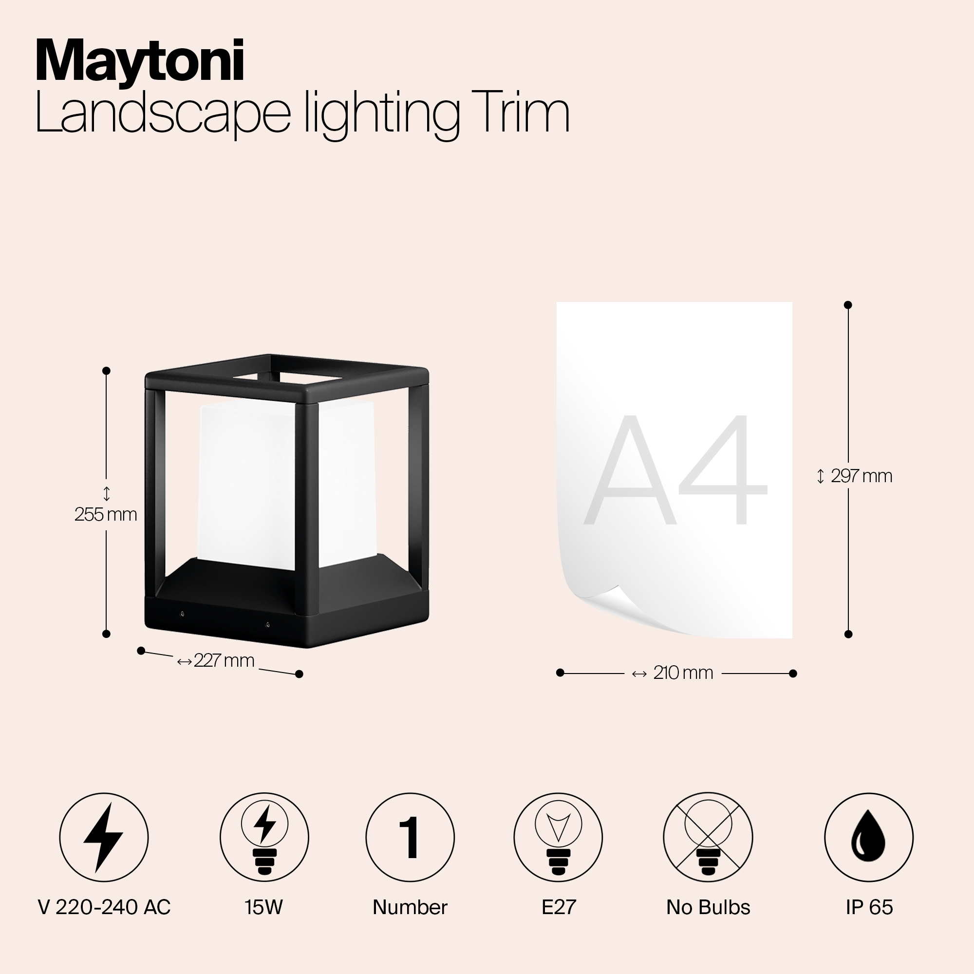 Алюминиевый корпус, цвет - графит. Белый акриловый рассеиватель. Источник света - лампа с цоколем Е27. Высокая степень защиты - IP65. Идеальная подсветка для заборов и различных колонн.