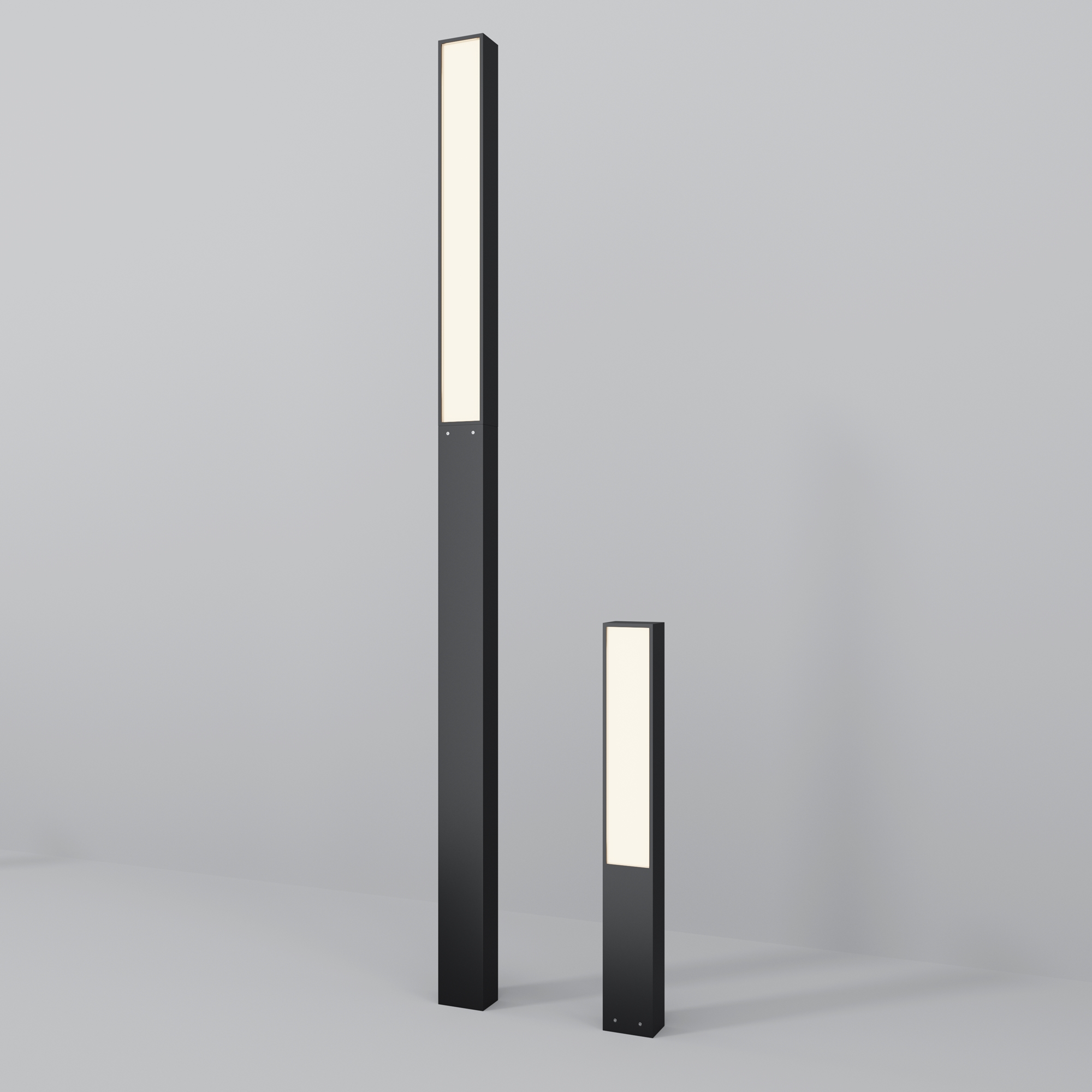 Материал арматуры — алюминий, цвет — графит. Рассеиватель из белого матового акрила — мягко рассеивает свет. Два размера — 1000 мм и 2500 мм. Мощность 20Вт и 40Вт для высокого светильника. LED-источник света. Цветовая температура 3000К. Защита корпуса от пыли и влаги — IP65. Подходят для основного освещения экстерьера.