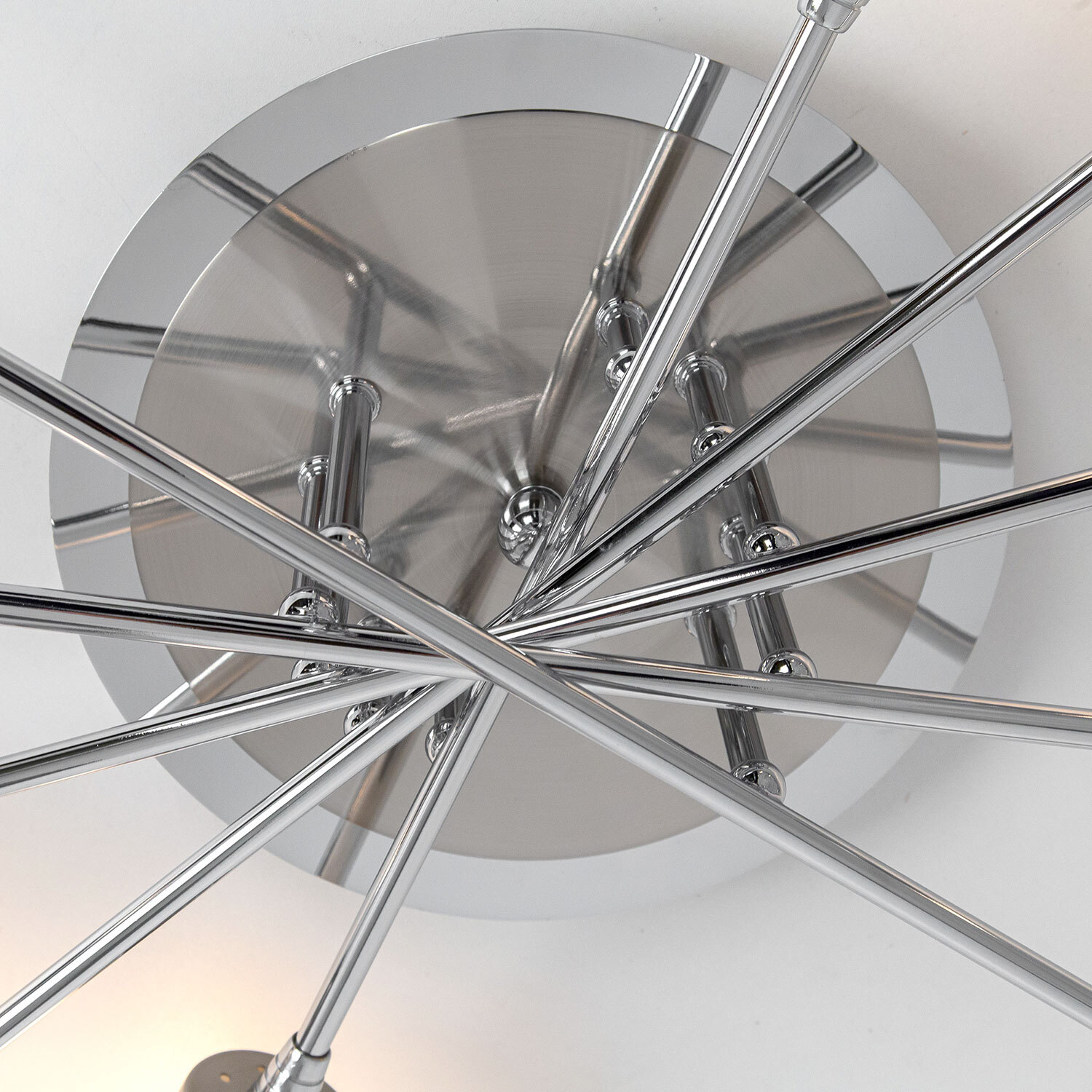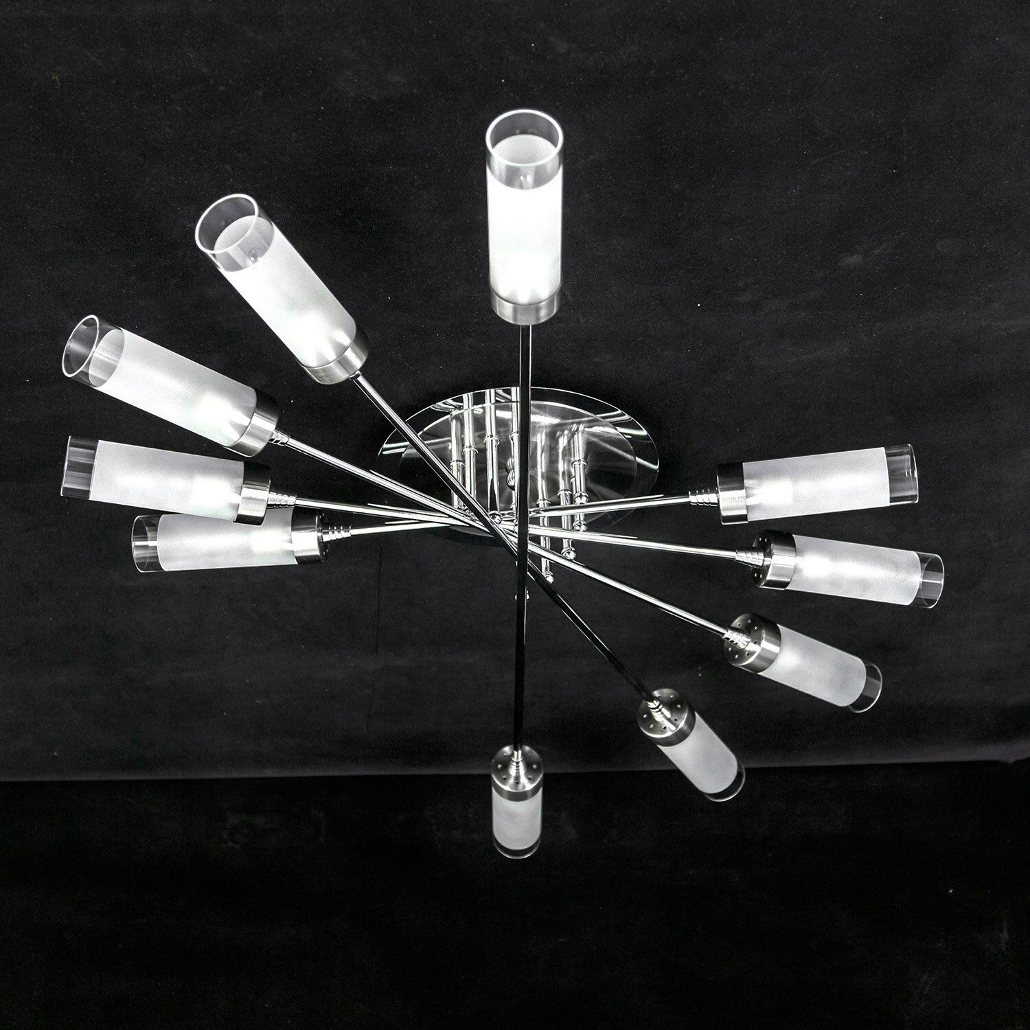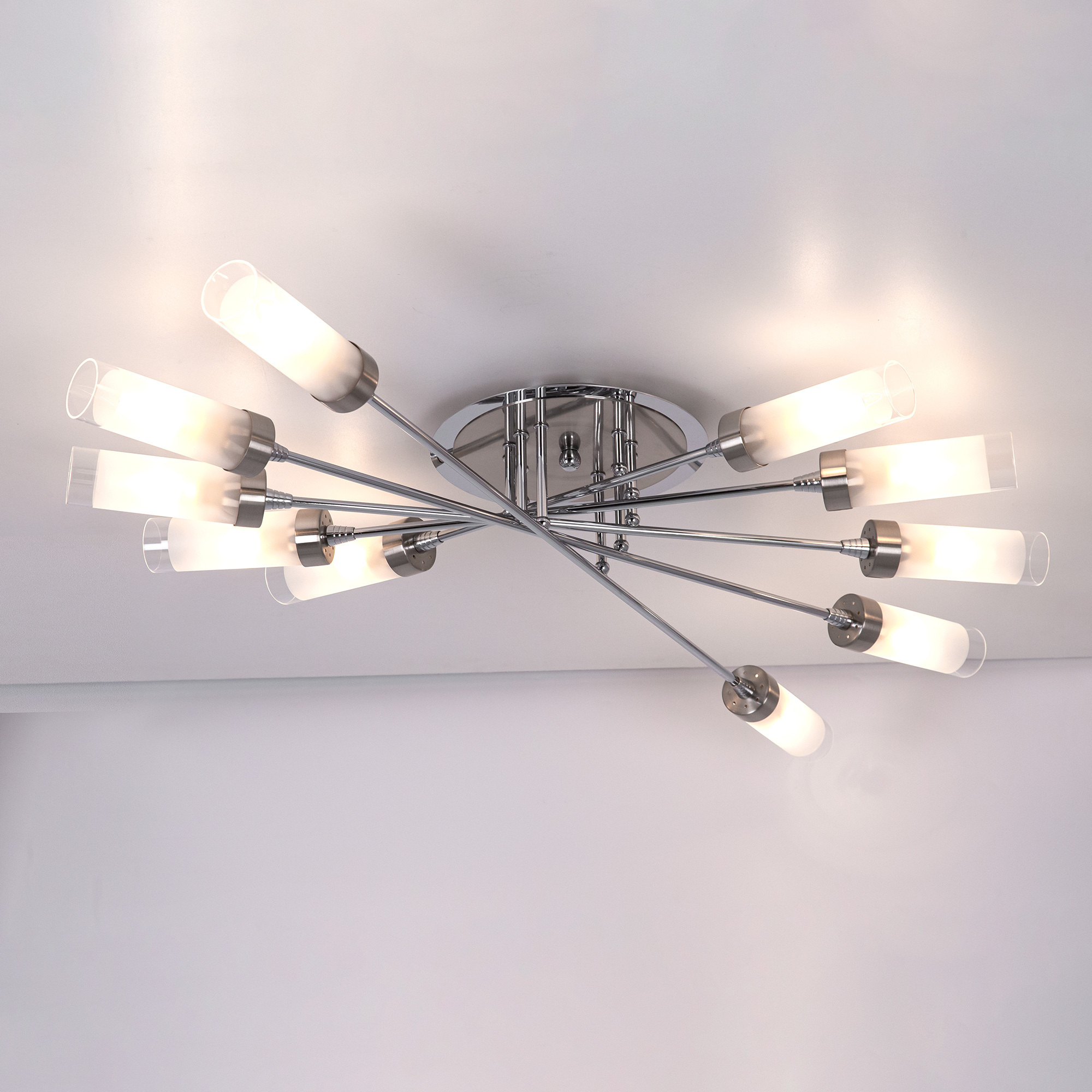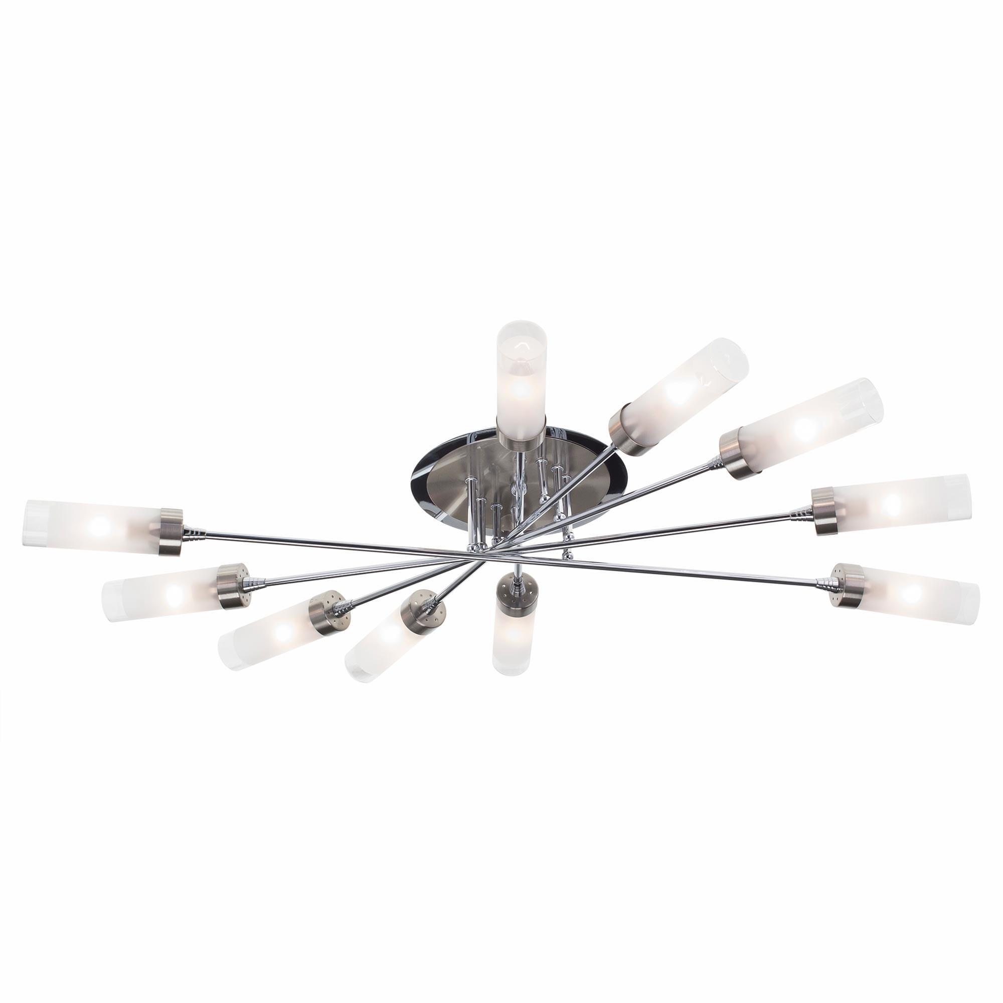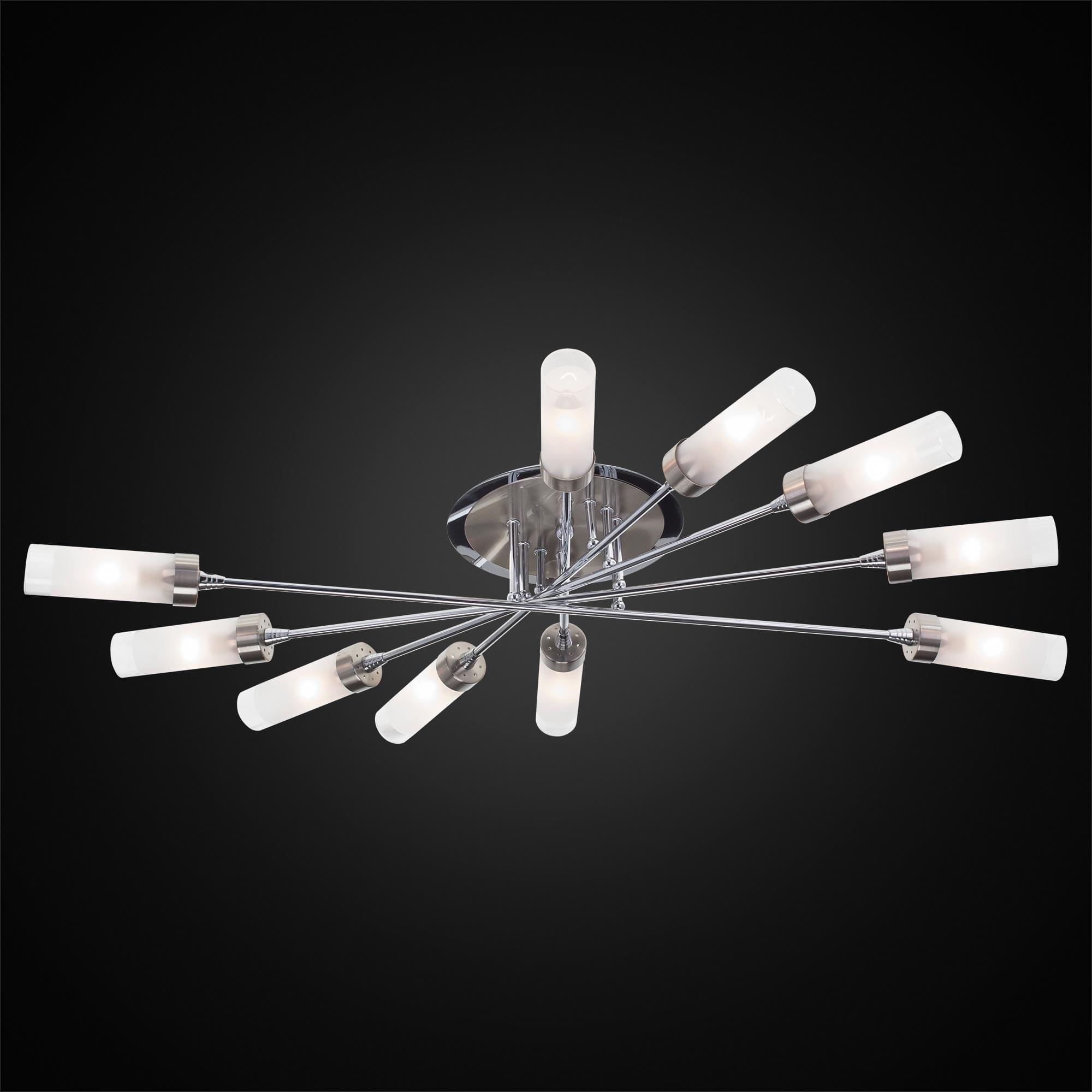 У люстр потолочных коллекции «Хеликс» плафоны расположены веером по кругу, что позволяет равномерно освещать все пространство помещения. Серия прекрасно подойдёт для разных типов комнат, таких как спальня, гостиная, кухня, прихожая. Плафоны имеют вытянутую форму и выполнены из белого полупрозрачного стекла. Плафоны очень легко одеваются на патрон рожка люстры и фиксируются на нем плотно с помощью специализированного пружинного механизма. Основание светильника покрашено в два цвета: хром и матовых хром. Модель сделана в современном стиле. Её выделяет качество сборки и то, что она изготовлена из надёжных, экологически чистых и прочных материалов. В конструкции используются термостойкие качественные патроны цоколя Е14, позволяющие применить лампы накаливания до 60 ватт, также можно использовать светодиодные лампочки любой мощности. Вытянутая форма плафона будет идеально смотреться с лампочкой в форме свечи. Люстра крепится на планку непосредственно к потолку. Подходит для монтажа на любой тип потолка, в том числе и натяжной. Данная десяти рожковая модель способна осветить помещения площадью до 28 квадратных метров.