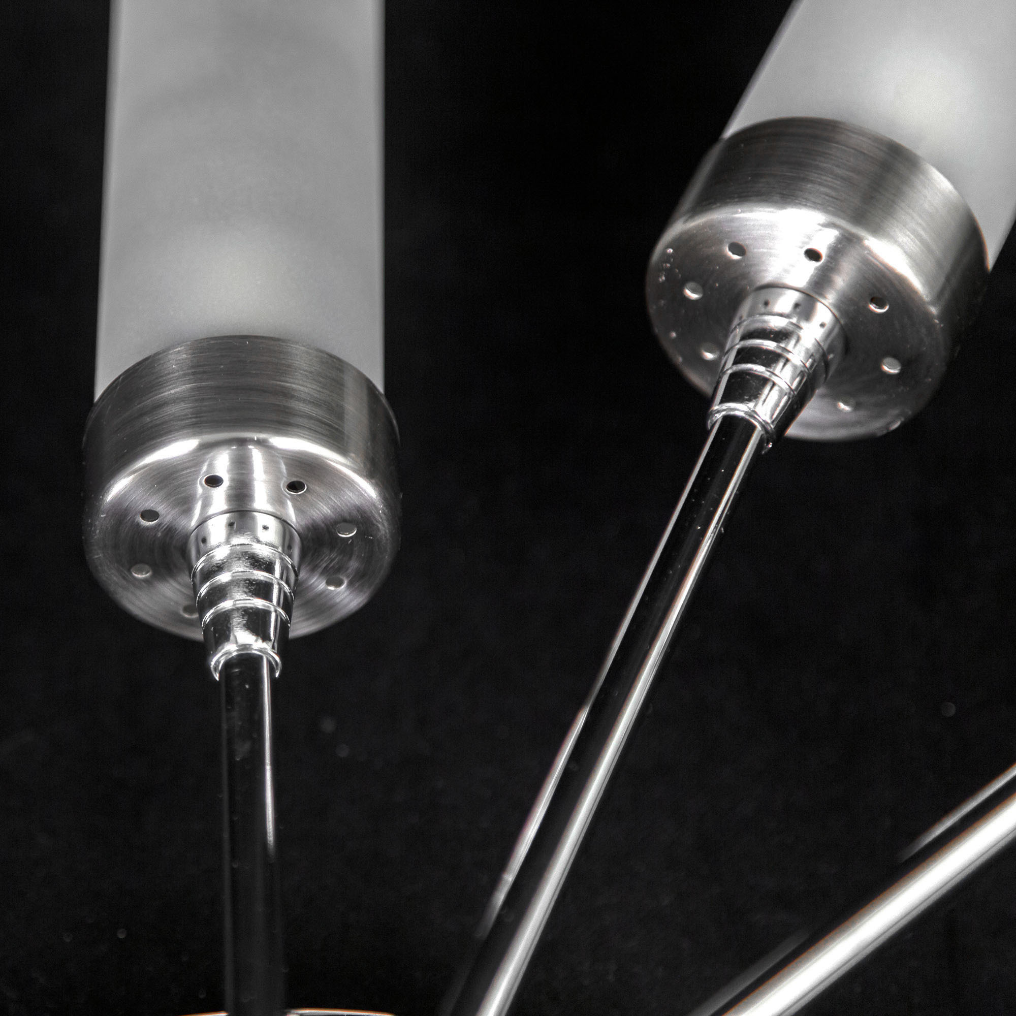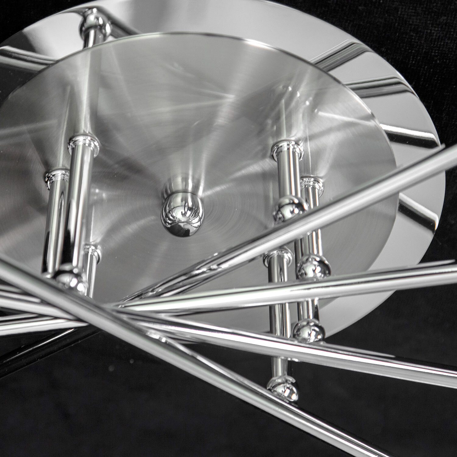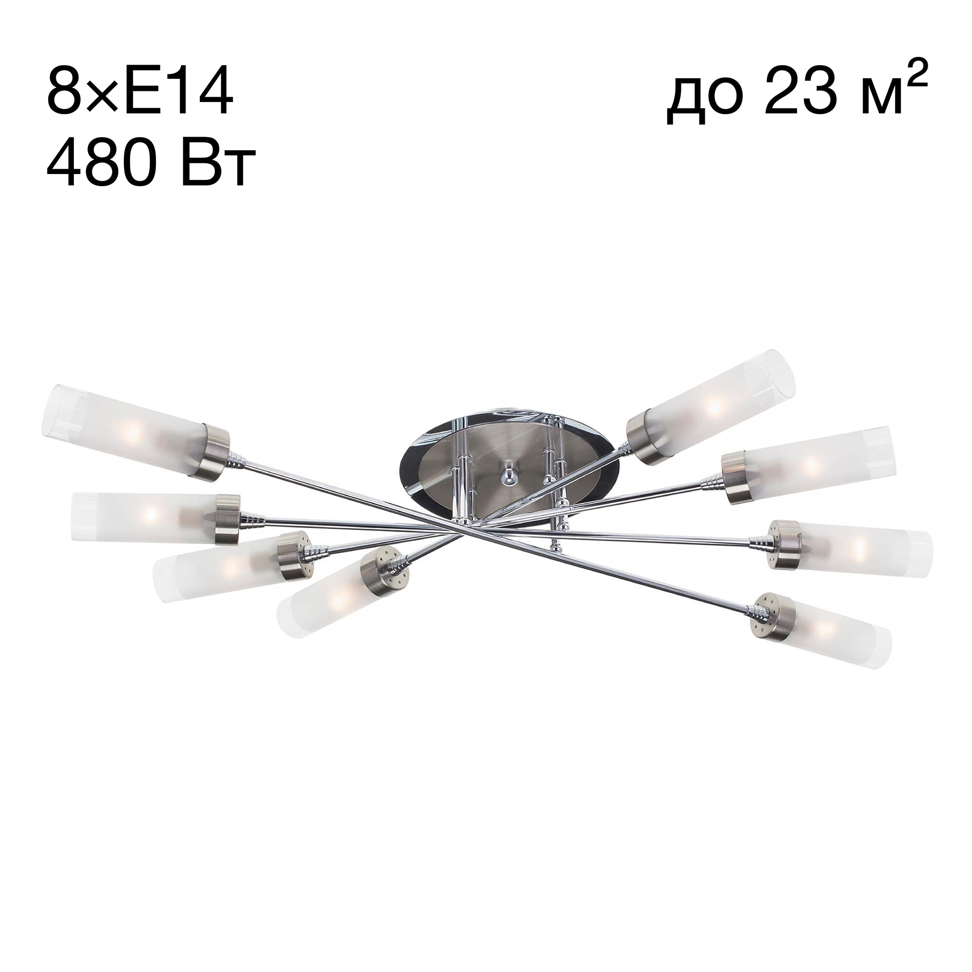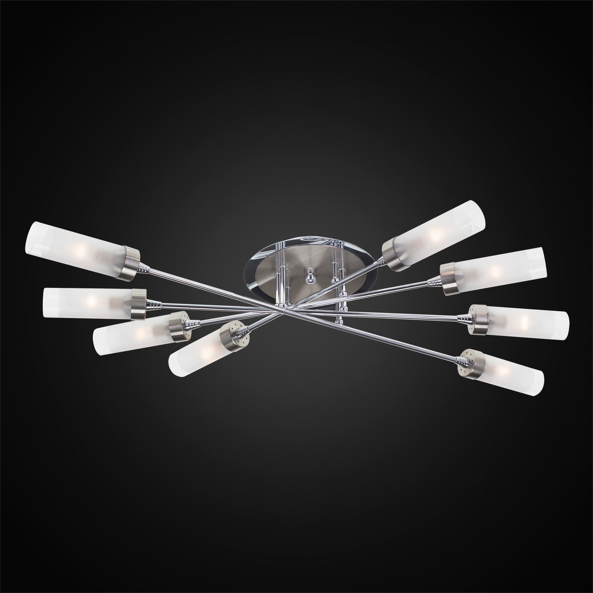 Люстра потолочная серии «Хеликс» на восемь рожков яркий представитель стиля хай тек. Светильник по высоте всего 15 сантиметров, за счёт такой компактности подойдёт для установки даже на самые низкие потолки. Конструкция очень пропорциональная, идеально будет смотреться в помещениях любой геометрической формы. Арматура светильника сделана из металла, плафоны из стекла. Арматура покрашена в два цвета – хром и хром матовый, что добавляет светильнику универсальности с точки зрения цветовой привязки в интерьере. Плафон очень удобно крепится с помощью прижимного пружинного механизма. Фактически при сборке он просто вставляется на своё место, сразу фиксируясь по центру. Такой способ крепления очень удобен с точки зрения замены лампочек. Плафон полупрозрачный, равномерно рассеивает свет на всё помещение, в том числе и на потолок, не оставляя тёмных углов. Площадь освещения до 23 квадратных метров. Модель в упаковке практически полностью собрана, нужно закрепить только плафоны. Электрика разведена с завода на двойной выключатель, с первой клавиши включается 4 рожка по краям, со второй 4 рожка по центру. При желании можно коммутацию переделать так, как для вас это удобно, все провода выведены в основание люстры.