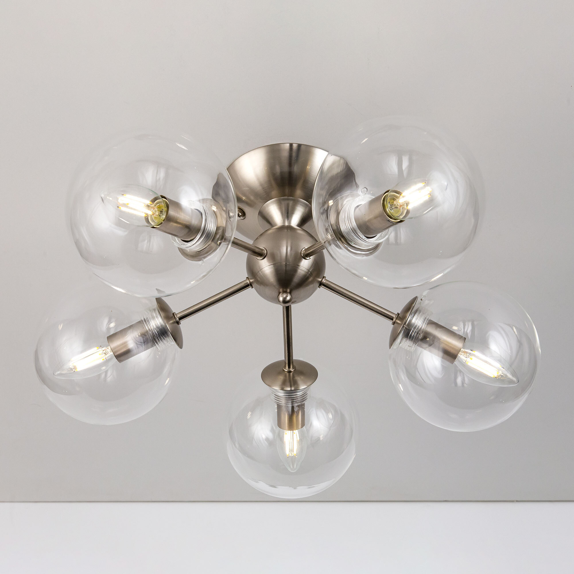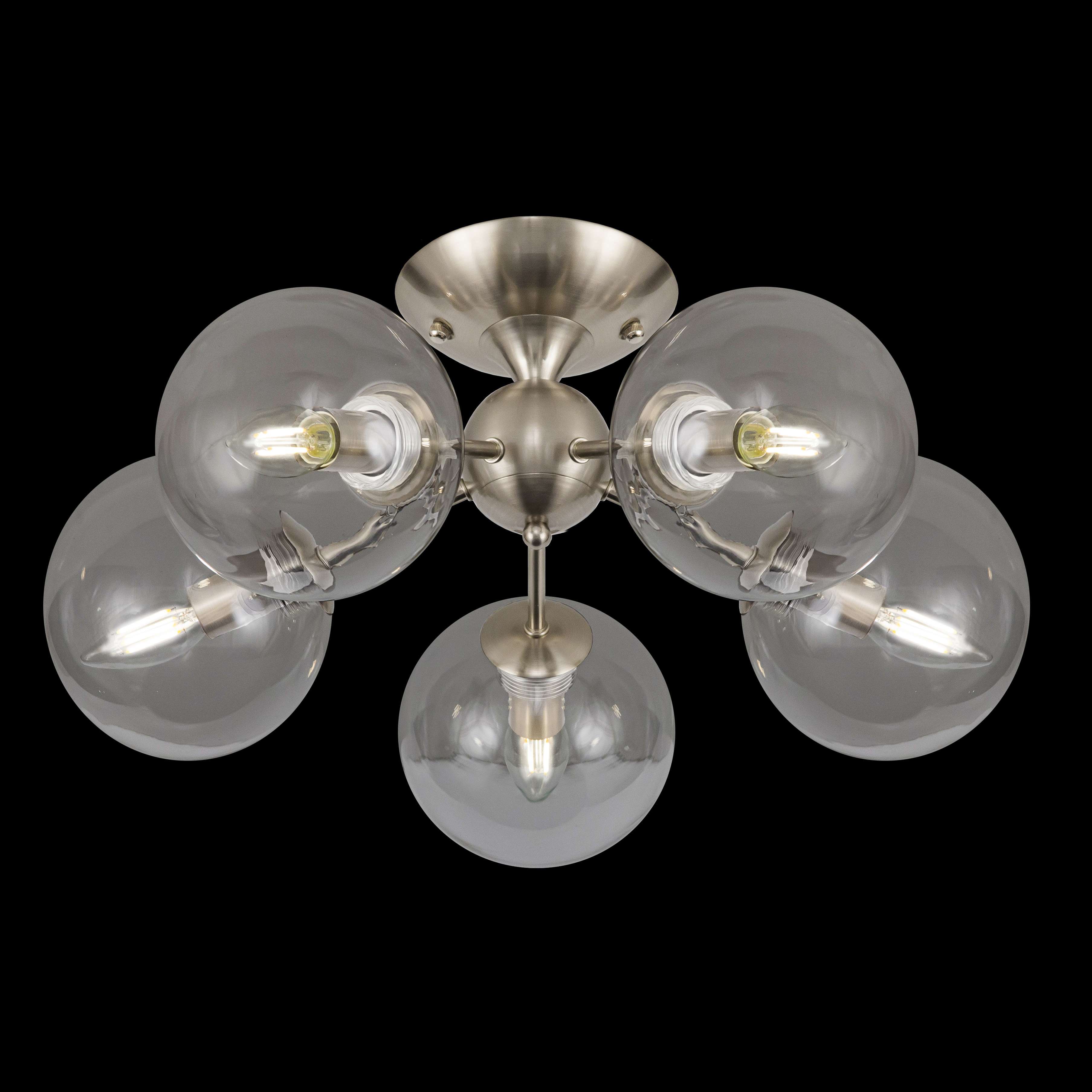 Потолочная люстра CL102151 с пятью плафонами. Корпус люстры изготовлен из металла, цвет матовый хром. Плафоны стеклянные в форме шара, прозрачные. В люстре используются 5 ламп с цоколем Е14 мощностью 40 Вт. Суммарная мощность люстры 200 Вт при использовании ламп накаливания. Площадь освещения около 12 кв. метров. Люстра крепиться к потолку на планку, крепеж в комплекте.Citilux CL102 TOMMY: Вдохновение в каждом луче.