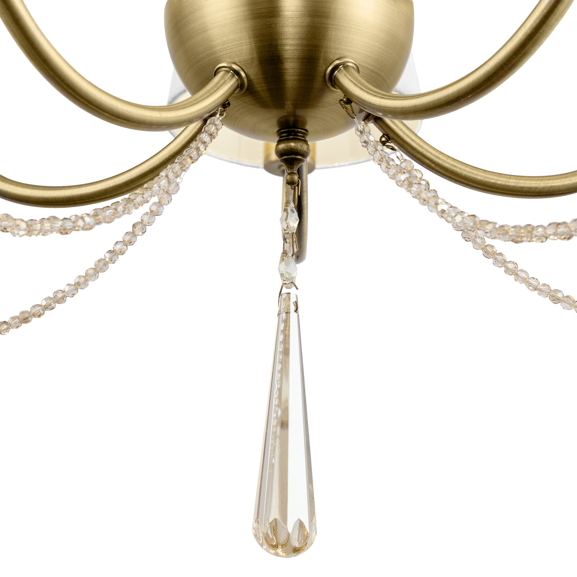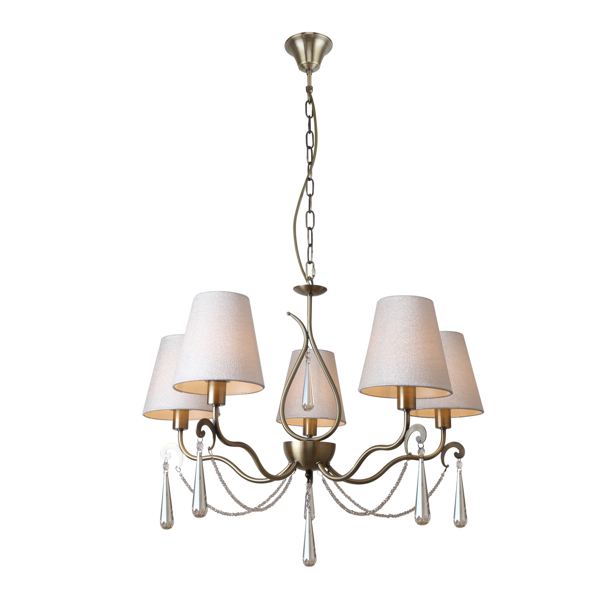 Металлическая арматура. Цвет – латунь. Абажуры из фактурной ткани белого цвета. Декор – хрустальные подвесы каплевидной формы. Одиночный подвес и торшер с цоколем Е27, лампа, бра и люстры – Е14.