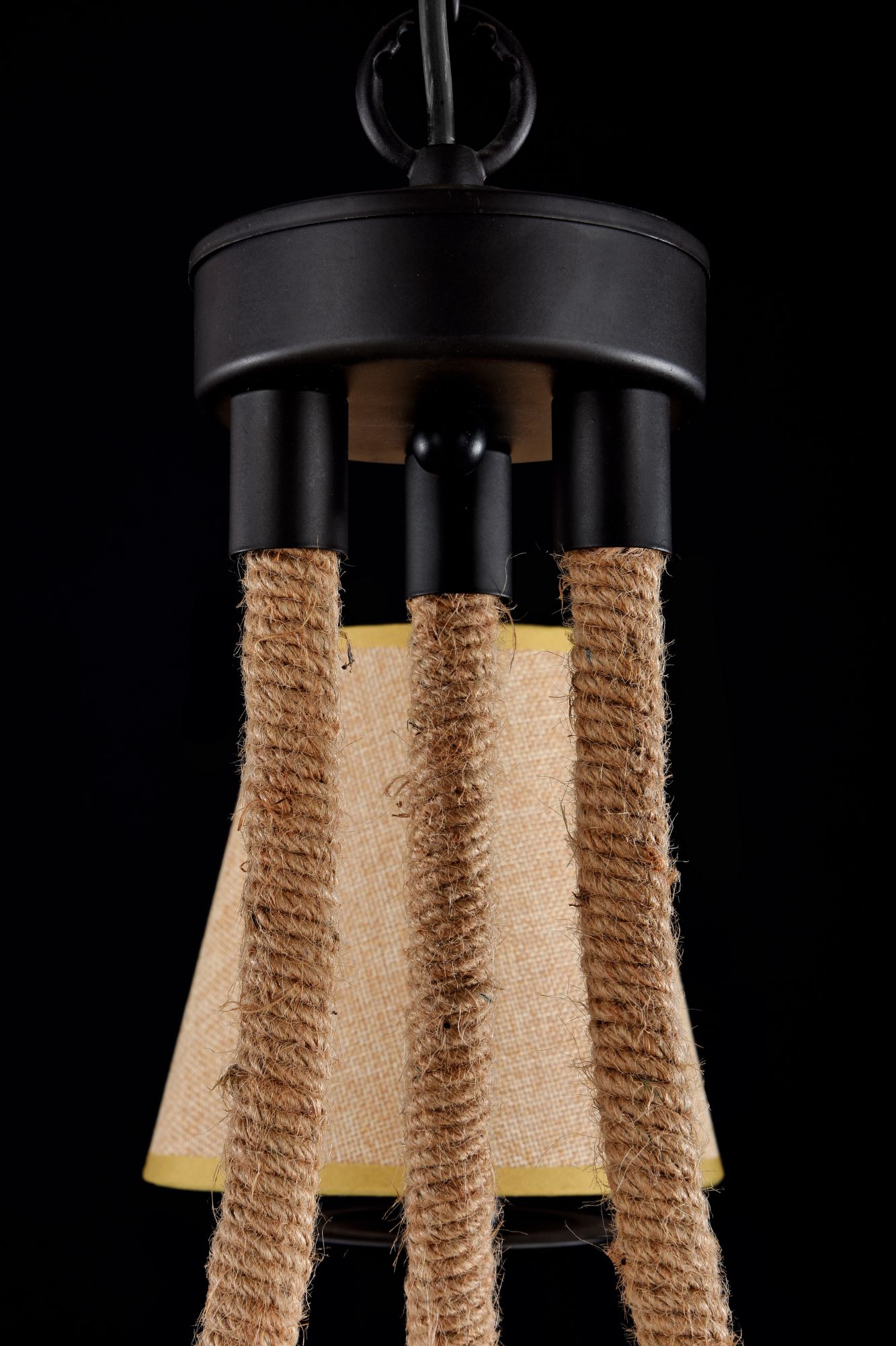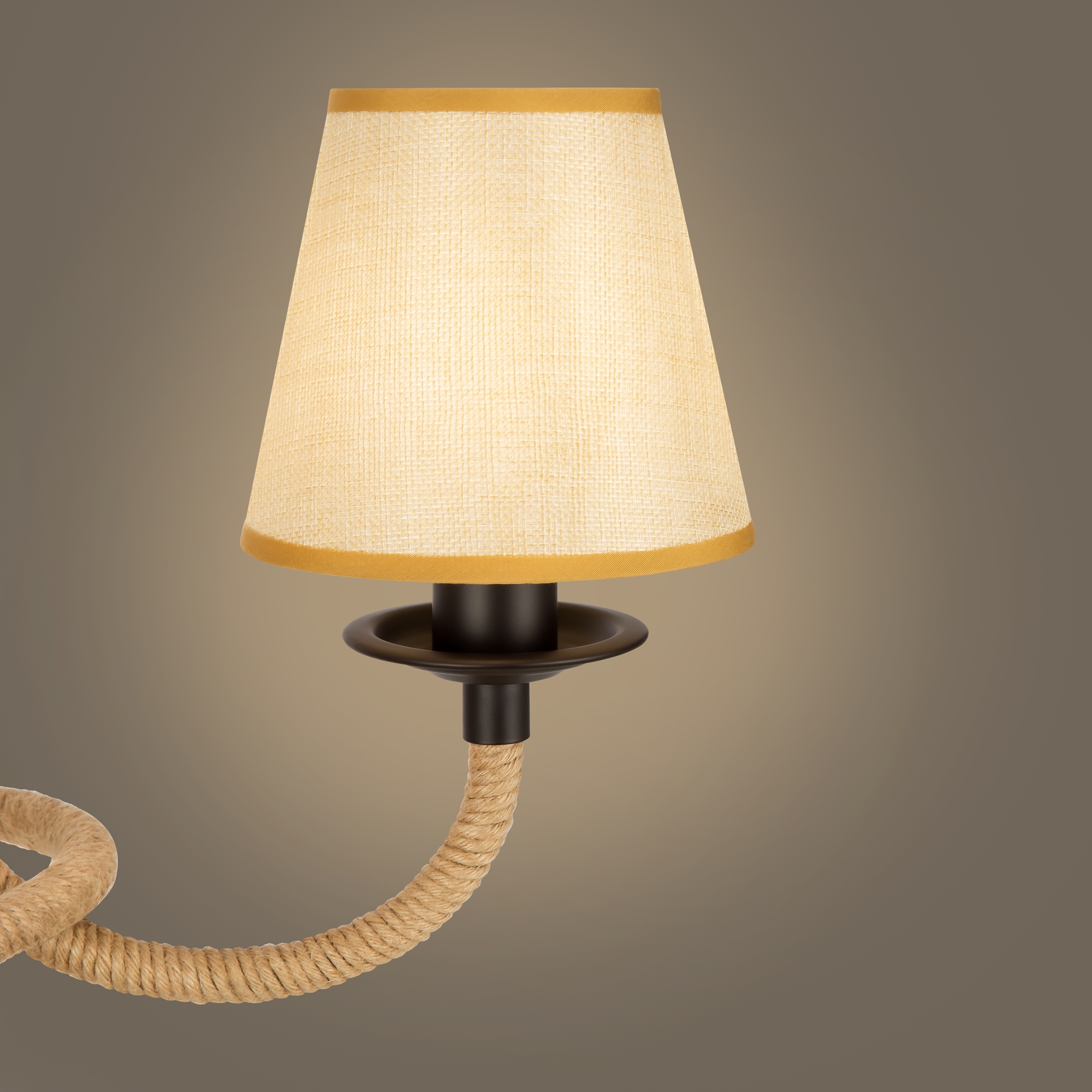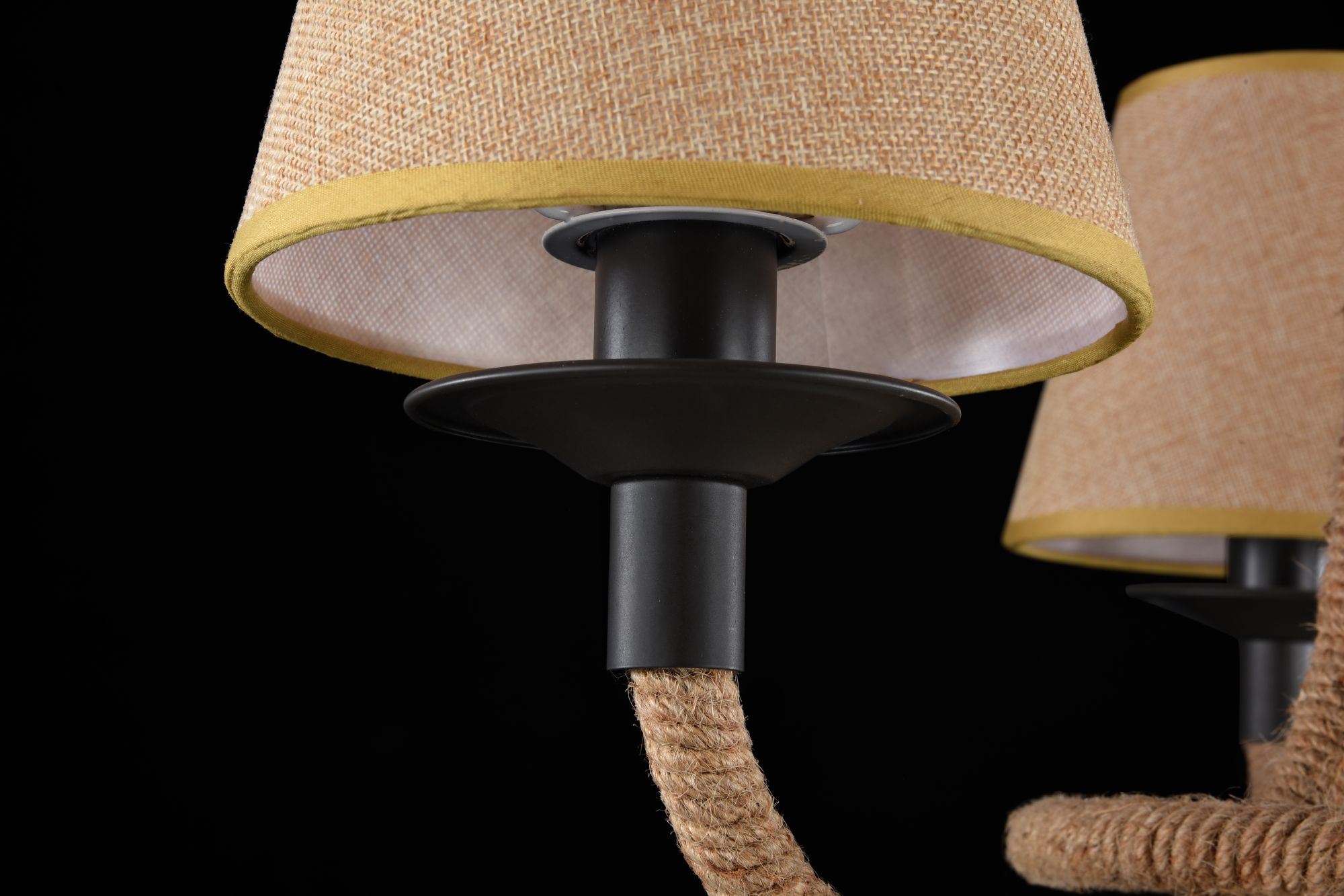 Серия светильников создана под влиянием основных принципов эко-дизайна, с использованием натуральных материалов для предметов интерьера. Арматура люстры из матового черного металла гармонично сочетается с абажурами из холщовой натуральной ткани. Рожки и центральная часть люстры плотно обвиты холщовой веревкой. Окантовка на верхней и нижней части абажура желто-песочного цвета.