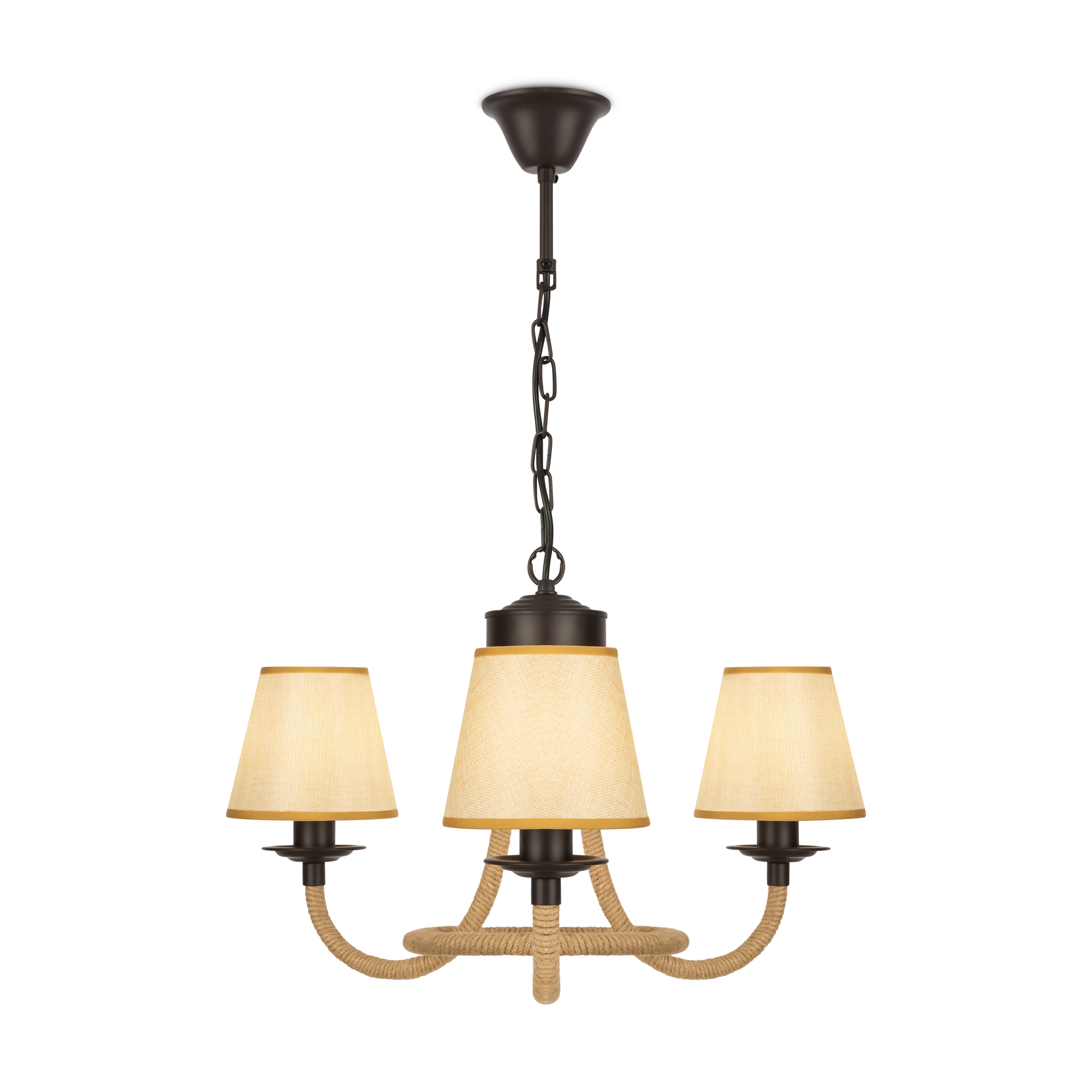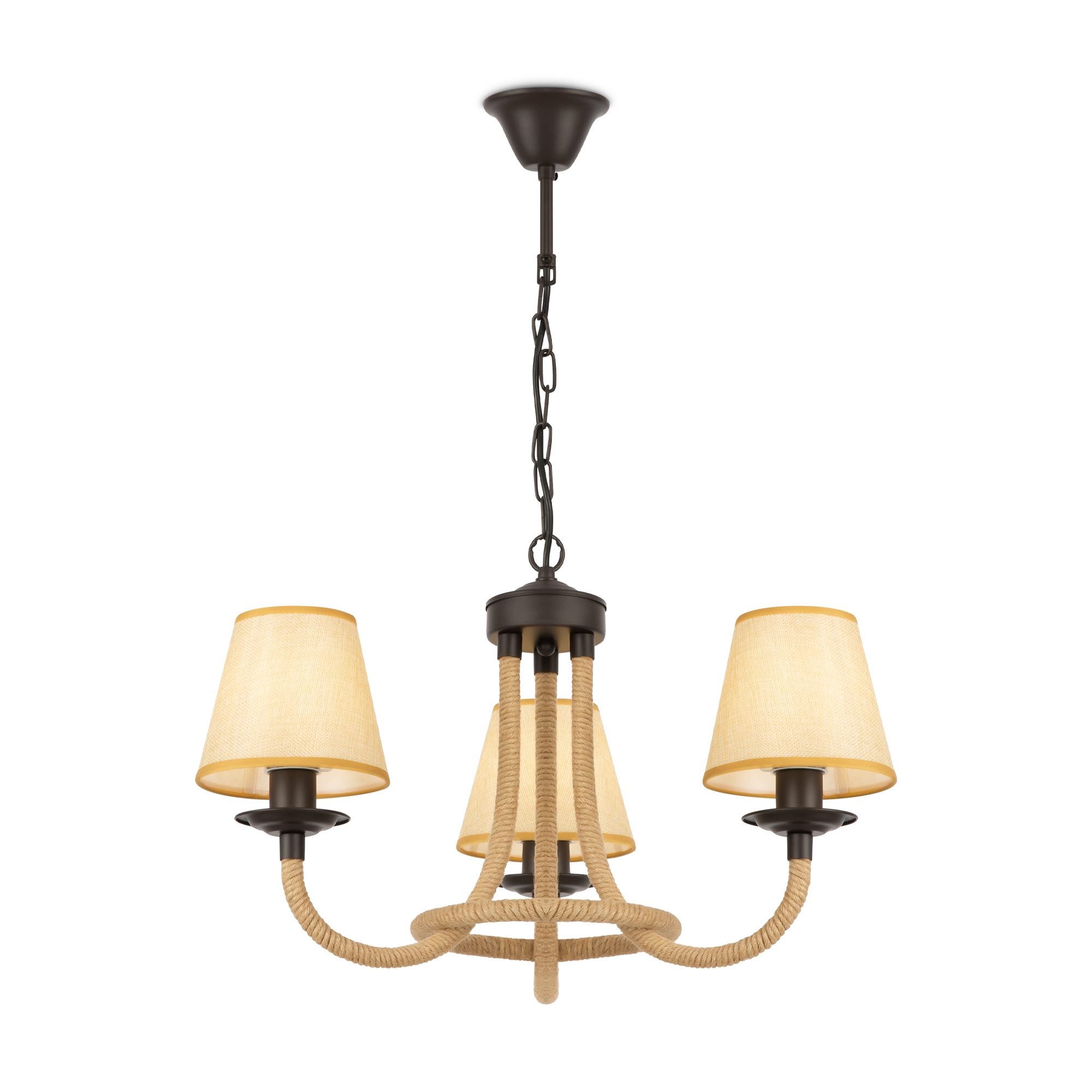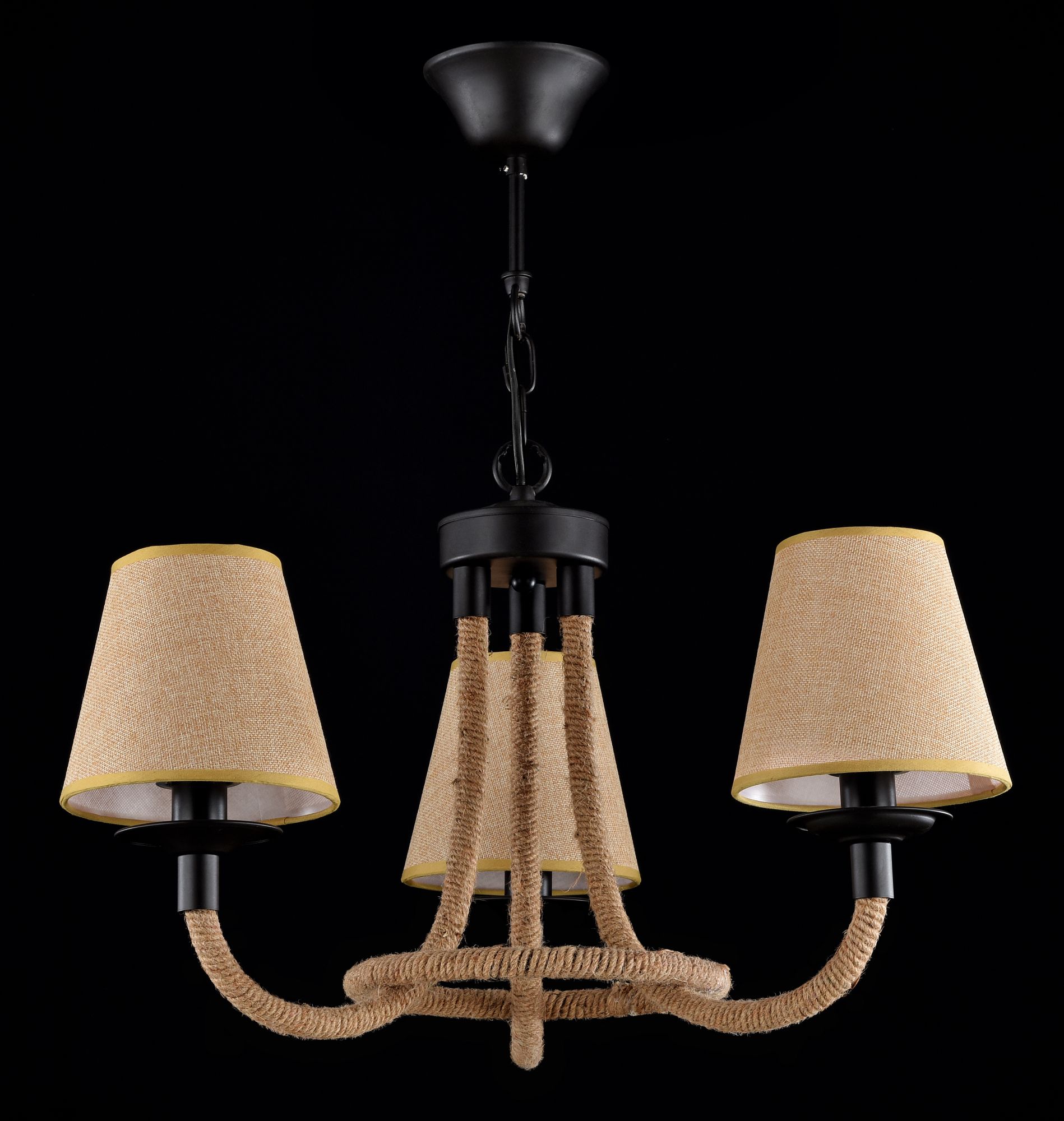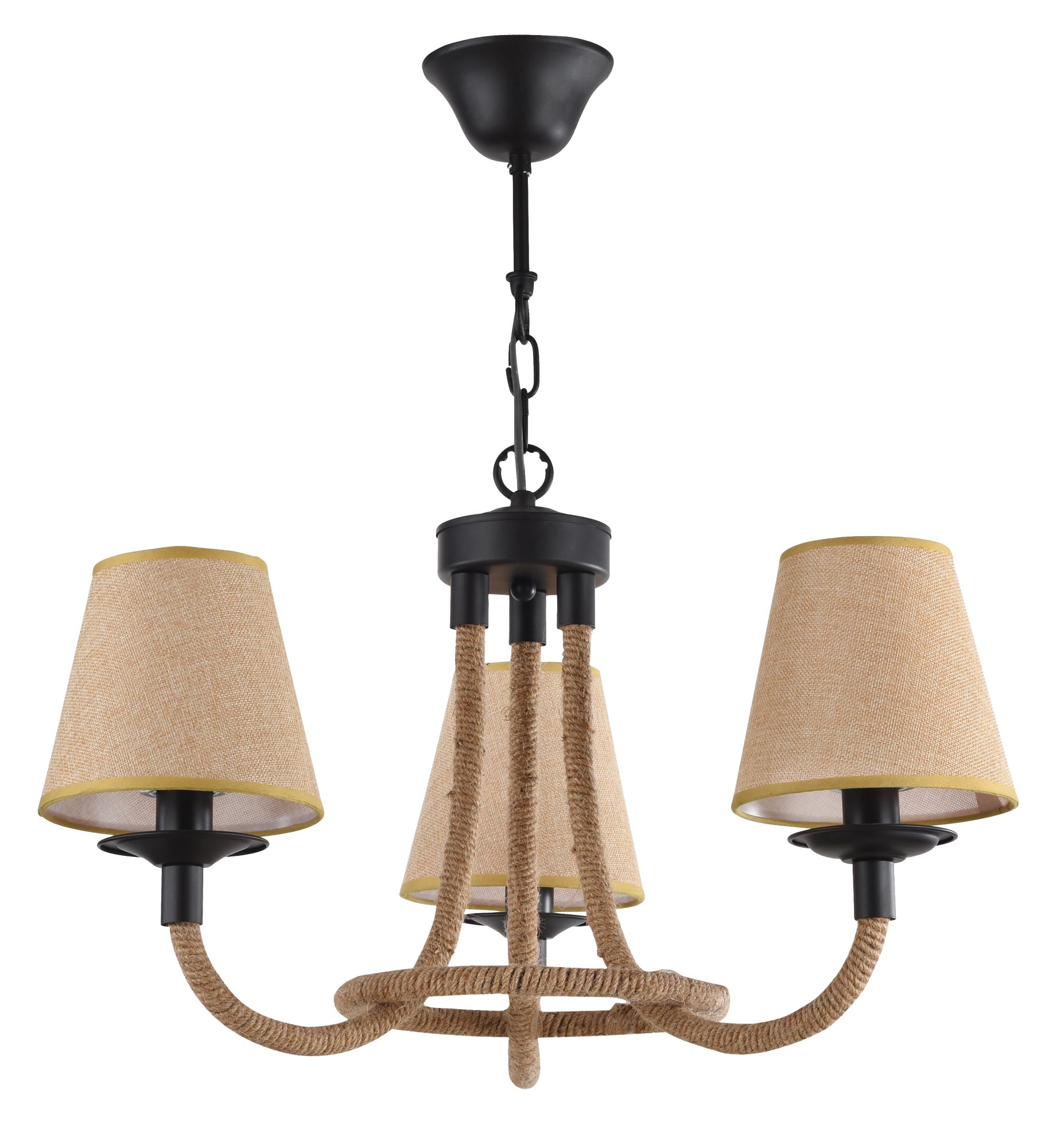 Серия светильников создана под влиянием основных принципов эко-дизайна, с использованием натуральных материалов для предметов интерьера. Арматура люстры из матового черного металла гармонично сочетается с абажурами из холщовой натуральной ткани. Рожки и центральная часть люстры плотно обвиты холщовой веревкой. Окантовка на верхней и нижней части абажура желто-песочного цвета.