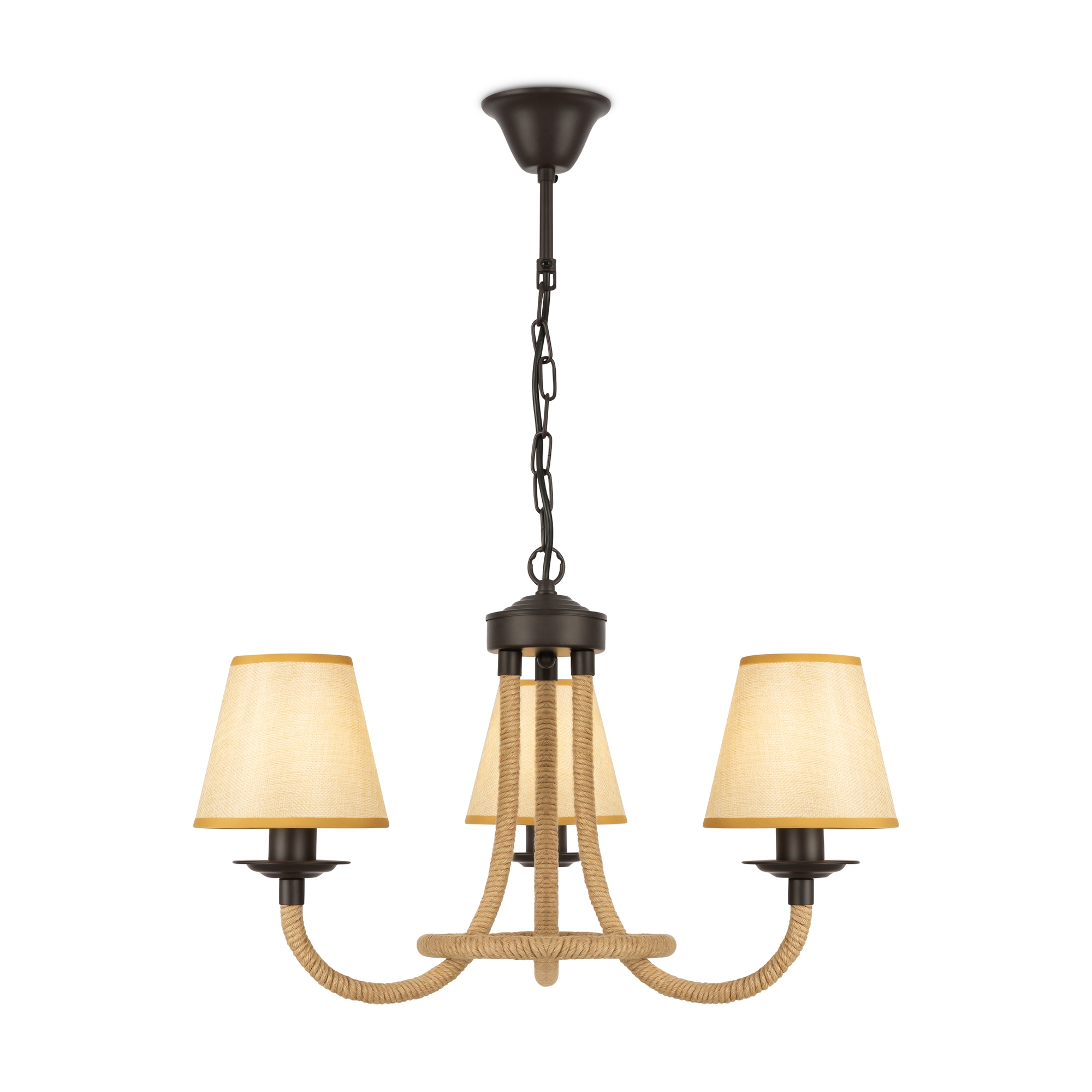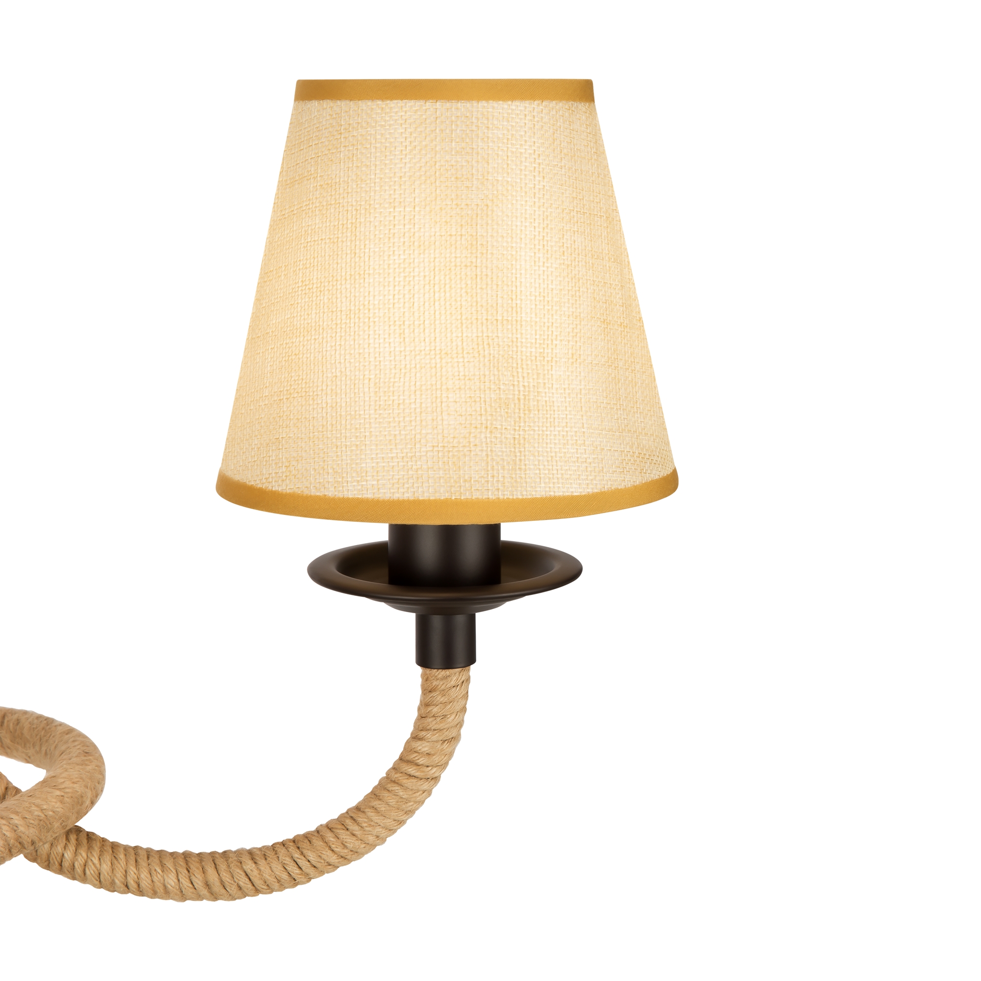 Серия светильников создана под влиянием основных принципов эко-дизайна, с использованием натуральных материалов для предметов интерьера. Арматура люстры из матового черного металла с легким золотым патинированием гармонично сочетается с абажурами из холщовой натуральной ткани. Рожки и центральная часть люстры плотно обвиты холщовой веревкой. Окантовка на верхней и нижней части абажура желто-песочного цвета.