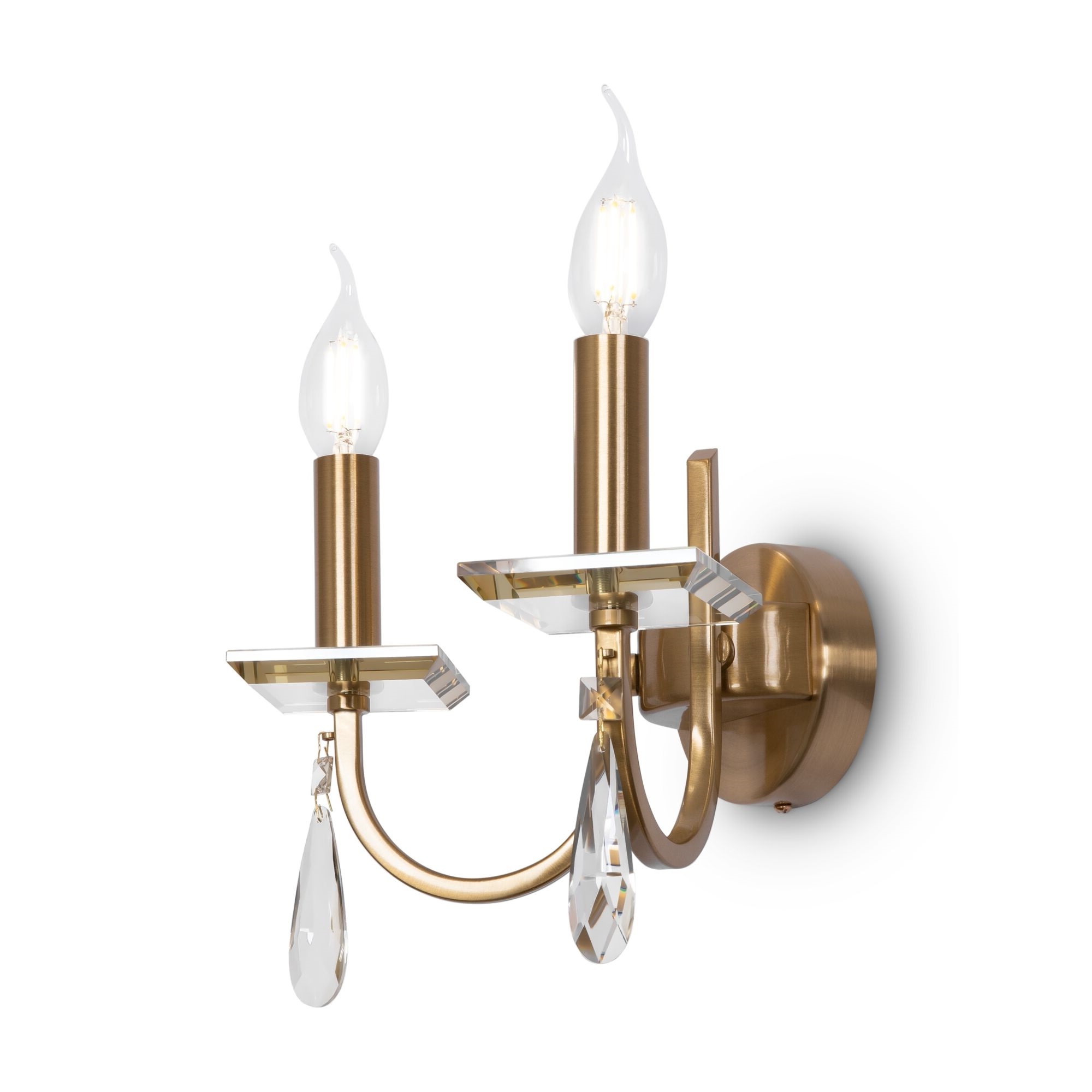Металлическая арматура в двух оттенках: латунь и никель. Классическая форма плафона в виде свечи. Торшер и настольная лампа имеют тканевые абажуры. Белые – для арматуры цвета никель, оттенка кремовый шампань – для латунной. Декор – прозрачные хрустальные подвесы каплевидной формы. Торшер с цоколем Е27, лампа, бра и люстры – Е14.