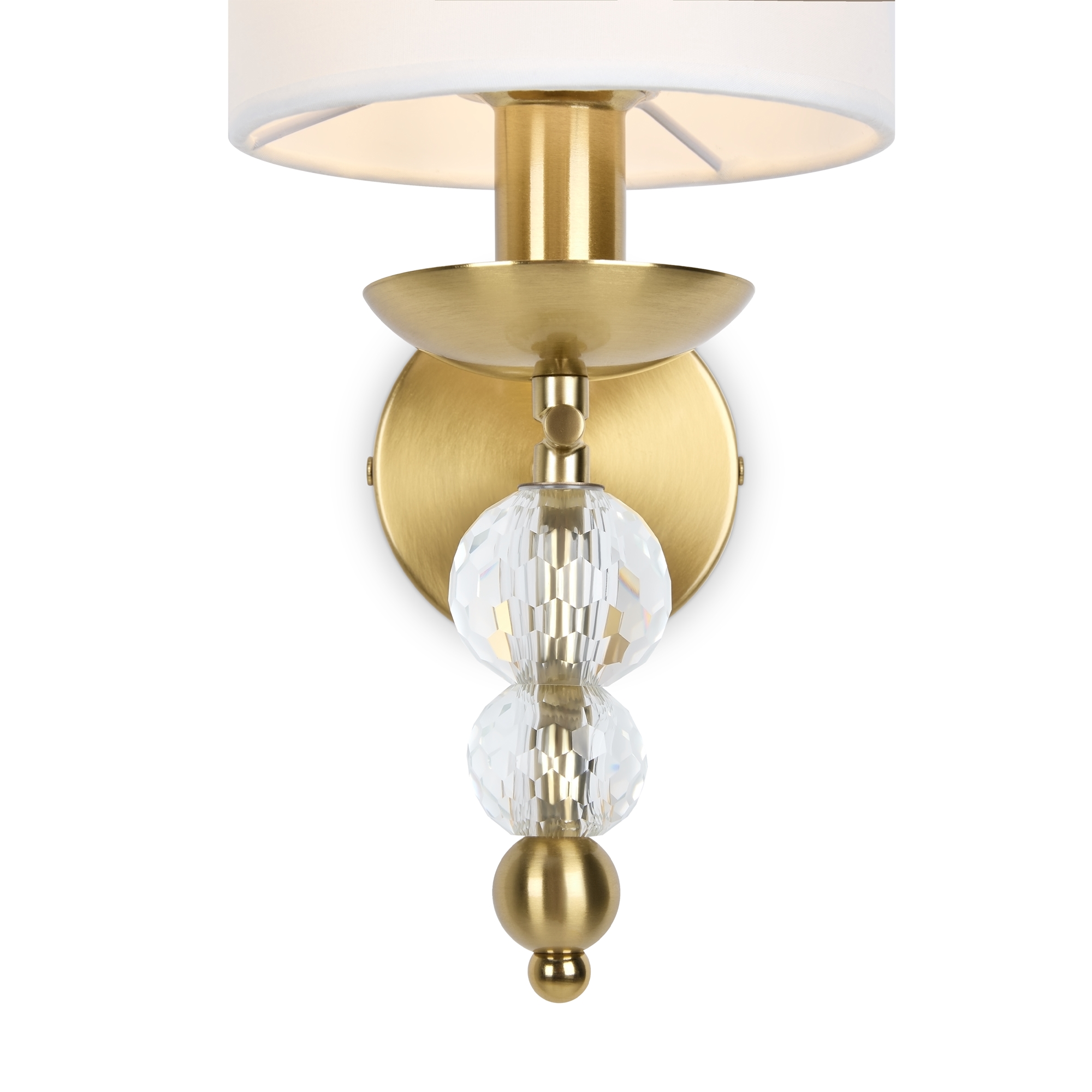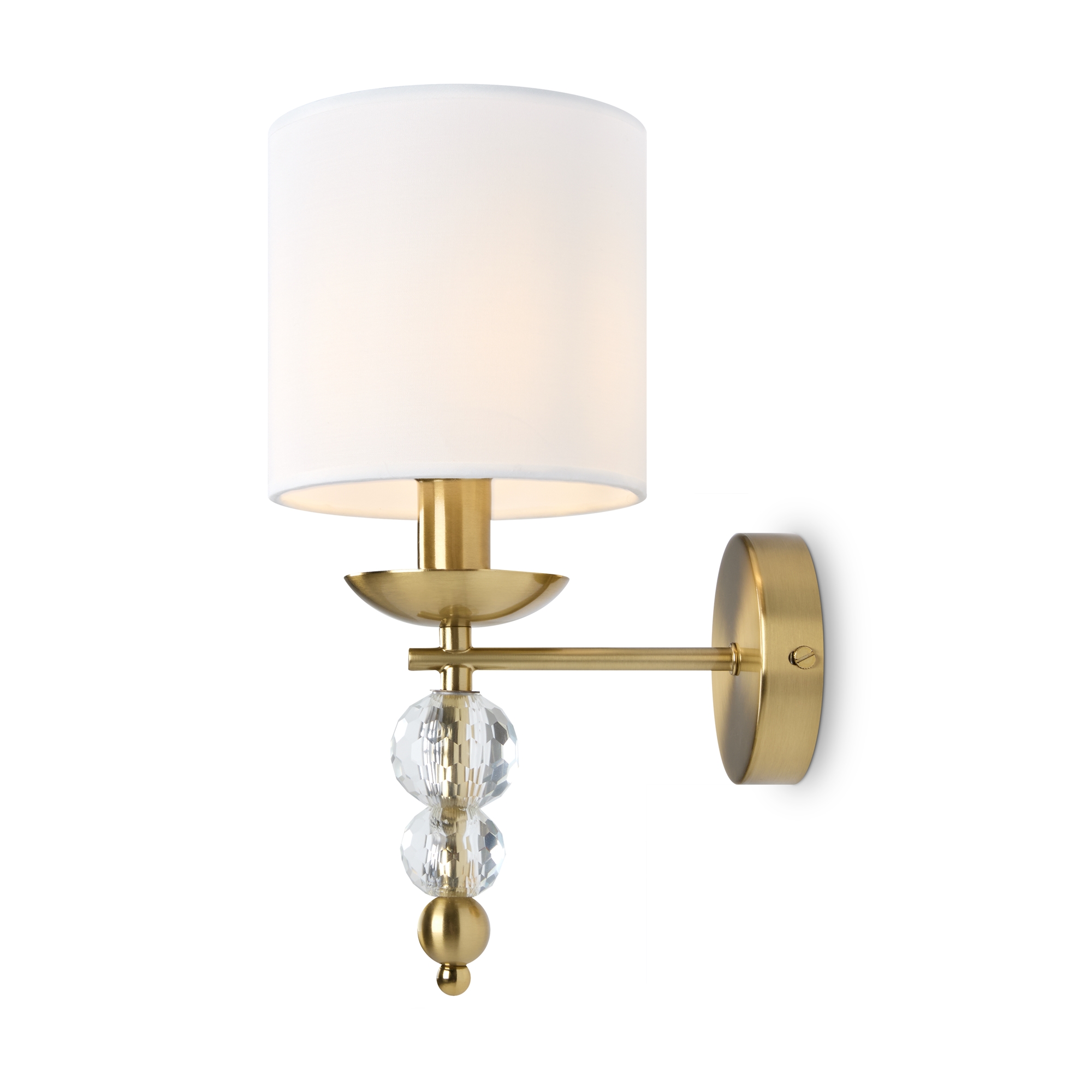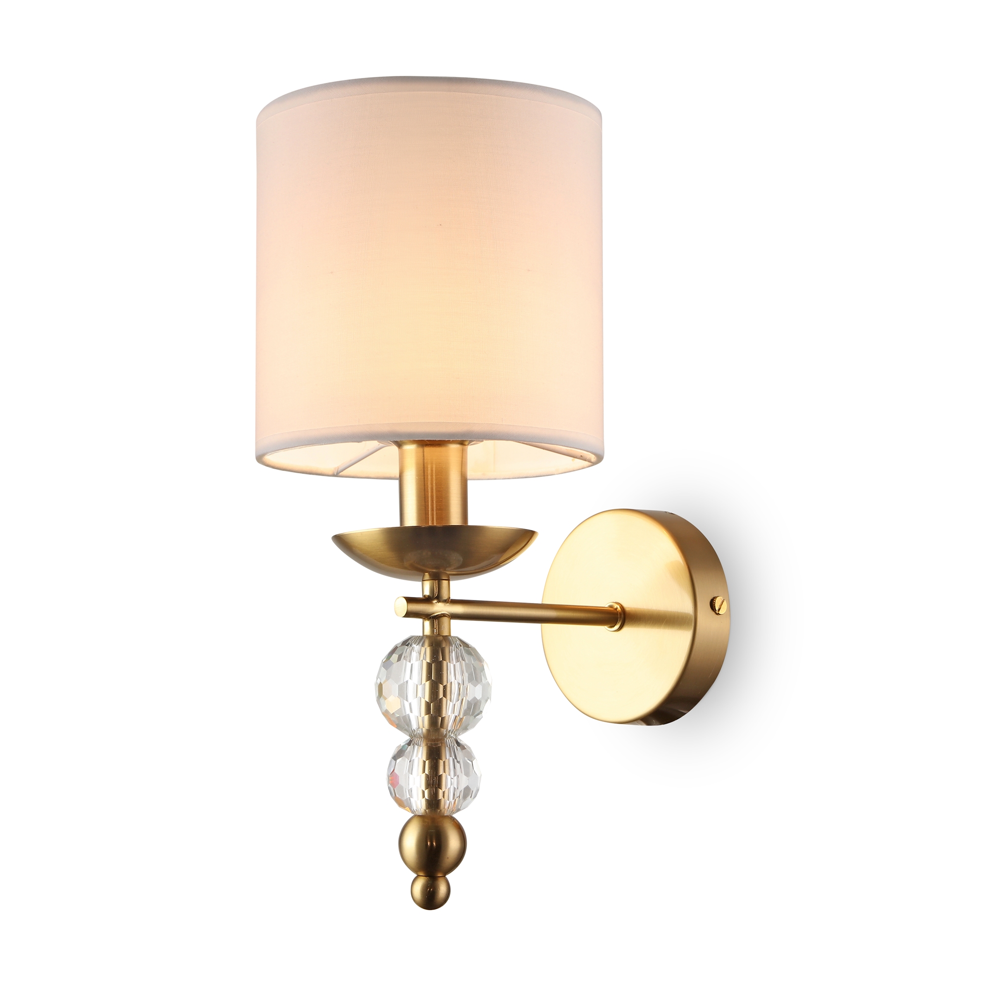 Материал абажура — ткань, цвет — белый. Металлическая арматура в цвете латунь обрамлена хрустальными бусинами. Источник света — лампы с цоколем Е14. Степень защиты — IP20.