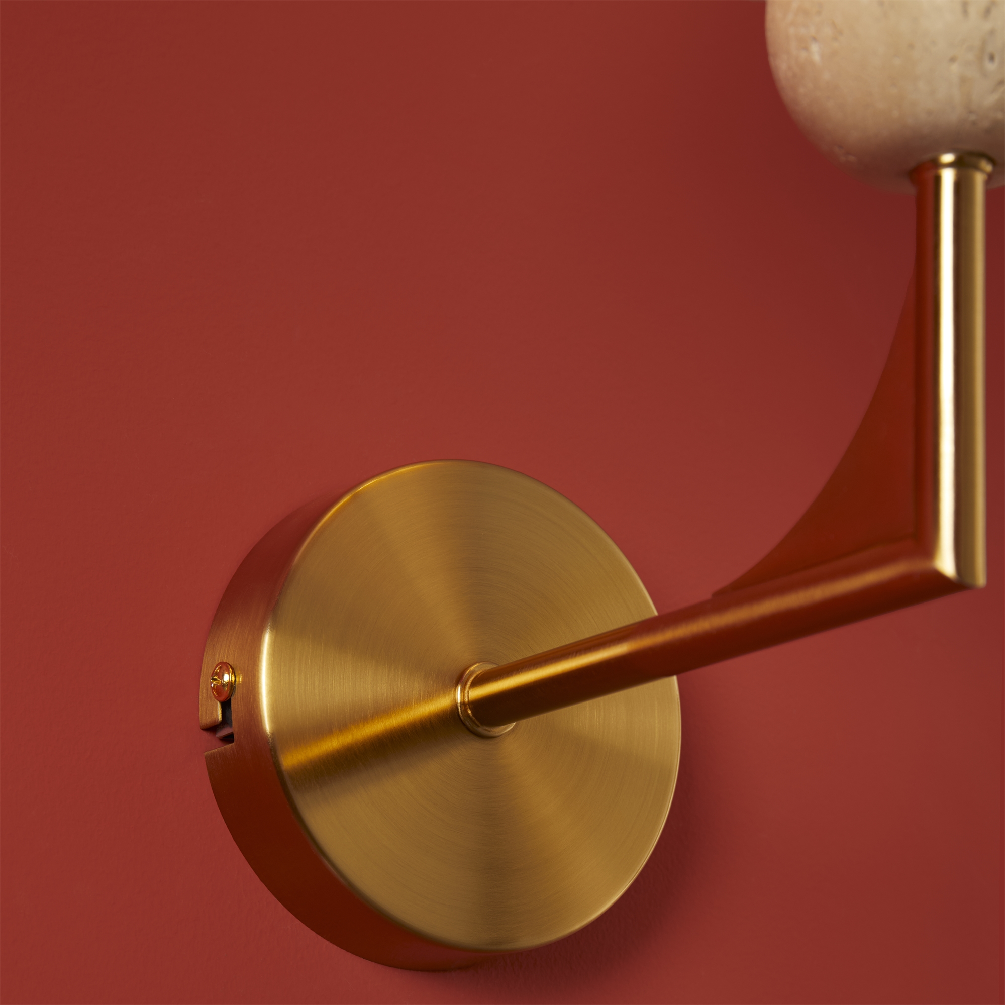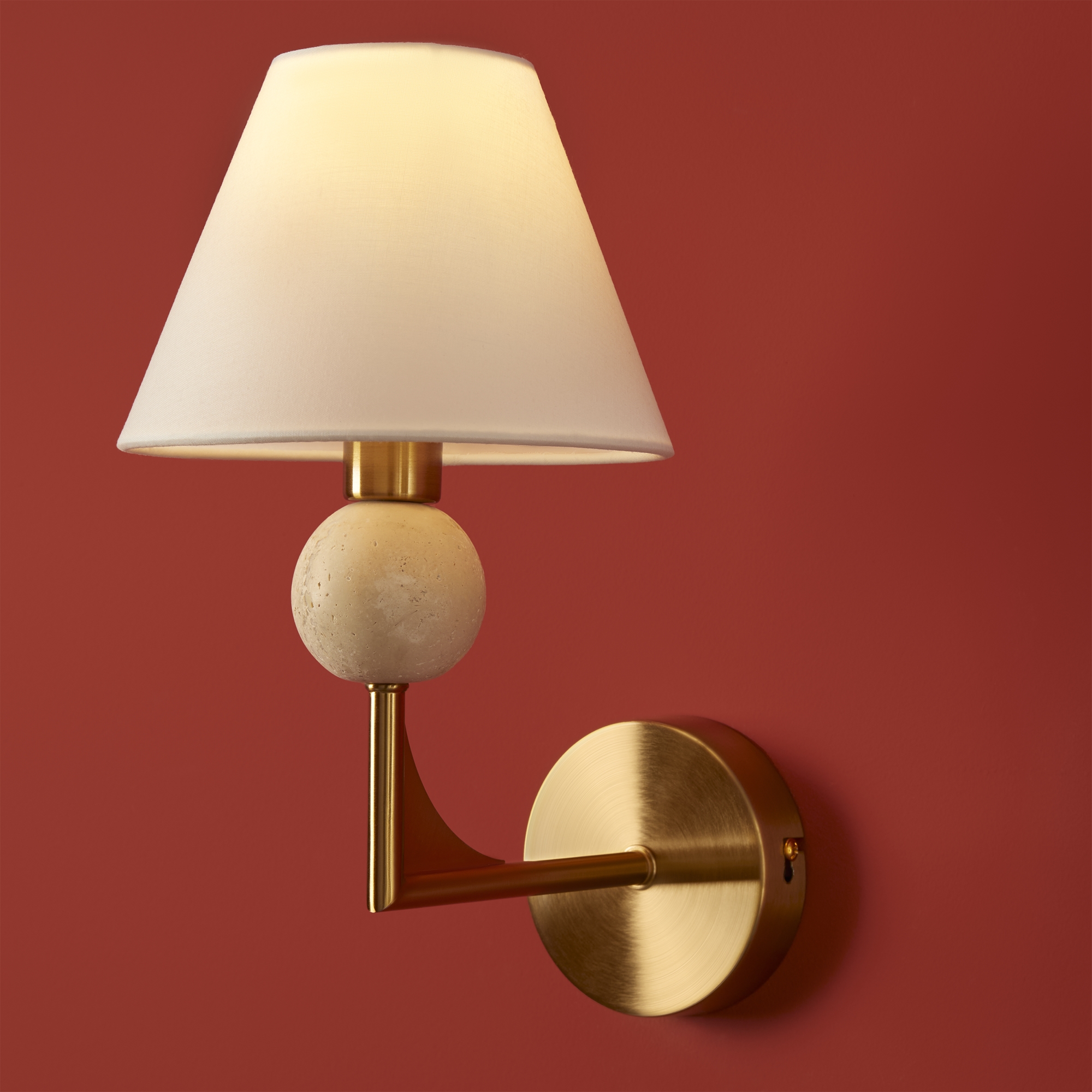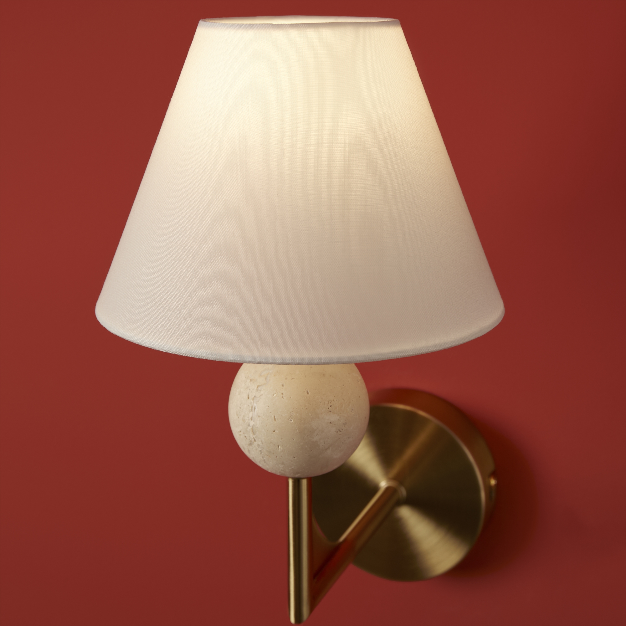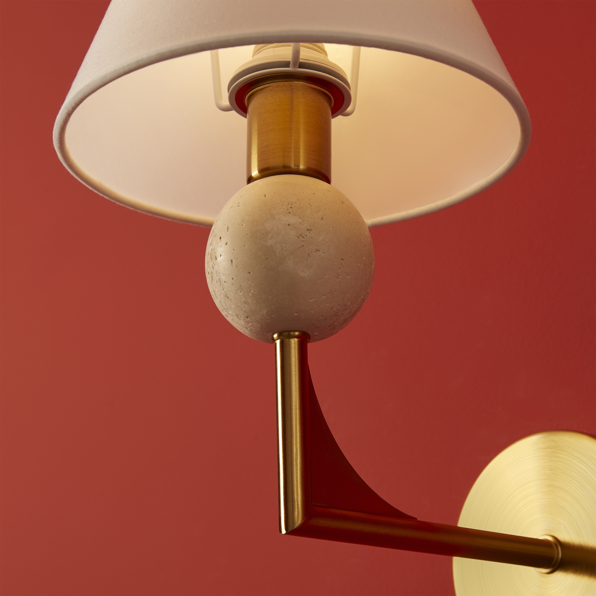 Материал арматуры — металл. Цвет металла — латунь. Абажуры выполнены из белой ткани, которые мягко рассеивают свет. Потолочные и настенные светильники с цоколем E14. Декоративные элементы в форме шара на плафоне выполнены из травертина. Металлическая форма арматуры строгой геометрической формы с пластинами из латуни. Подходит для оформления элегантных классических пространств.