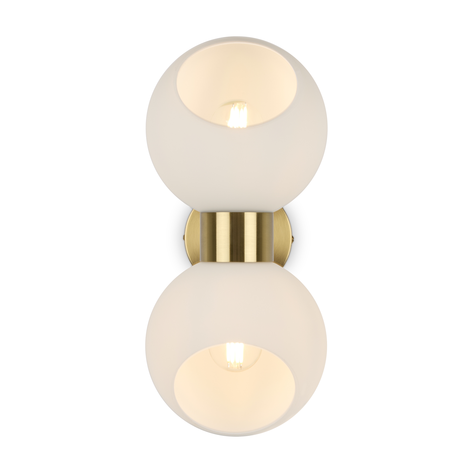 Металлическая арматура в цвете латунь. Открытые сферические плафоны в 2-х цветах: тёплый белый и тёмный гальванизированный. Плафоны разделены металлической вставкой в цвет арматуры. Источником света является лампа с цоколем G9. Для бра - цоколь Е27.