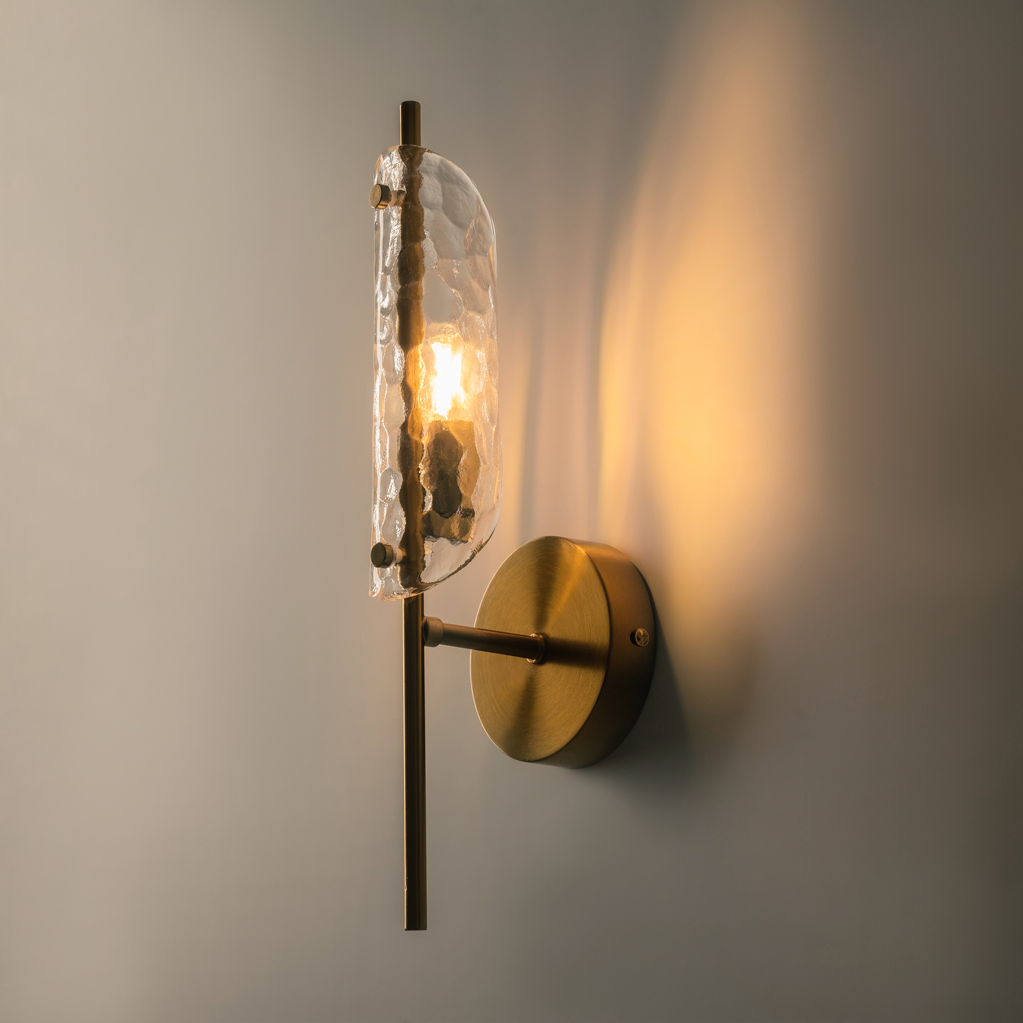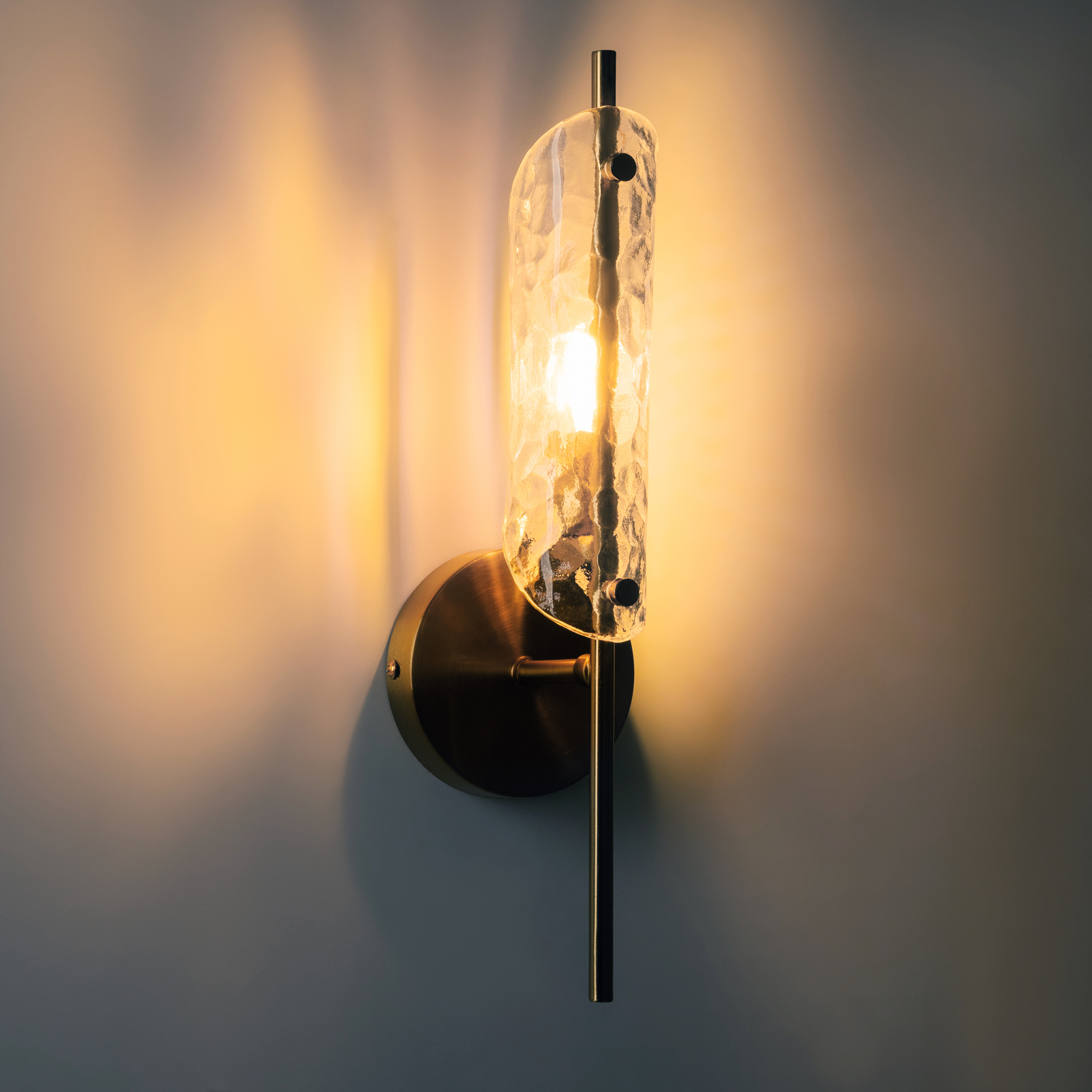 Металлический корпус, цвет— латунь. Плафон, моделированный под вытянутый лепесток с эффектом чеканки на стекле. Источник света — лампа с цоколем G9 и максимальной мощностью 30W дает яркое и равномерное освещение. Компактная высота – идеальное решение для низких потолков.