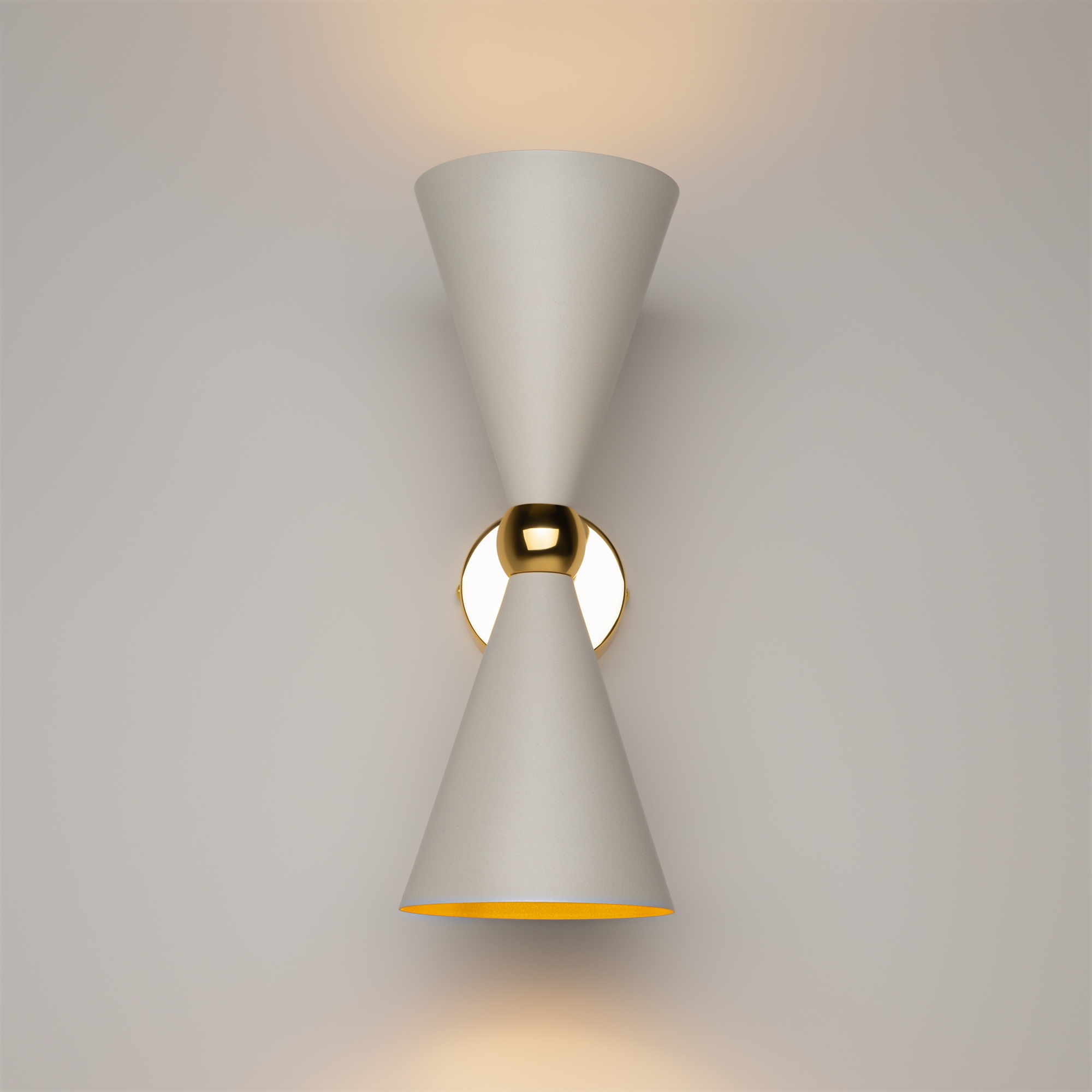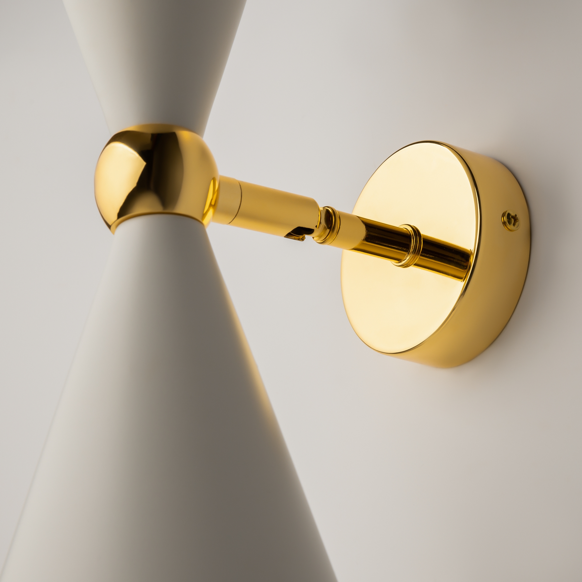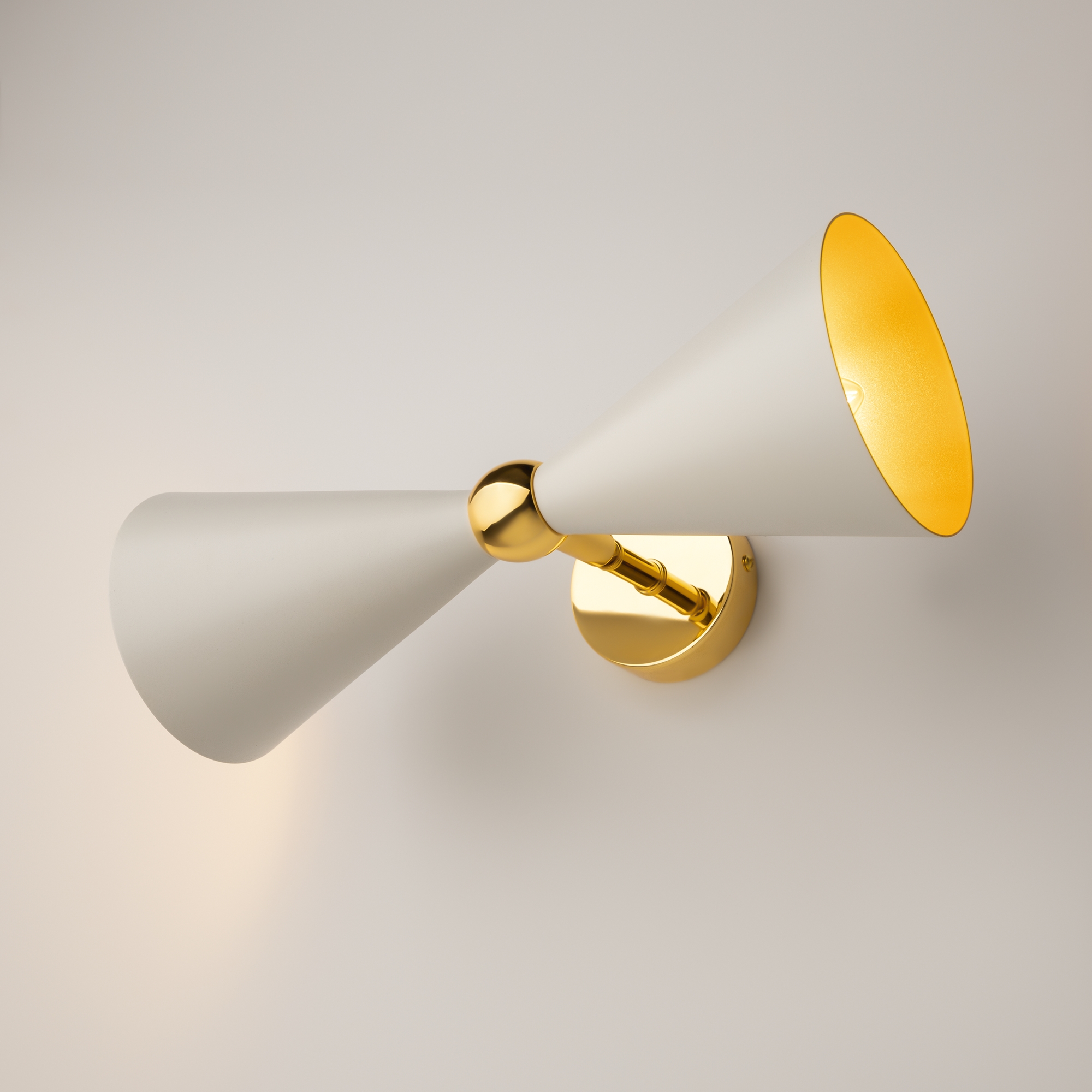 Материал арматуры - металл, оттенок – золото. Металлические плафоны изнутри окрашены в золотой цвет. Внешняя сторона в двух вариантах оттенков: черный и белый. Поворотный механизм, рожки вращаются.