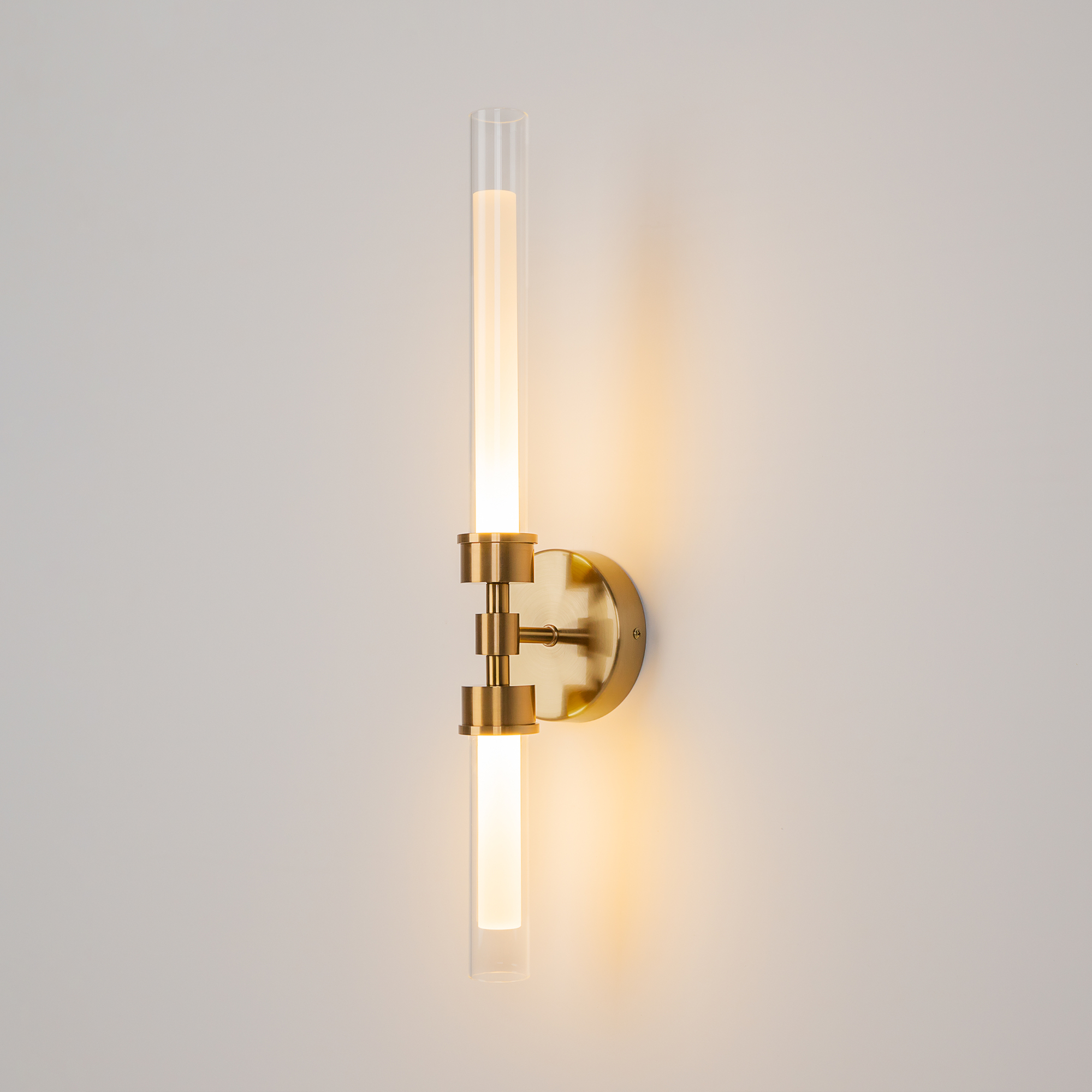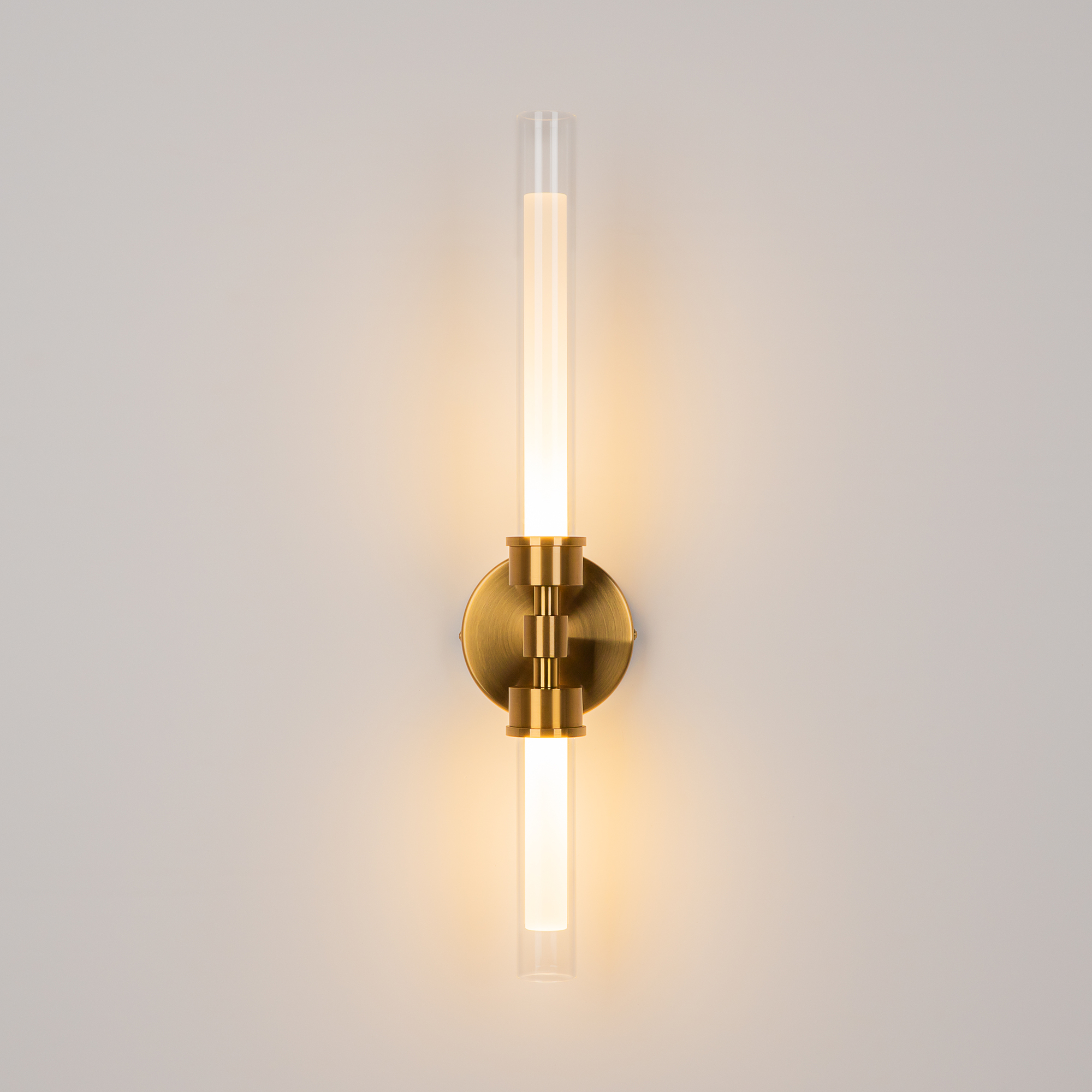 Арматура из металла в двух оттенках: черный и латунь. Плафон – прозрачная стек лянная трубка. LED-источники света с цветовой температурой 3000К. Простые геометричные формы.