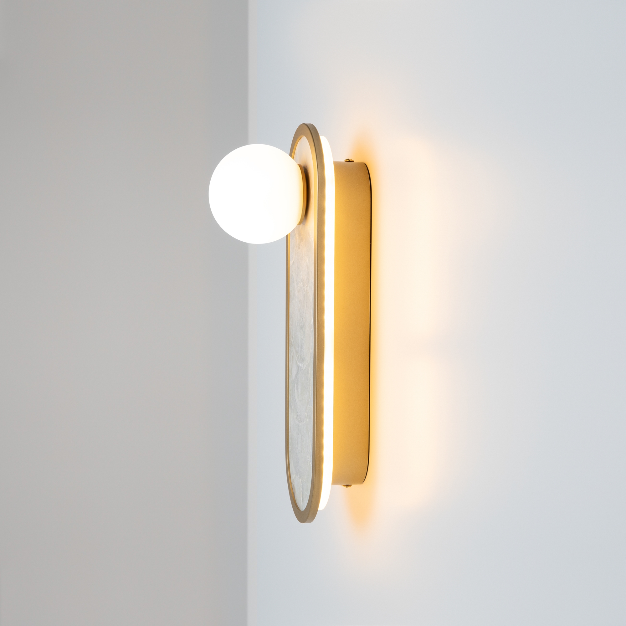 В серии представлены настенные светильники двух размеров и двух поколений. Декоративная мозаика из натурального перламутра играет нежнейшими бликами. Контраст текстур — переливы перламутра и матовая поверхность металла цвета латуни. LED-лента под акриловым рассеивателем создаёт ореол на стене. Предусмотрено трехступенчатое переключение температуры света через вкл-выкл (2700-3000-4000K), позволяющее создавать желаемую атмосферу. Эффектно светильники смотрятся и в комбинации друг с другом.
