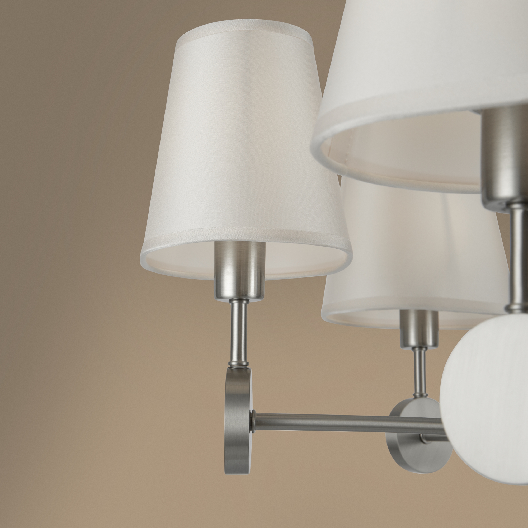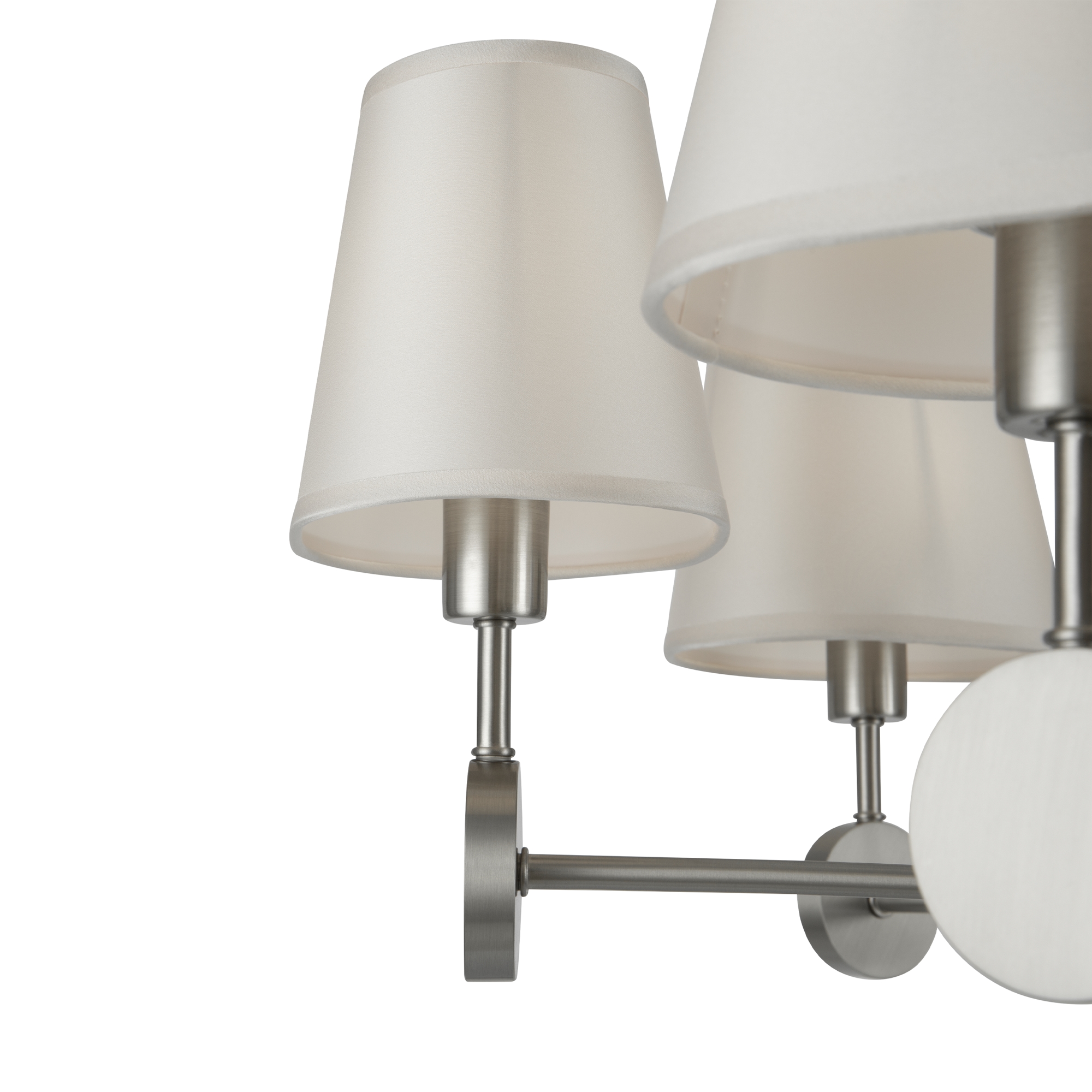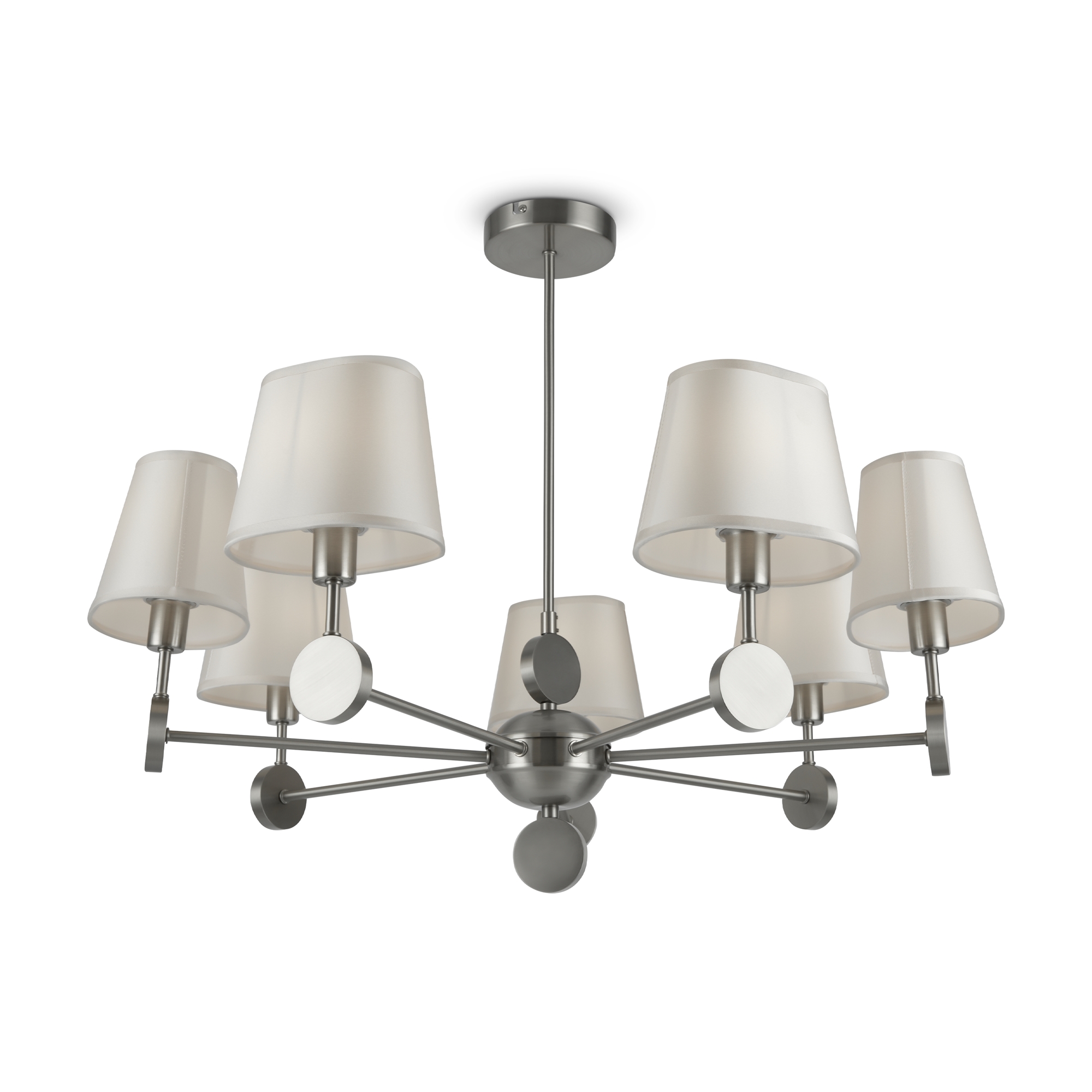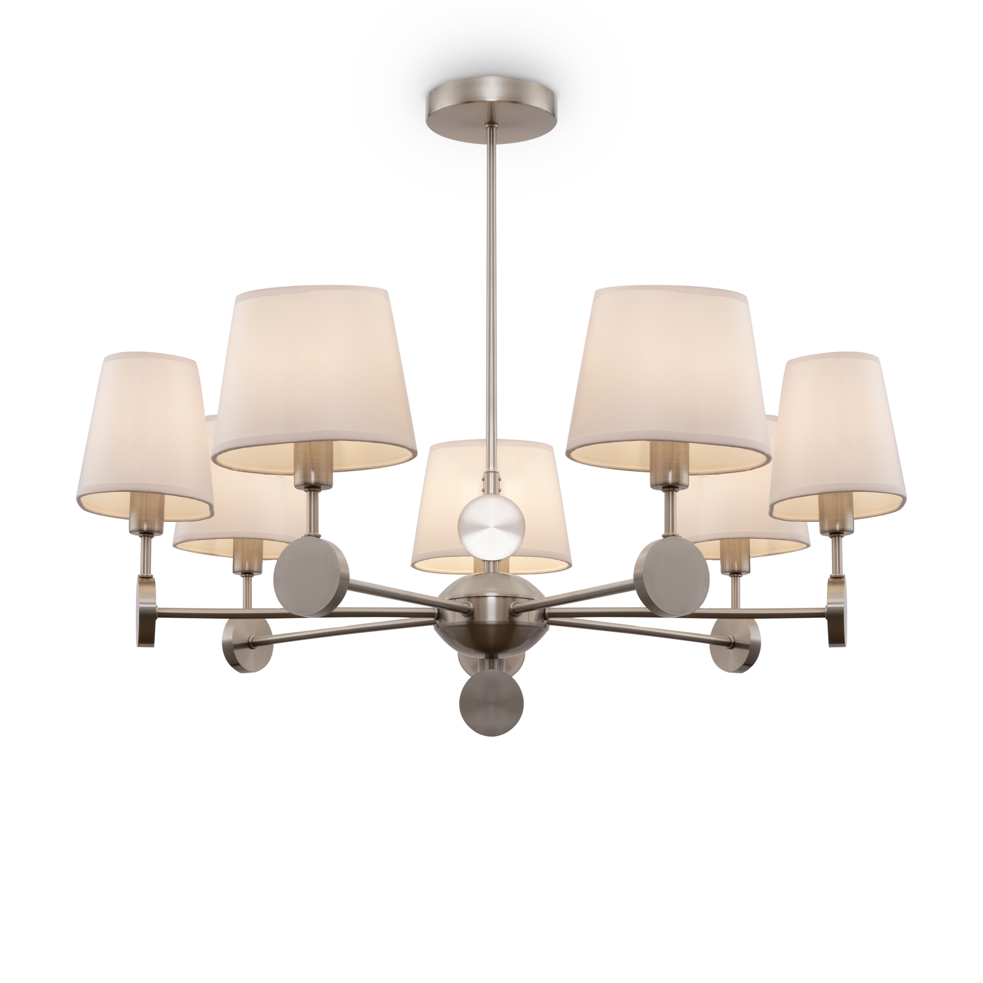 Металлическая арматура. Цвет – никель. Сатиновые абажуры оригинальной формы. Актуальное сочетание геометричных линий и округлых силуэтов. Одиночный подвес с цоколем Е27, лампа, бра и люстры – Е14.