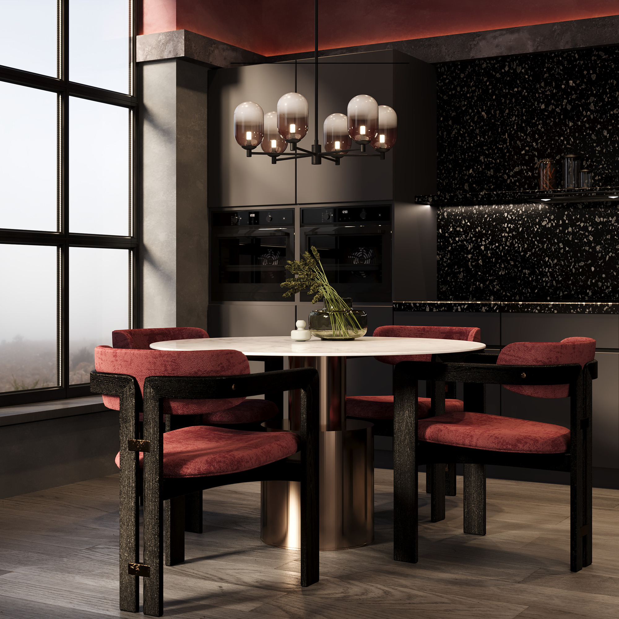 Арматура из металла матового черного цвета. Плафон из стекла с окрасом растяжка. Цвет дымчатый. Модификация — настенные, потолочные и настольные светильники. Источник света — лампа. Цоколь G9.