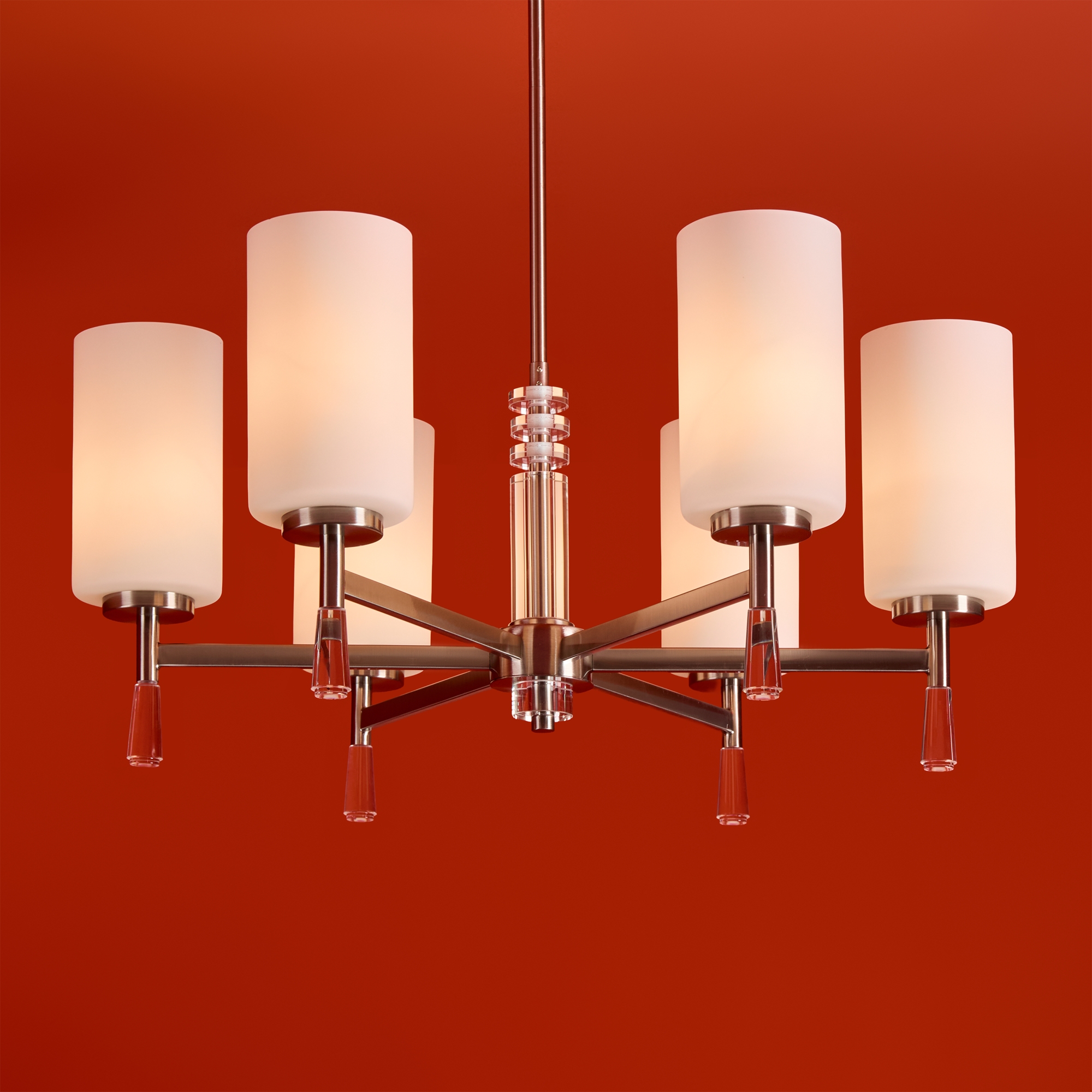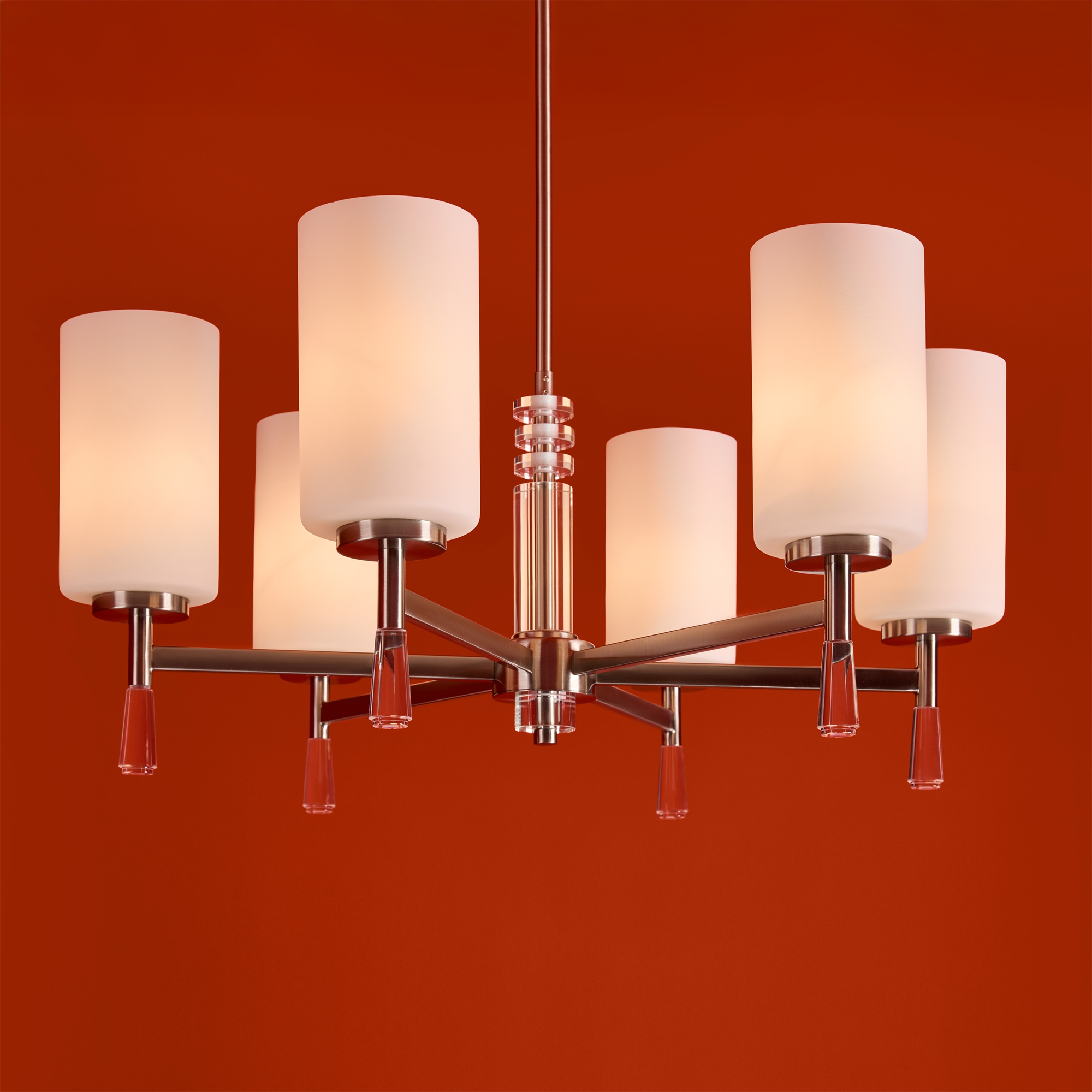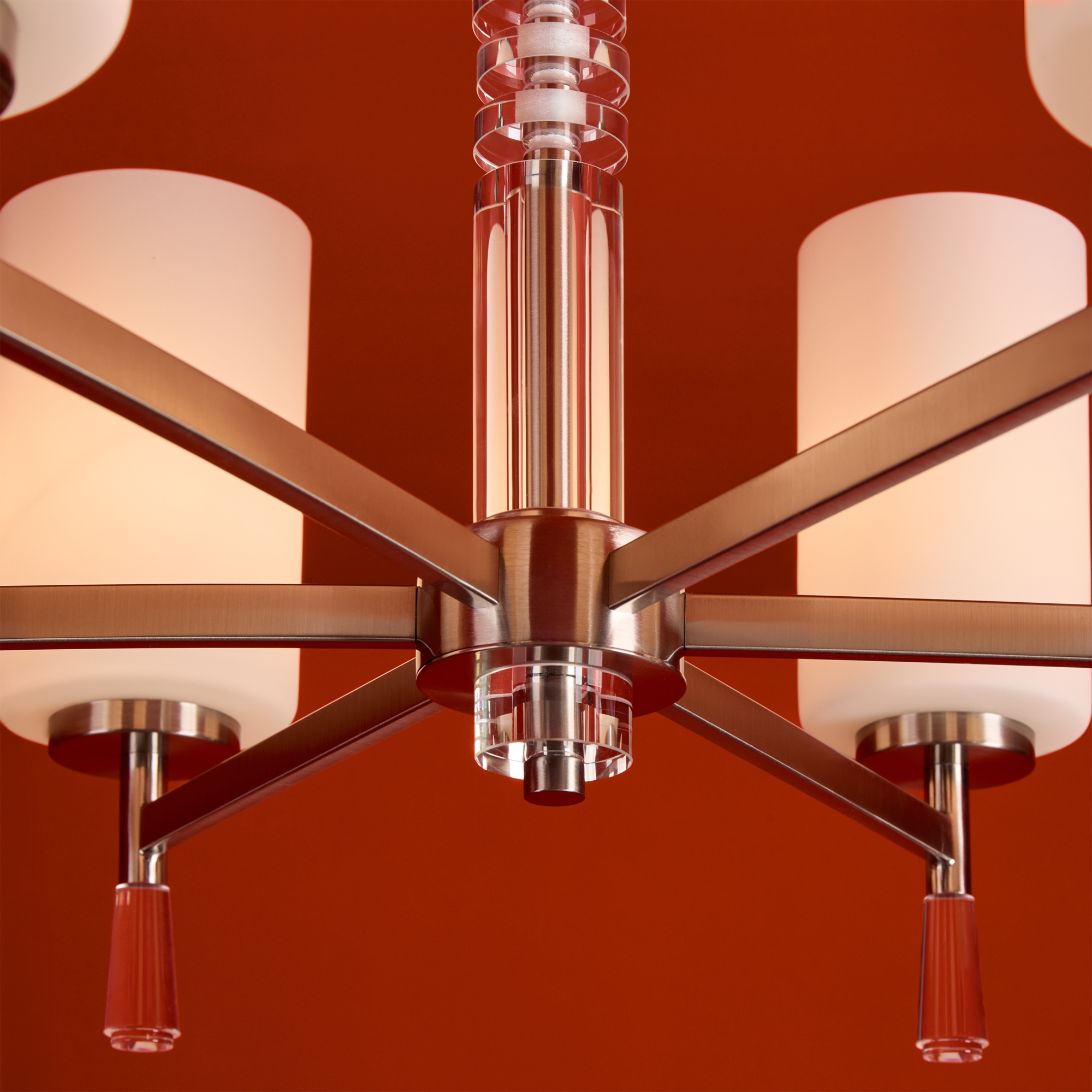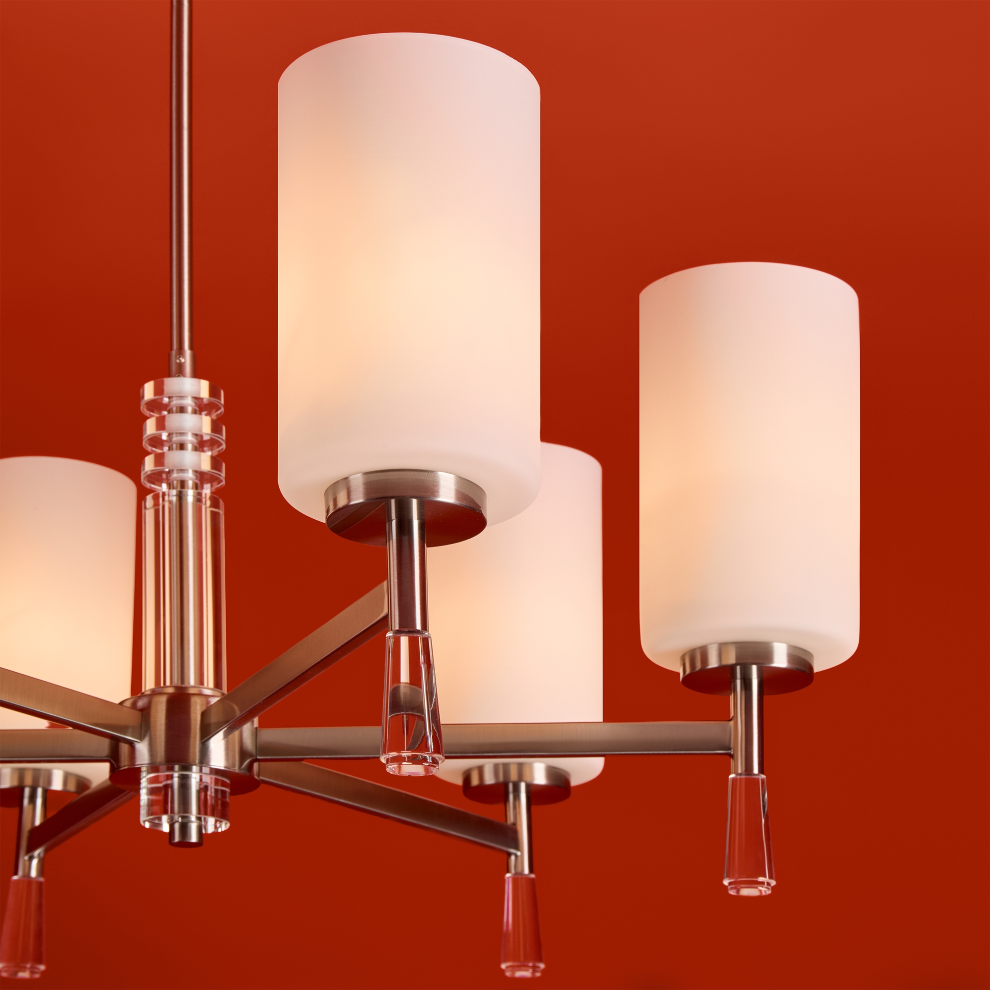 Металлическая арматура: латунь или никель (новинка серии).Белые стеклянные плафоны цилиндрической формы, направленные вверх.. Хрустальное основание с акриловыми каплями. Лампа E27.