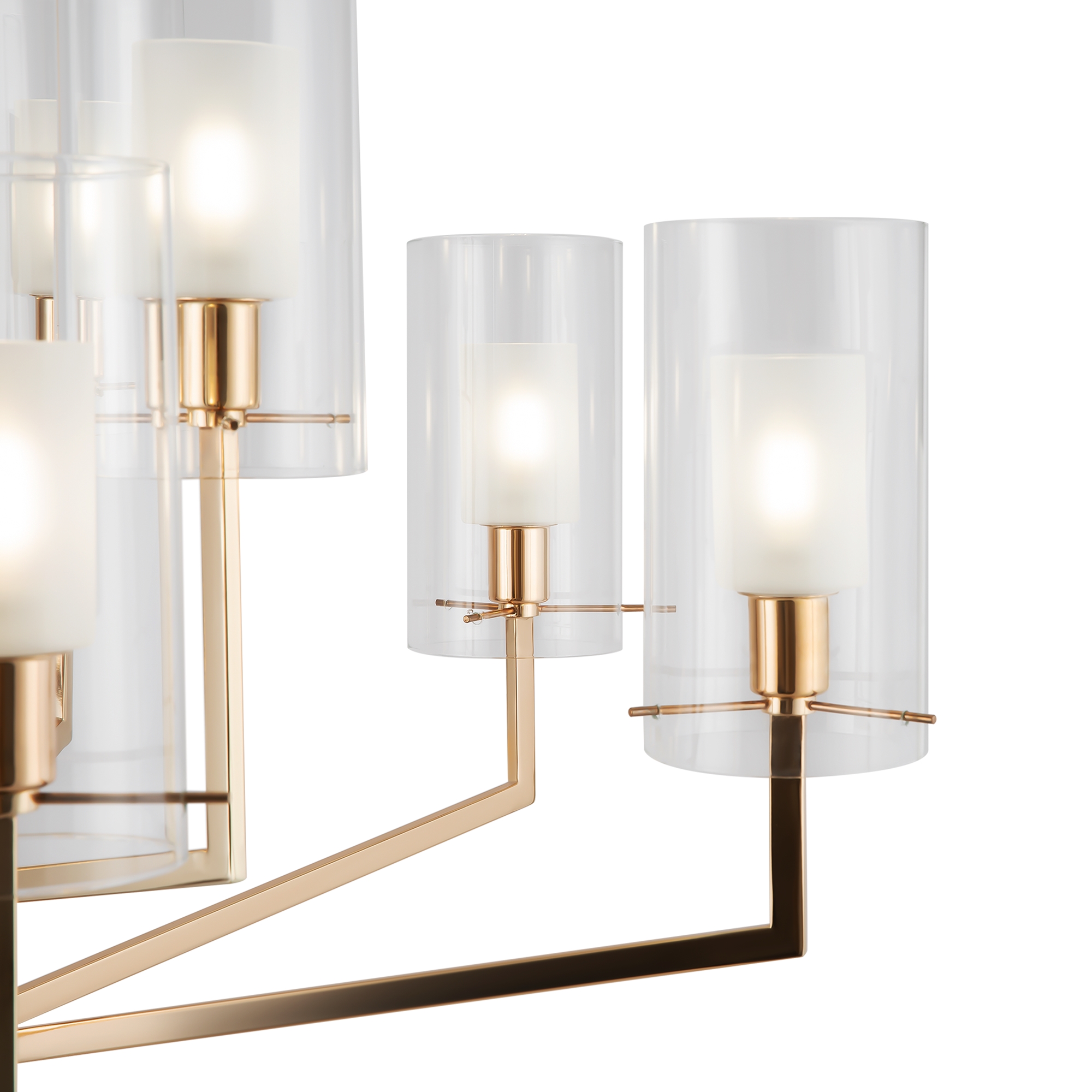 Металлическая арматура оттенка французского золота. Двойные стеклянные плафоны: матовые внутри, прозрачные снаружи. Лаконичная геометрия с симметричным расположением элементов. Источник света – лампа с цоколем E14.