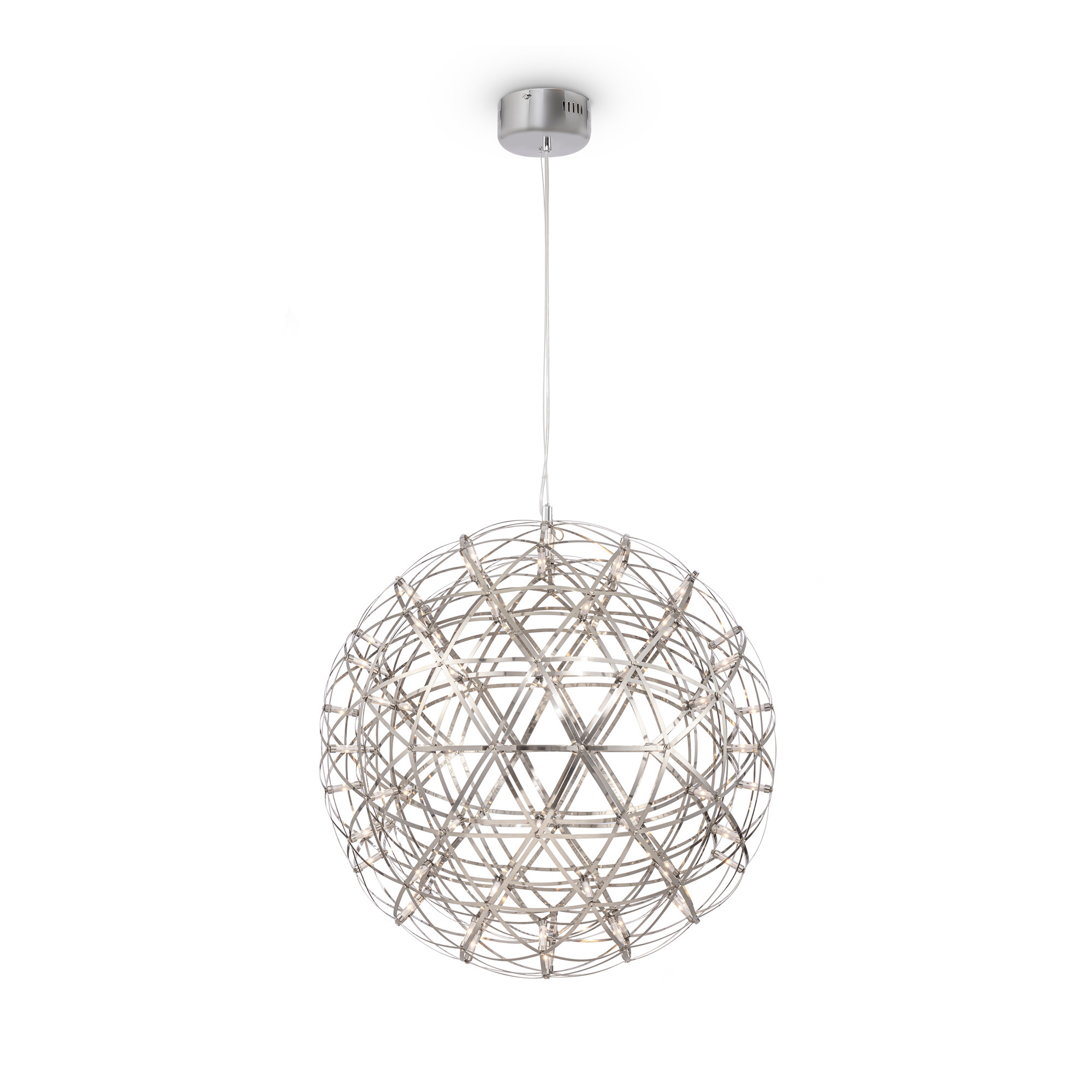 Серия Amber представляет воздушные светильники-сферы, выполненные в трендовом стиле хай-тек. Хромированная металлическая арматура и плафон, сотканный из переплетающихся лент, создают запоминающийся современный образ. Встроенные светодиоды экономят электроэнергию и красиво подсвечивают сферу. В выключенном состоянии светильник выглядит как абстрактное произведение искусства и является полноправной частью декоративного ансамбля интерьера. Серию составляют подвесы различного диаметра – их можно использовать по отдельности, а можно комбинировать в группы. Для обстановки в стиле хай-тек, минимализм, лофт, помещений кафе и ресторанов светильник станет идеальным решением.