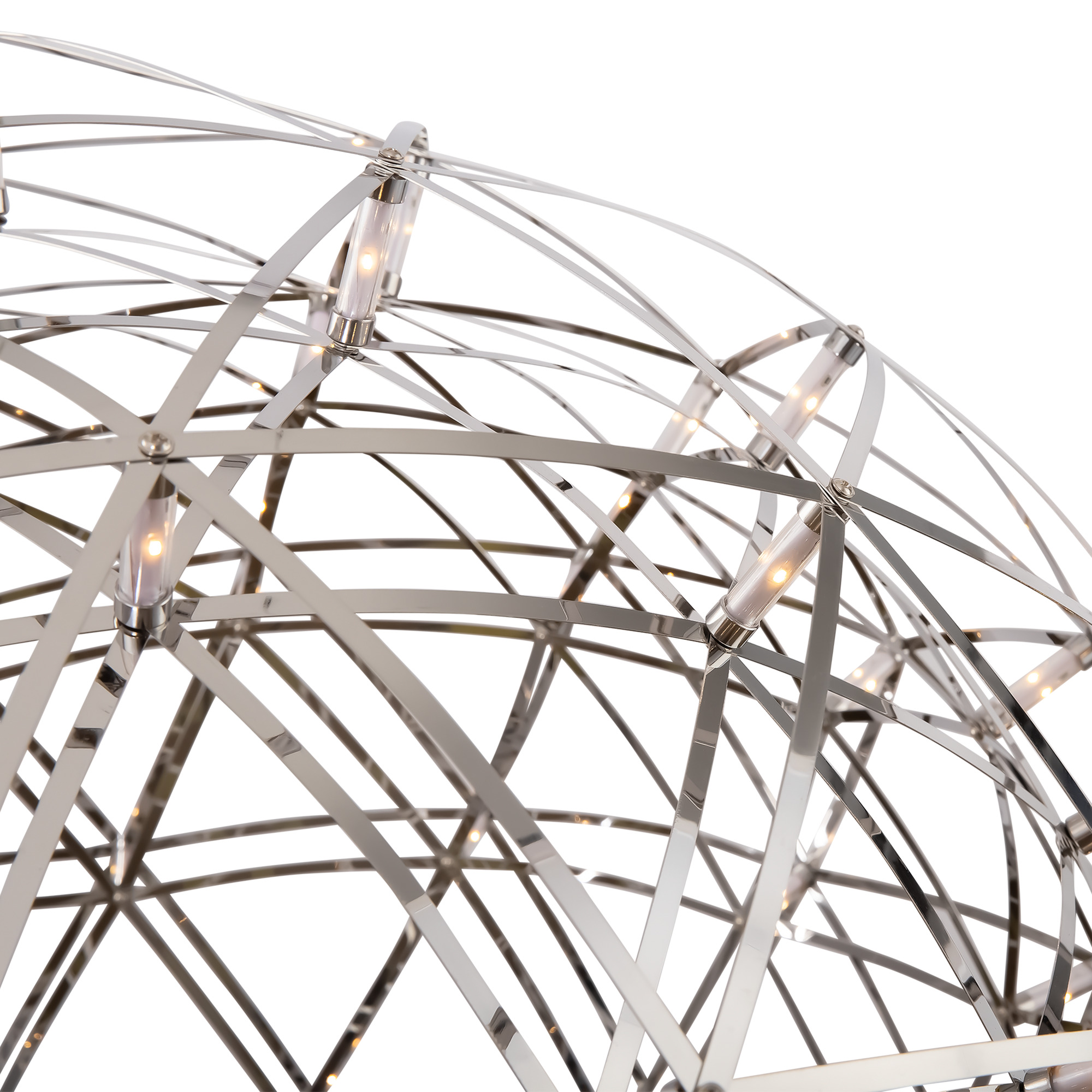 Серия Amber представляет воздушные светильники-сферы, выполненные в трендовом стиле хай-тек. Хромированная металлическая арматура и плафон, сотканный из переплетающихся лент, создают запоминающийся современный образ. Встроенные светодиоды экономят электроэнергию и красиво подсвечивают сферу. В выключенном состоянии светильник выглядит как абстрактное произведение искусства и является полноправной частью декоративного ансамбля интерьера. Серию составляют подвесы различного диаметра – их можно использовать по отдельности, а можно комбинировать в группы. Для обстановки в стиле хай-тек, минимализм, лофт, помещений кафе и ресторанов светильник станет идеальным решением.