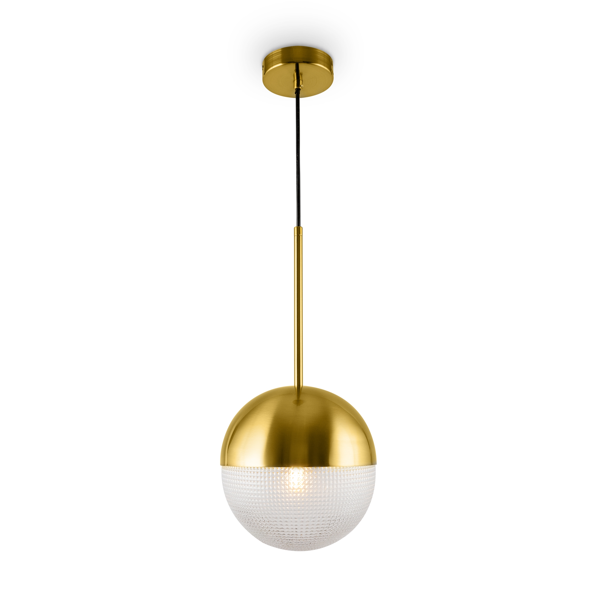 Металлическая арматура оттенка латуни. Плафон – прозрачное фактурное стекло. Трендовая сферическая форма. Источник света – лампа с цоколем E27.