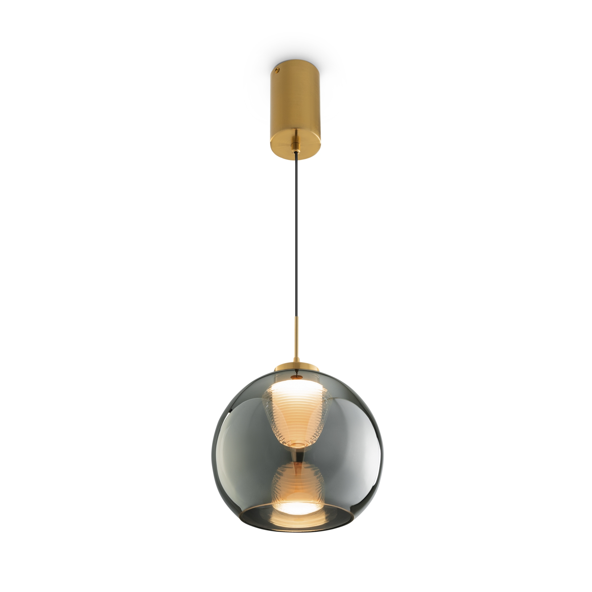 Арматура — металл, цвет — латунь. Плафоны из прозрачного стекла с дымчатым оттенком в форме овала, круга или конуса. Универсальный минималистичный дизайн позволяет составлять комбинации из нескольких подвесов. Регулируемая высота. Тренд «invisible light» - LED-источник света утоплен в основание плафона. Цветовая температура - 3000К.