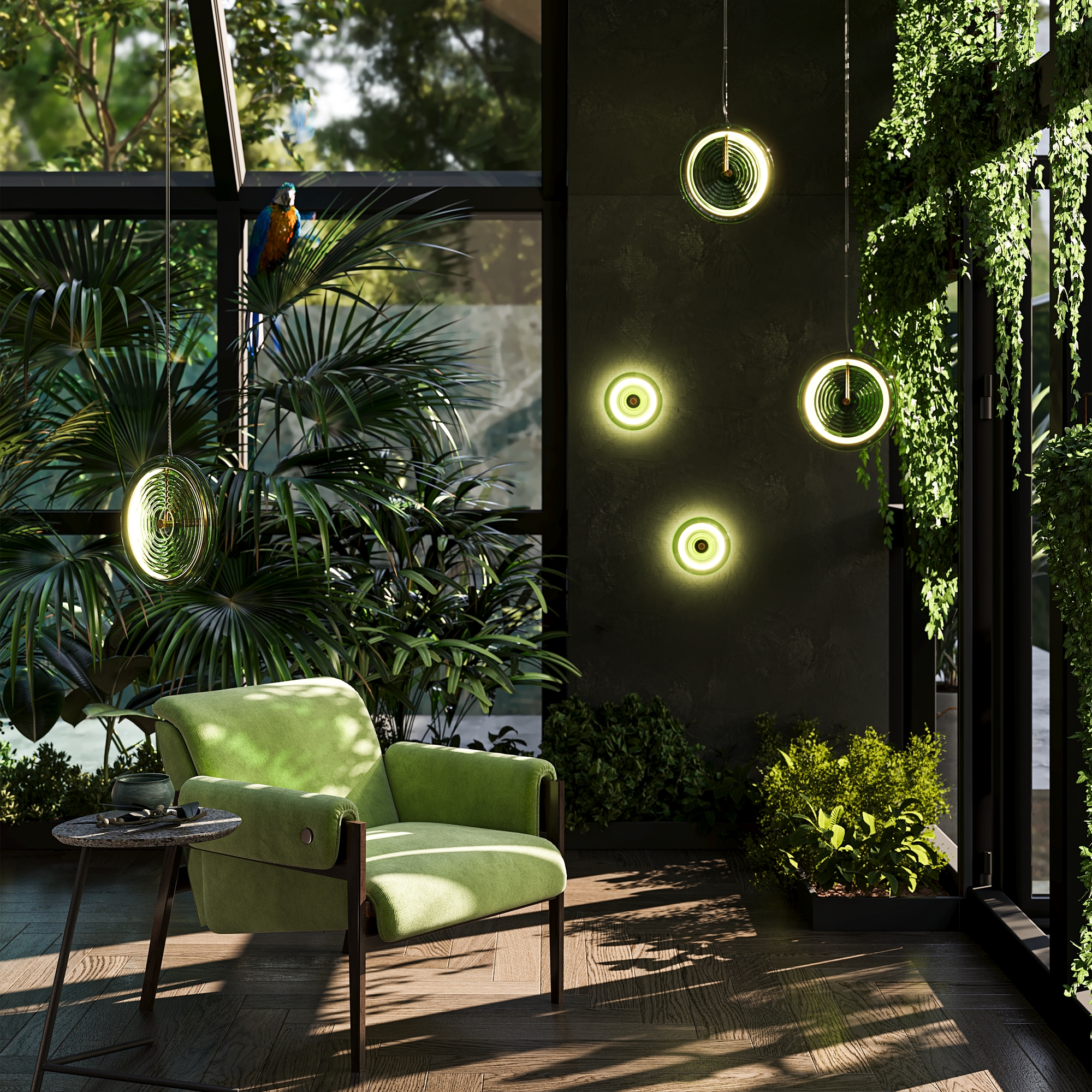 Арматура - металл. Цвет арматуры латунь. Плафоны из стекла в форме леденцов выполнены в четырех цветах: серый, зеленый, прозрачный и желто-оранжевый. Широкий спектр типов светильников: торшеры, настенные бра и подвесы. LED источник света. Цветовая температура 3000К.