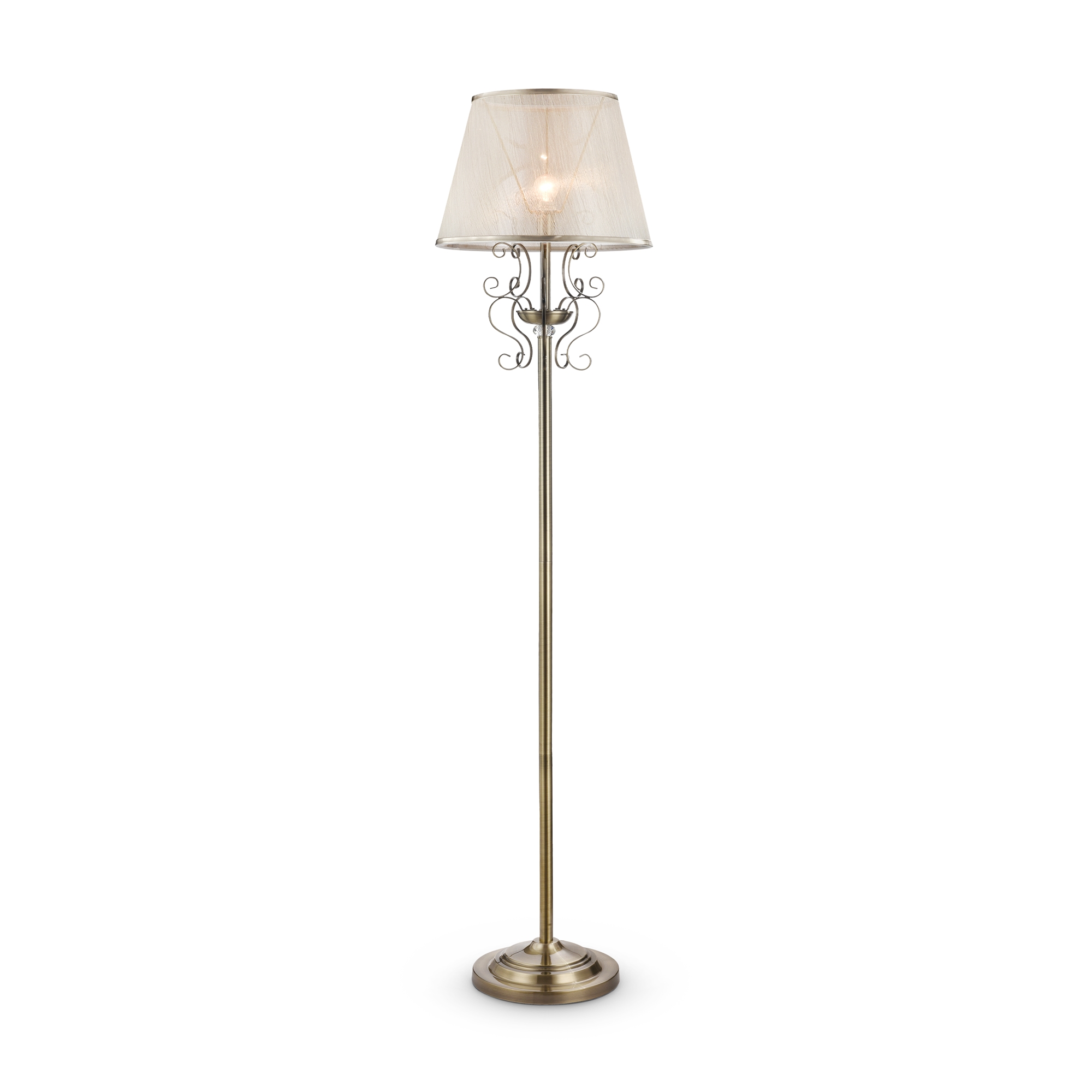 Серия из металла цвета античной бронзы. Арматура светильников Driana дополнена завитками на рожках и узогнутым декором в центральной части. Абажуры из полупрозрачной органзы выполнены в виде колокольчиков и обрамлены ободками из металла.