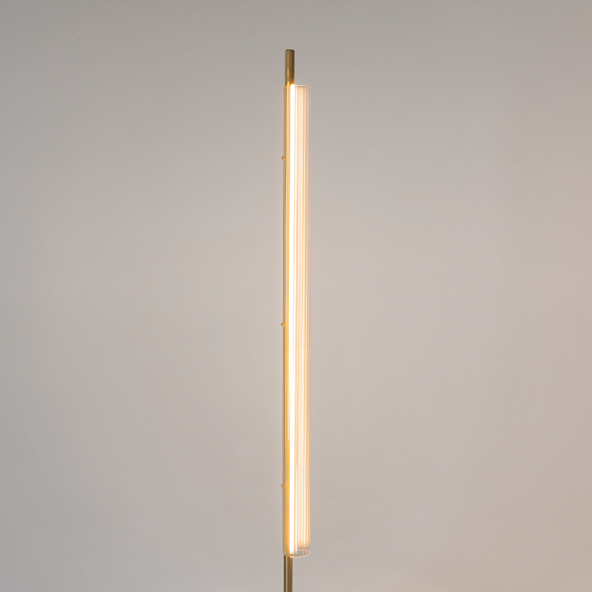 Арматура из металла, цвет - латунь с сатиновым финишем. Плафон из рифленого прозрачного стекла. LED-источник света. Теплая цветовая температура 3000К. Регулируемый по длине провод 3 метра у подвесного светильника. Подходит для помещений с высокими потолками. Торшер с push-кнопкой на проводе для удобного включения и выключения.